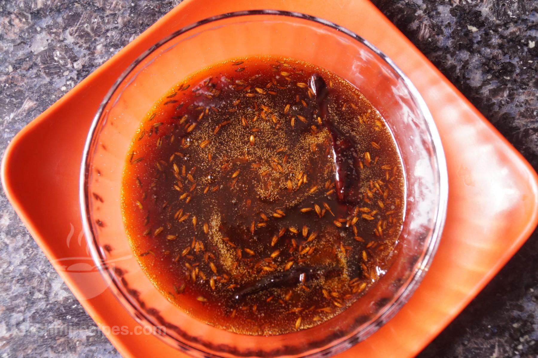 (Tips: 1. Do not blacken the cumin seeds (jeera) and whole red chilli (khadi lal mirch) when added to the kadhai, sauté them till they turn brown; 2. Break the whole red chilli (khadi lal mirch) while adding them to sauté if you want to make the chutney more spicy; 3. The cooked chutney should be of thick consistency but should not solidify)