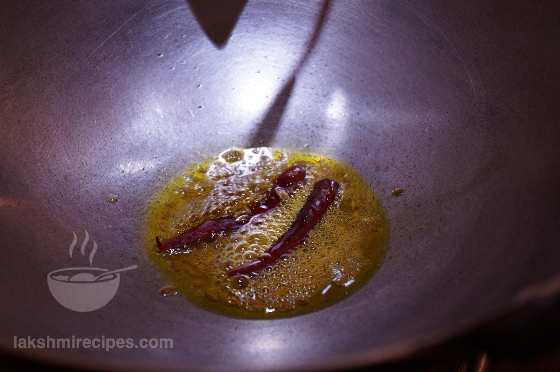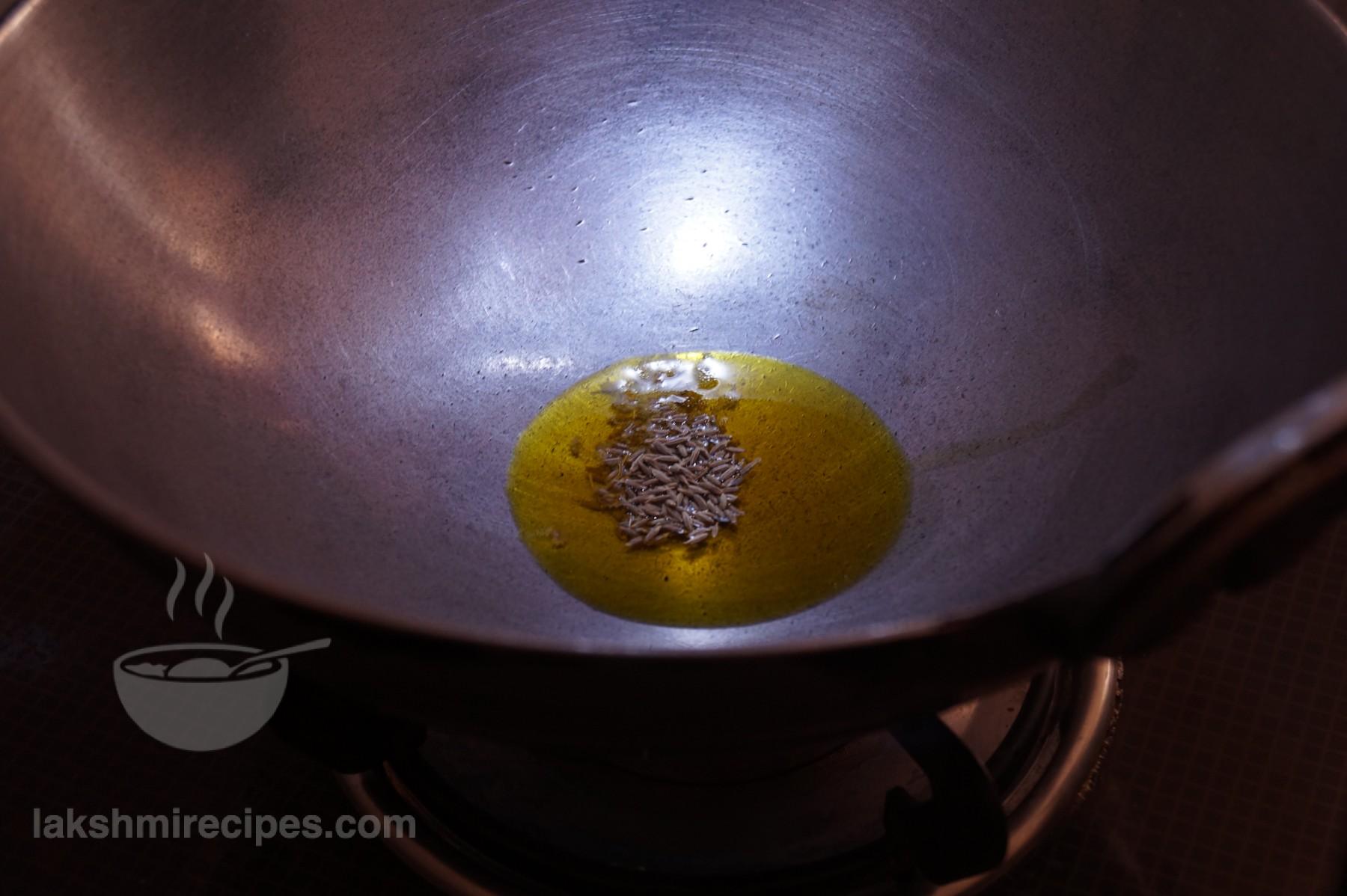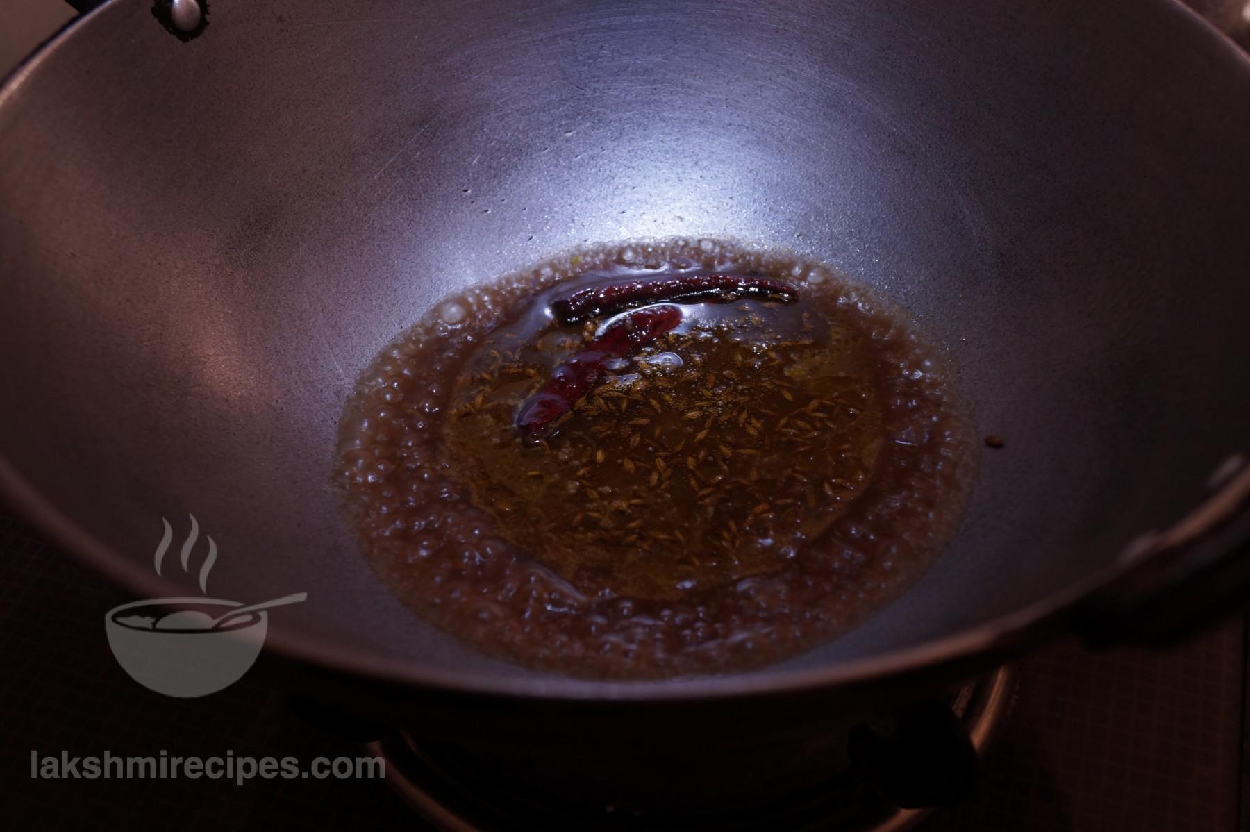 - In a pan or kadhai heat the oil. Add cumin seeds (jeera) and whole red chillis (khadi lal mirch). Let the cumin seeds (jeera) crackle.