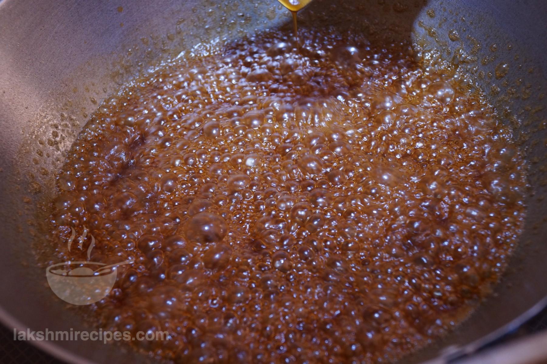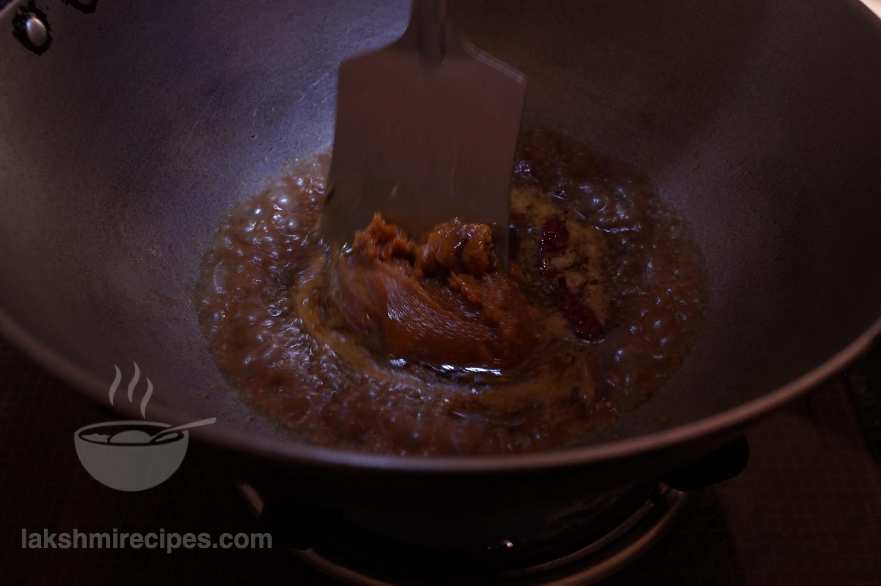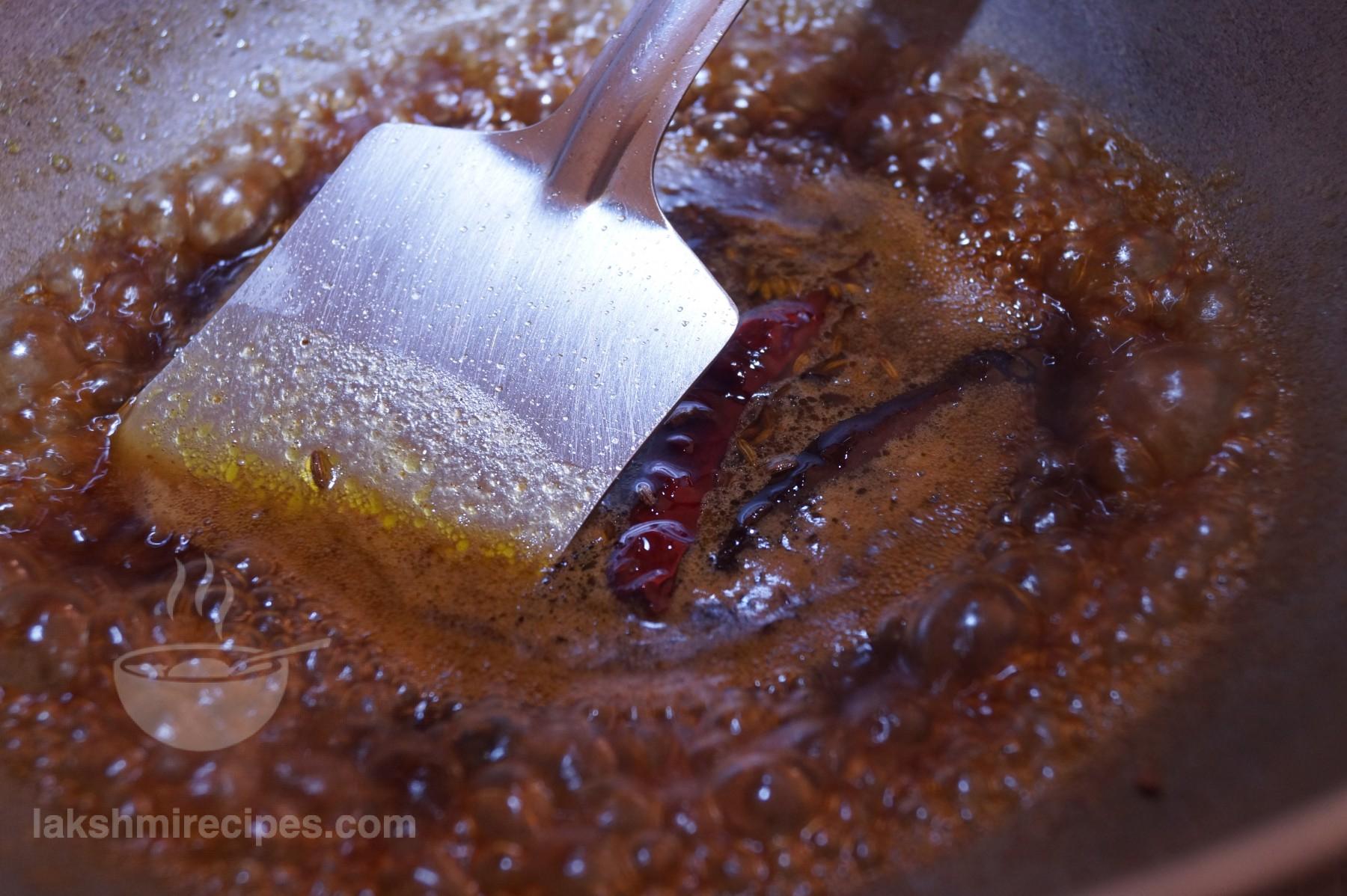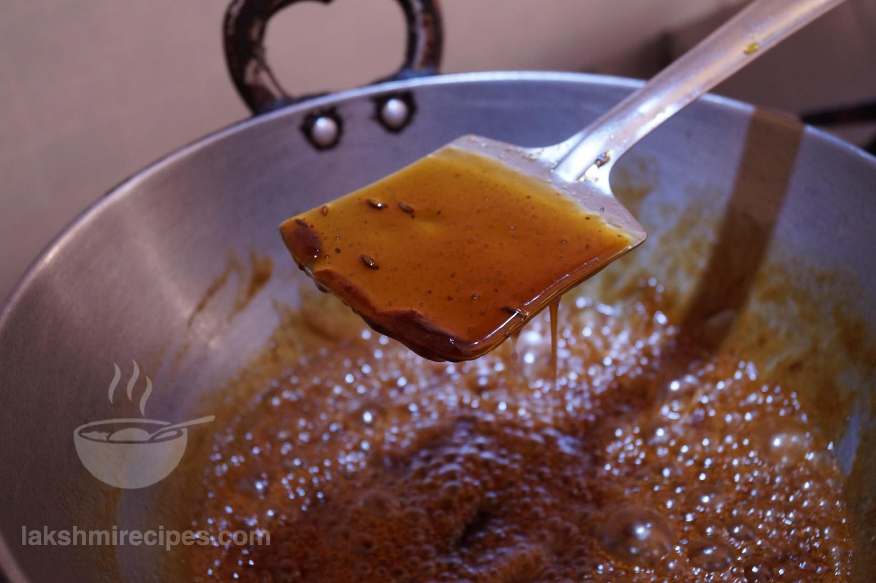 - Add the jaggery (gud) to the cooking mixture. Taste the mixture and enough jaggery (gud) to balance the sour taste of the tamarind (imli). Allow the mixture to boil and cook on low flame.