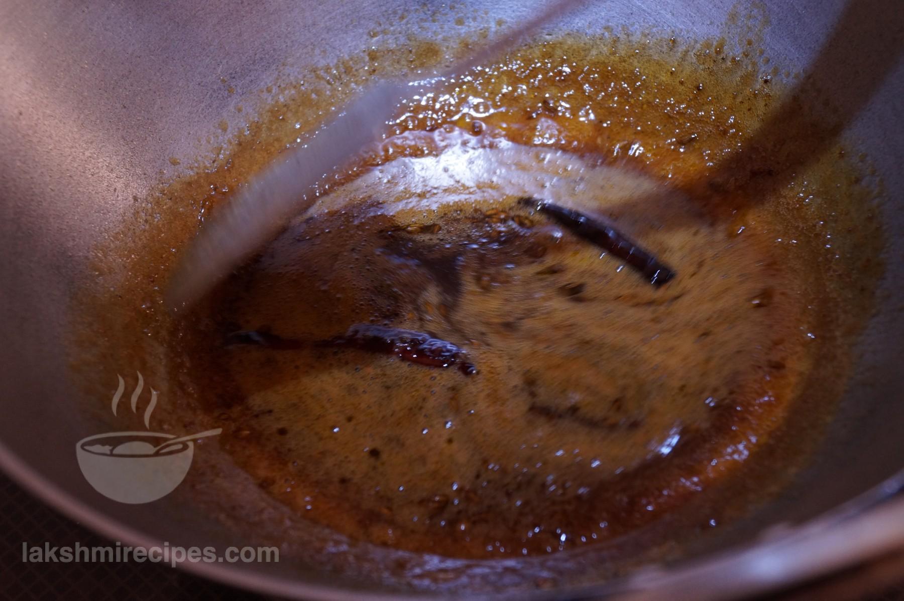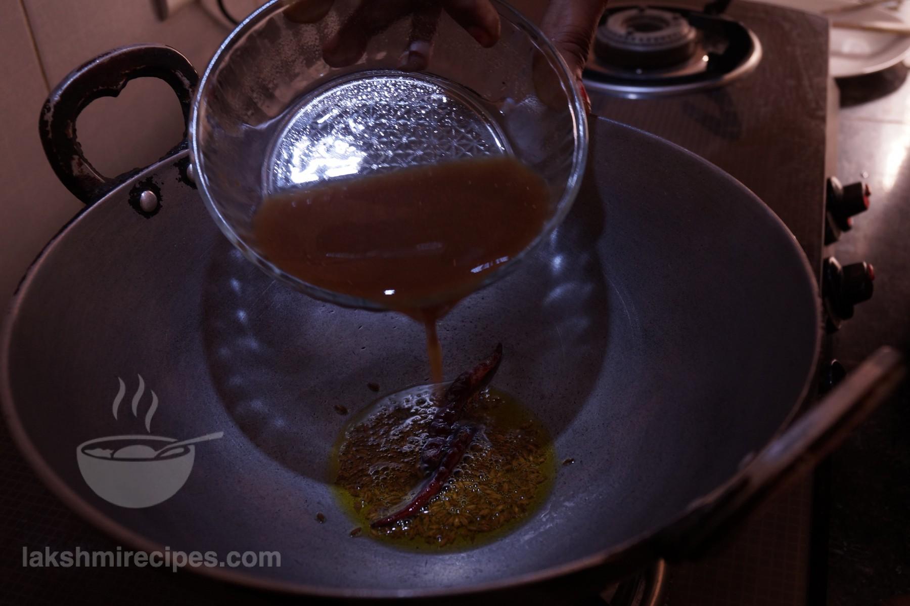 - Once the cumin seeds (jeera) and red chillis (khadi lal mirch) turn brown, pour in the tamarind (imli) mixture. Add salt to taste and mix well.