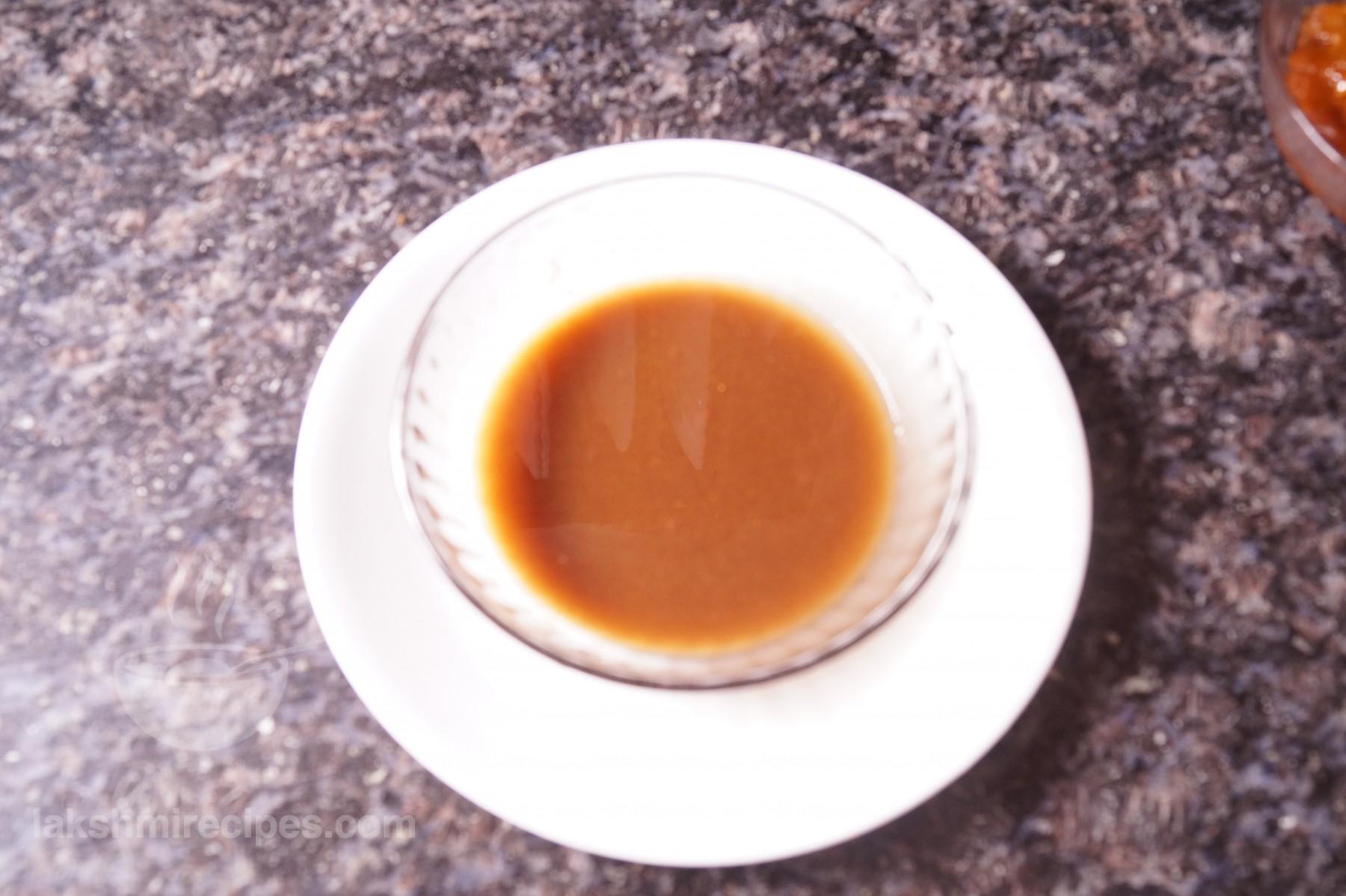 - Mash the soaked tamarind (imli) separating the seeds and peel from the flesh. Strain the mashed flesh portion using a colander or sieve into a separate vessel. Add a little water to it to form a mixture of thick consistency.