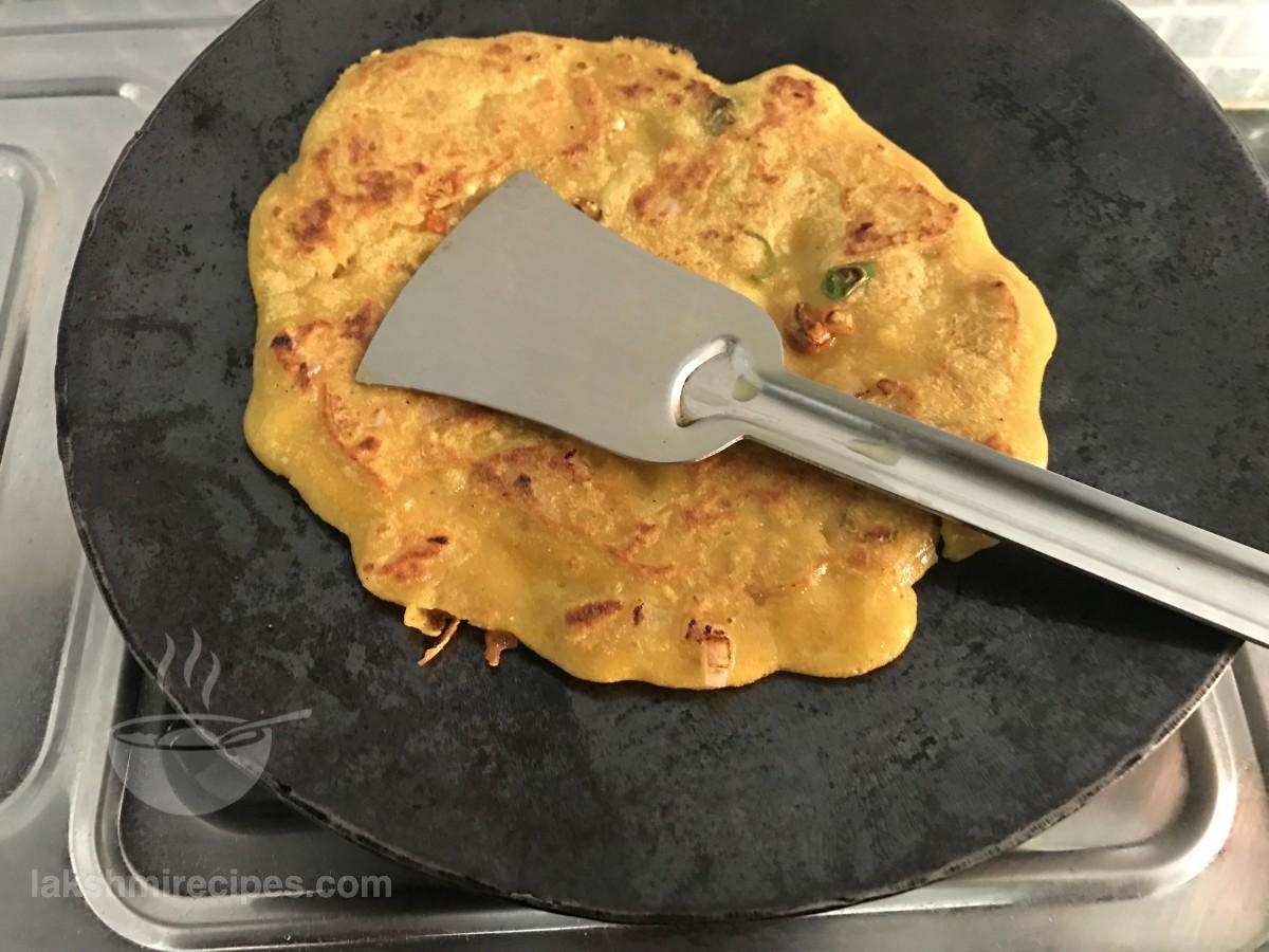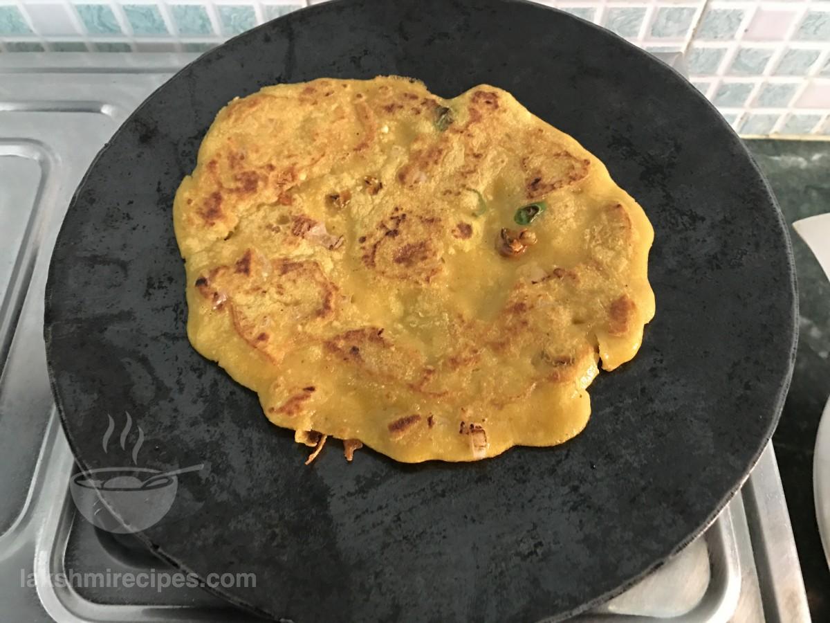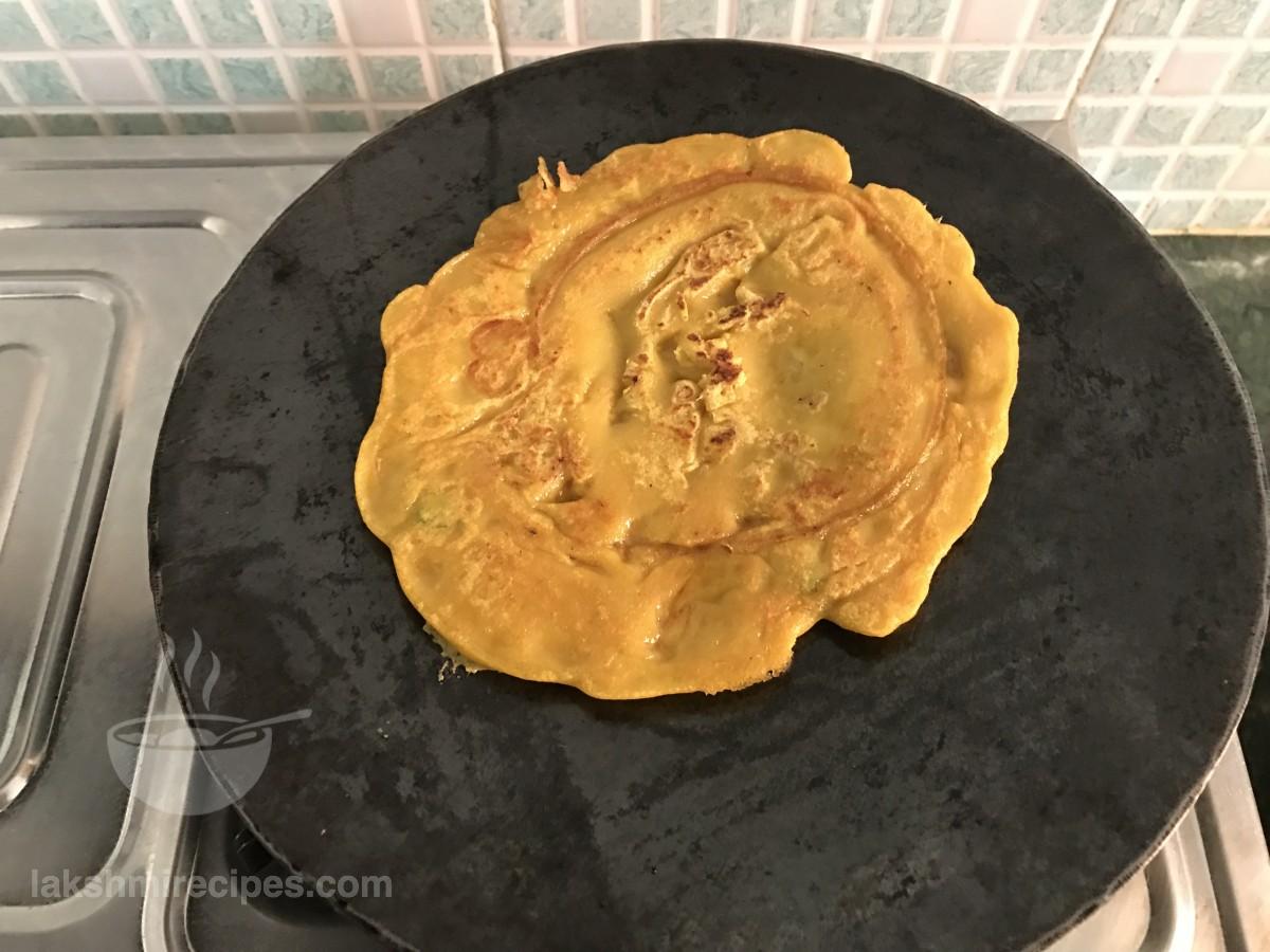 - When the base side is cooked and appears crispy red then flip the cooking chilla, to cook in the same manner on the other side.