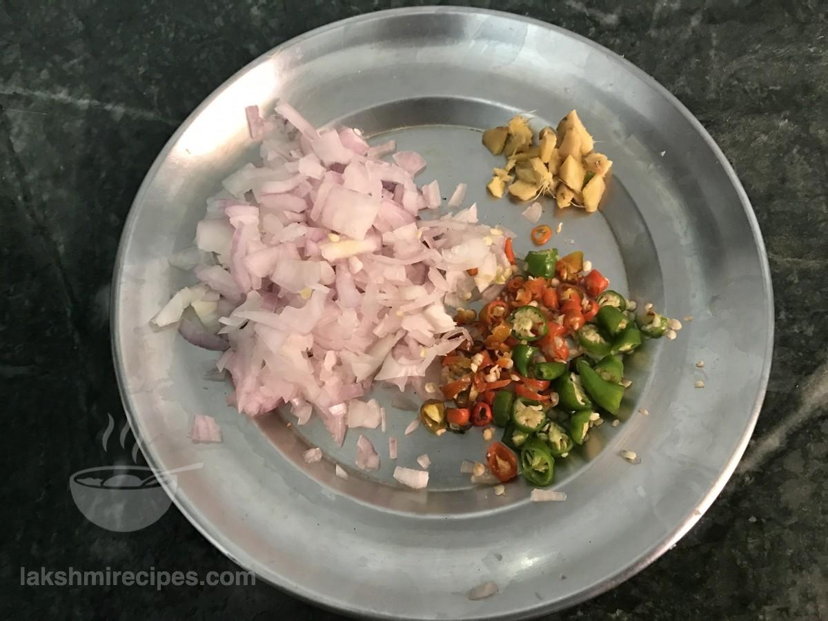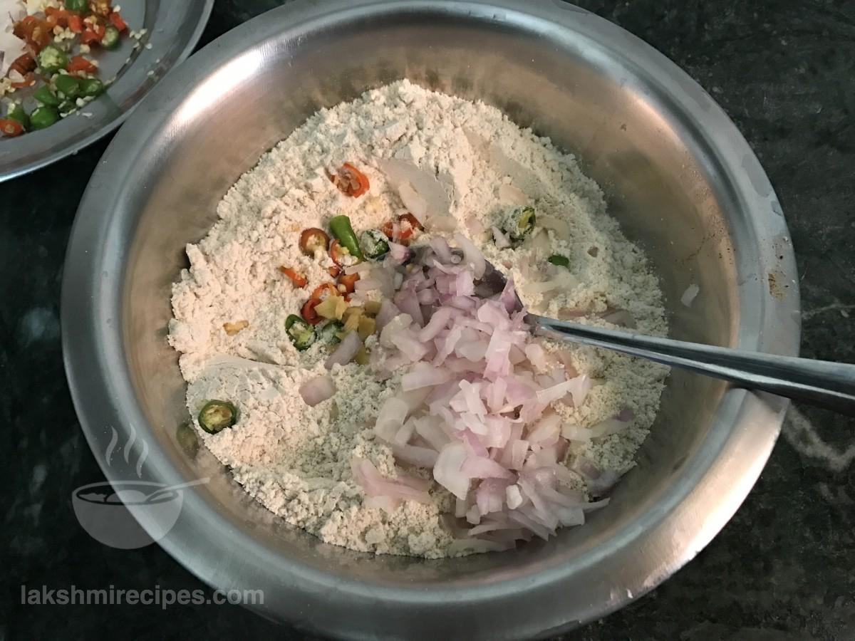 - Now add chopped onion, green chilli and ginger to the dry mixture and mix again.