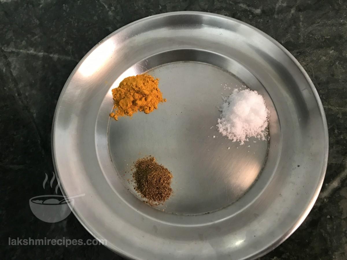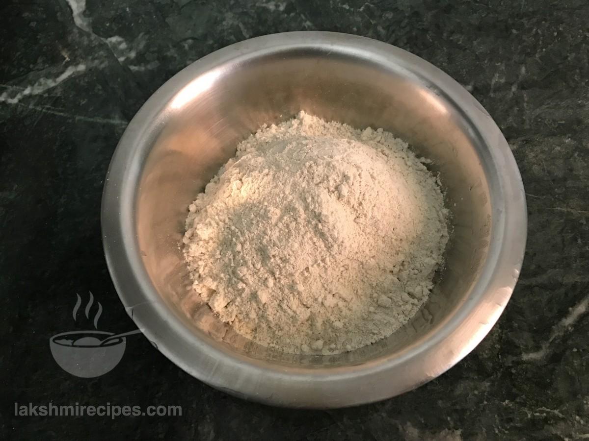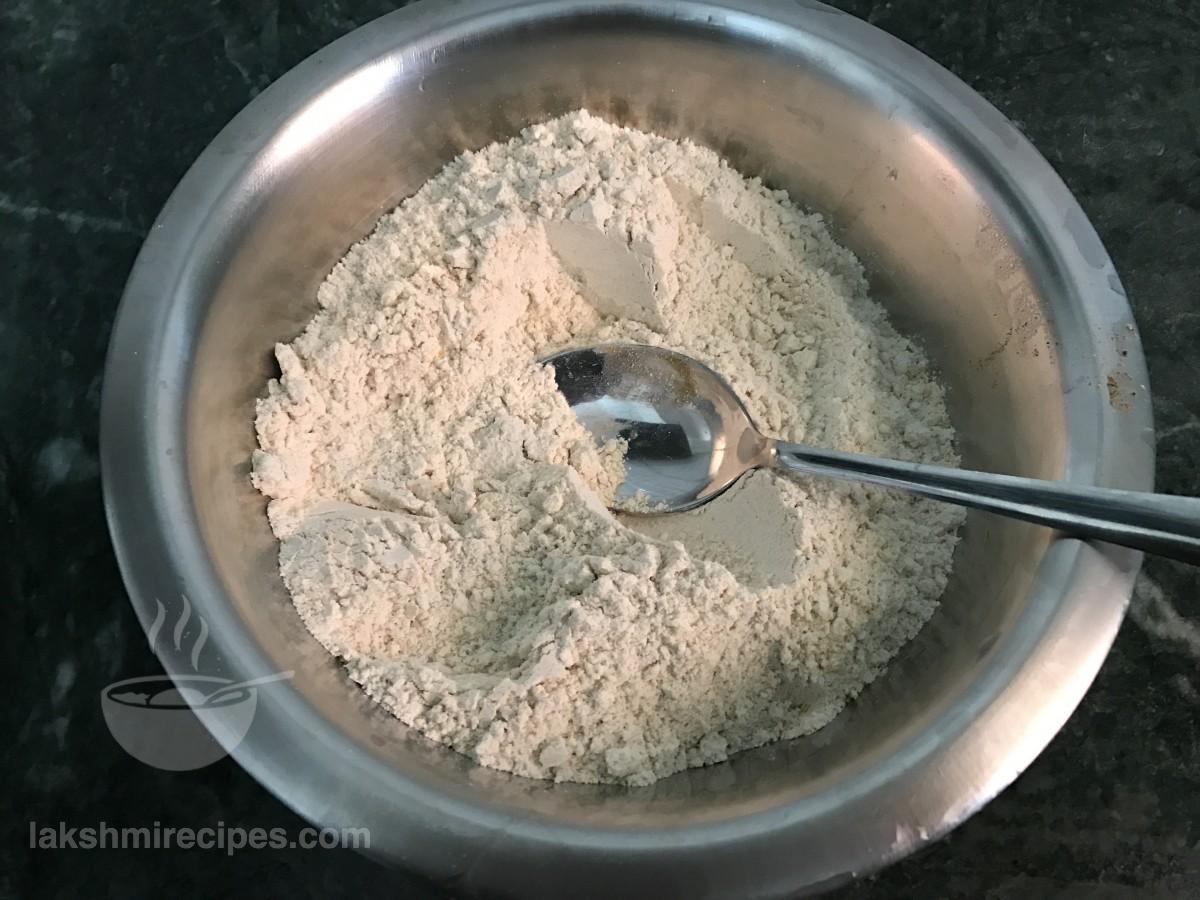 - Take whole wheat flour in a deep vessel and add turmeric powder, salt and cumin powder to it. Mix the dry ingredients together.