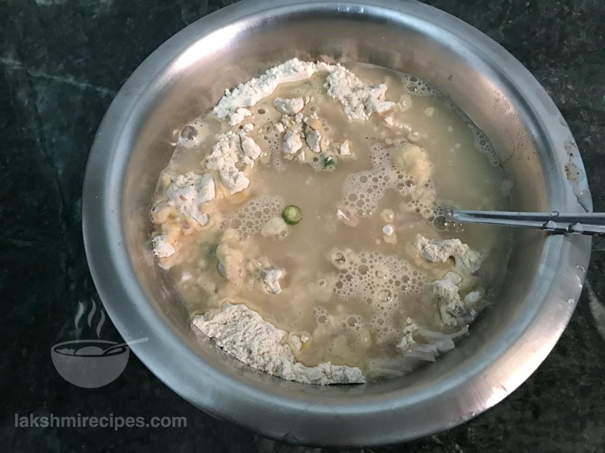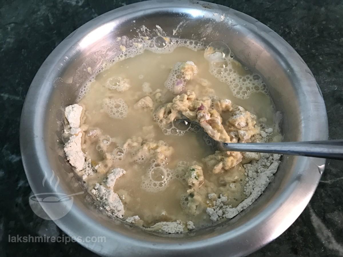 - फिर इस मिश्रण में धीरे-धीरे थोड़ा पानी डालें और मिलाकर एक म्ध्यम गाढ़ा घोल तैयार करें। याद रखें कि कोई गुठली नहीं बनें। पानी को धीरे-धीरे ही डालें। यह घोल न तो बहुत पतला और न ही बहुत गाढ़ा हो।