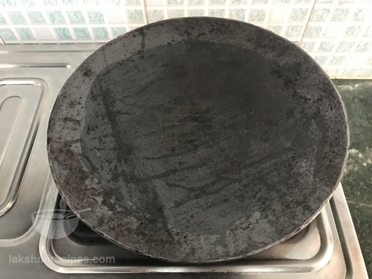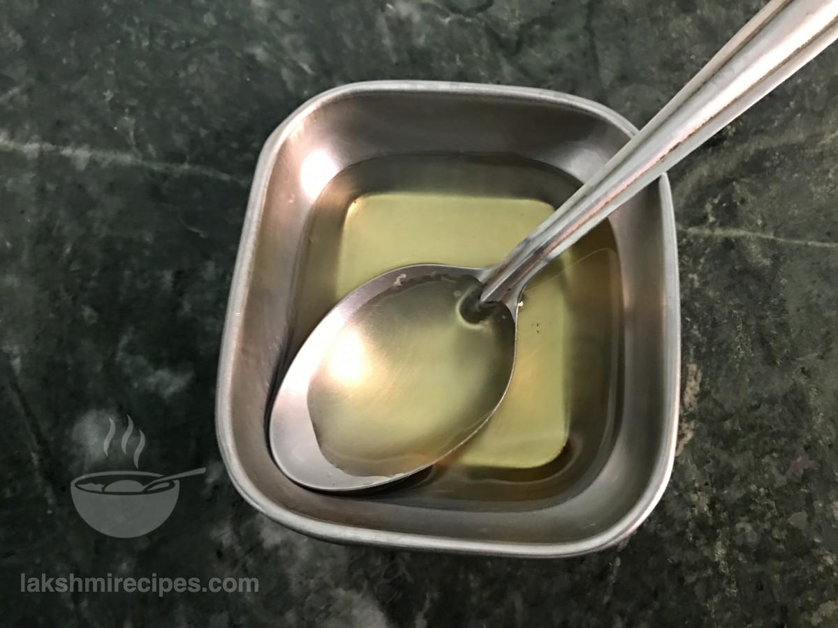 - Now heat a non-tick pan or a tawa. Pour 1 tea spoon refined oil over and spread to grease it.