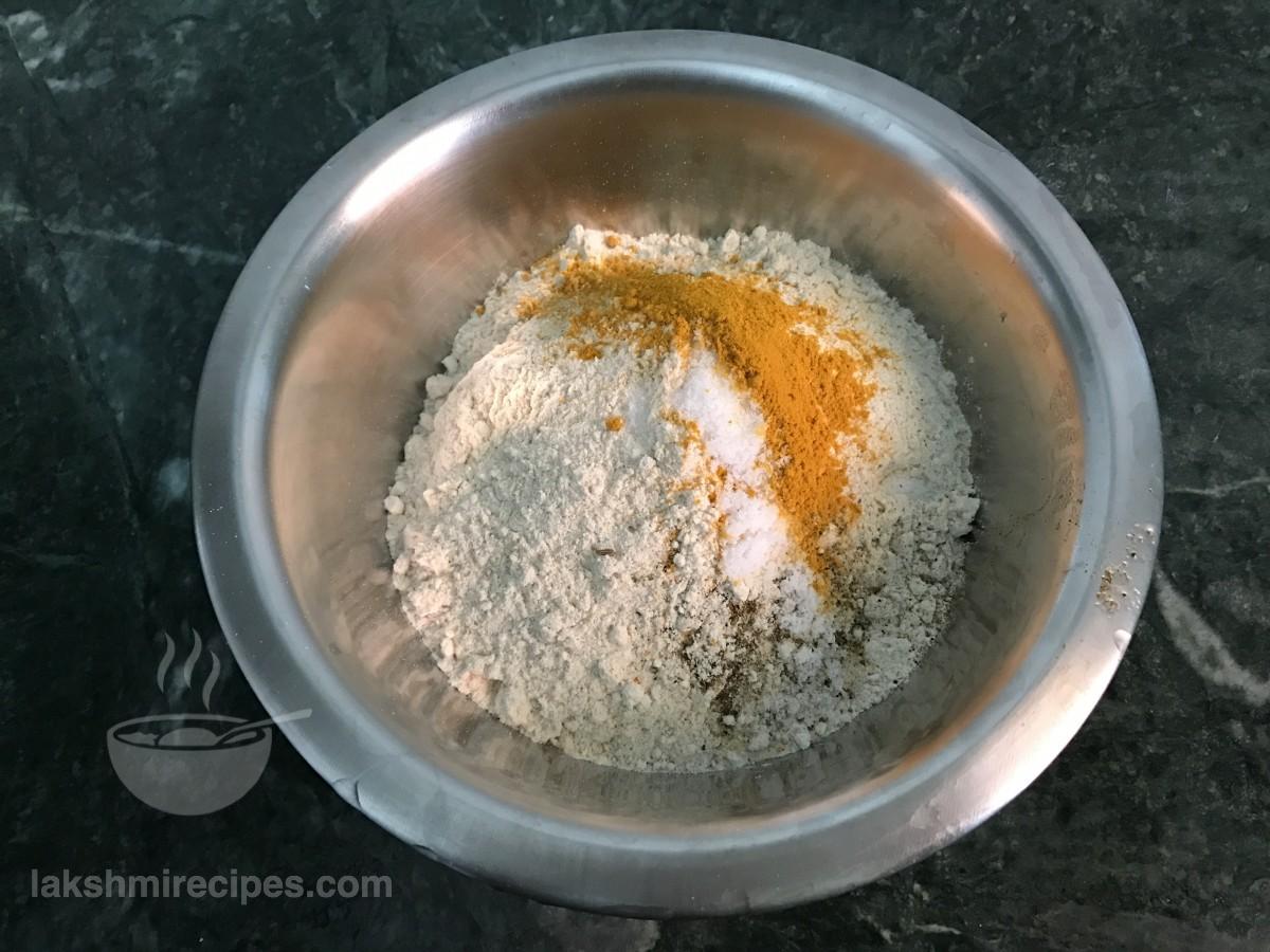 - एक गहरे बर्तन में गेहूं का आटा डालें और इसमें हल्दी पाउडर, नमक और जीरा पाउडर जोड़ें। सूखी सामग्री को एक साथ मिलाएं।