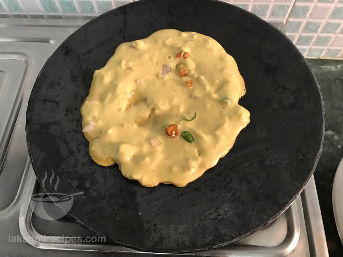 - फिर एक गोल कल्छी के उपयोग से थोड़ा घोल नॉन-स्टिक पैन पर डालें। इसे कल्छी के पिछले भाग से फैलाते हुए गोलाकार दें।