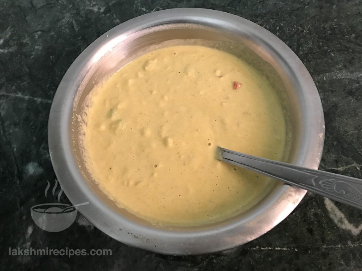 - Then add some water and mix to form a smooth batter. Remember that no lumps are formed. Add water slowly and keep mixing to for a batter with medium thick consistency. It should neither be very thivk nor watery but flowy enough to spread when poured on a flat surface.
