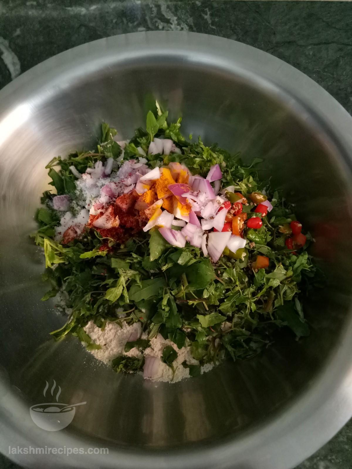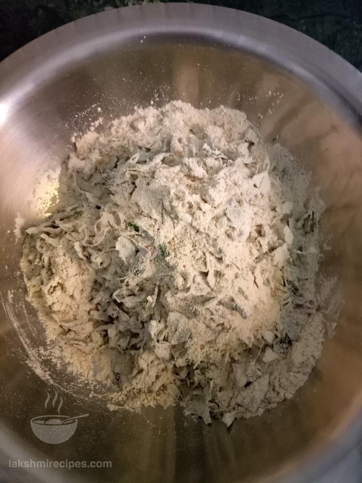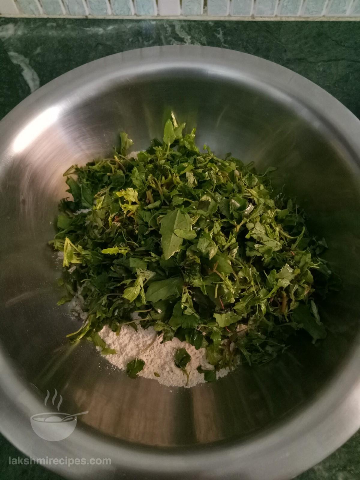 - Then take whole wheat flour in a deep vessel and add the finely chopped Chenopodium leaves or bathua ka saag to it.