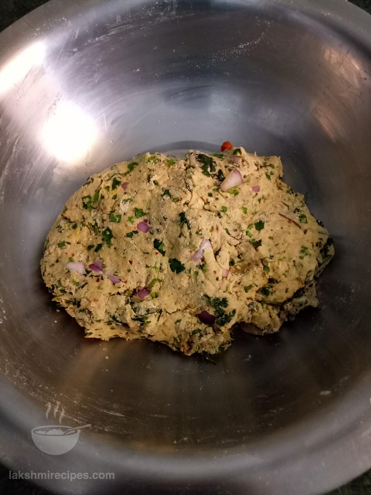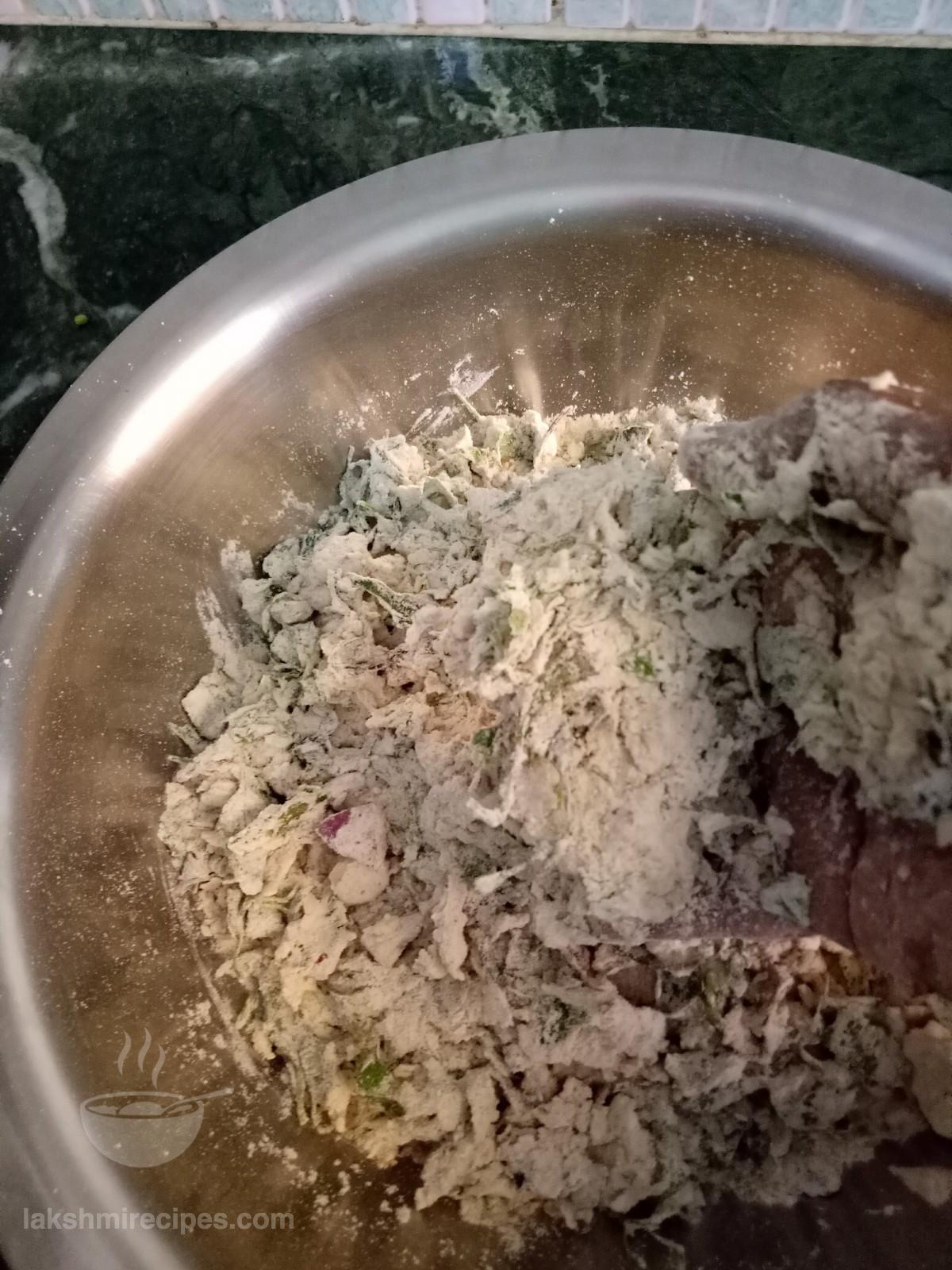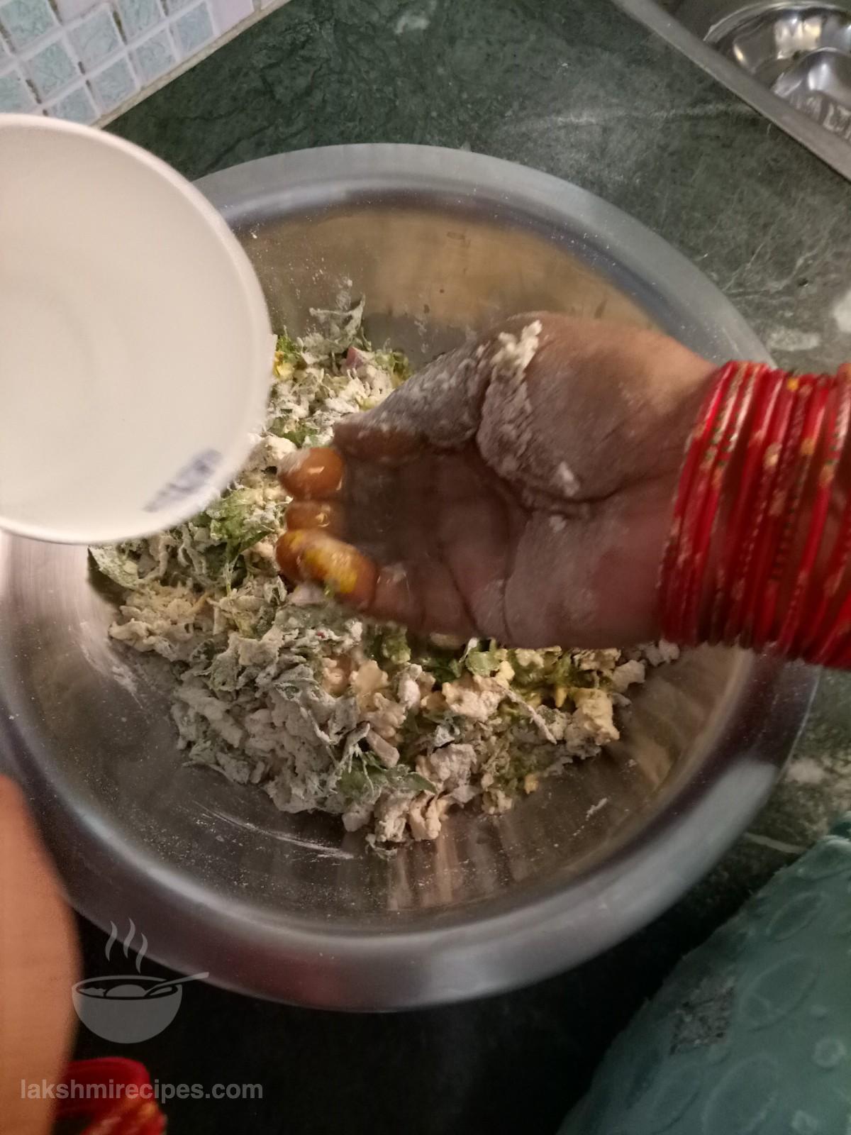 - Now slowly add water to this mixture of flour and Chenopodium leaves or bathua ka saag. Knead the ingredients together to form a medium hard dough. Cover this vessel with a lid and leave the dough to rest for 5 minutes.