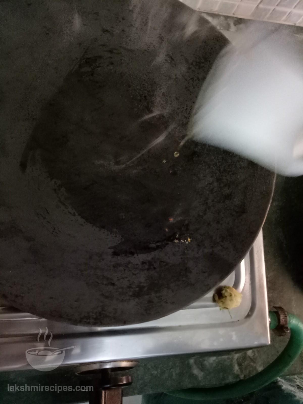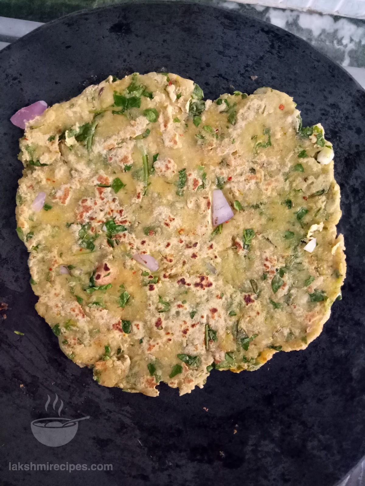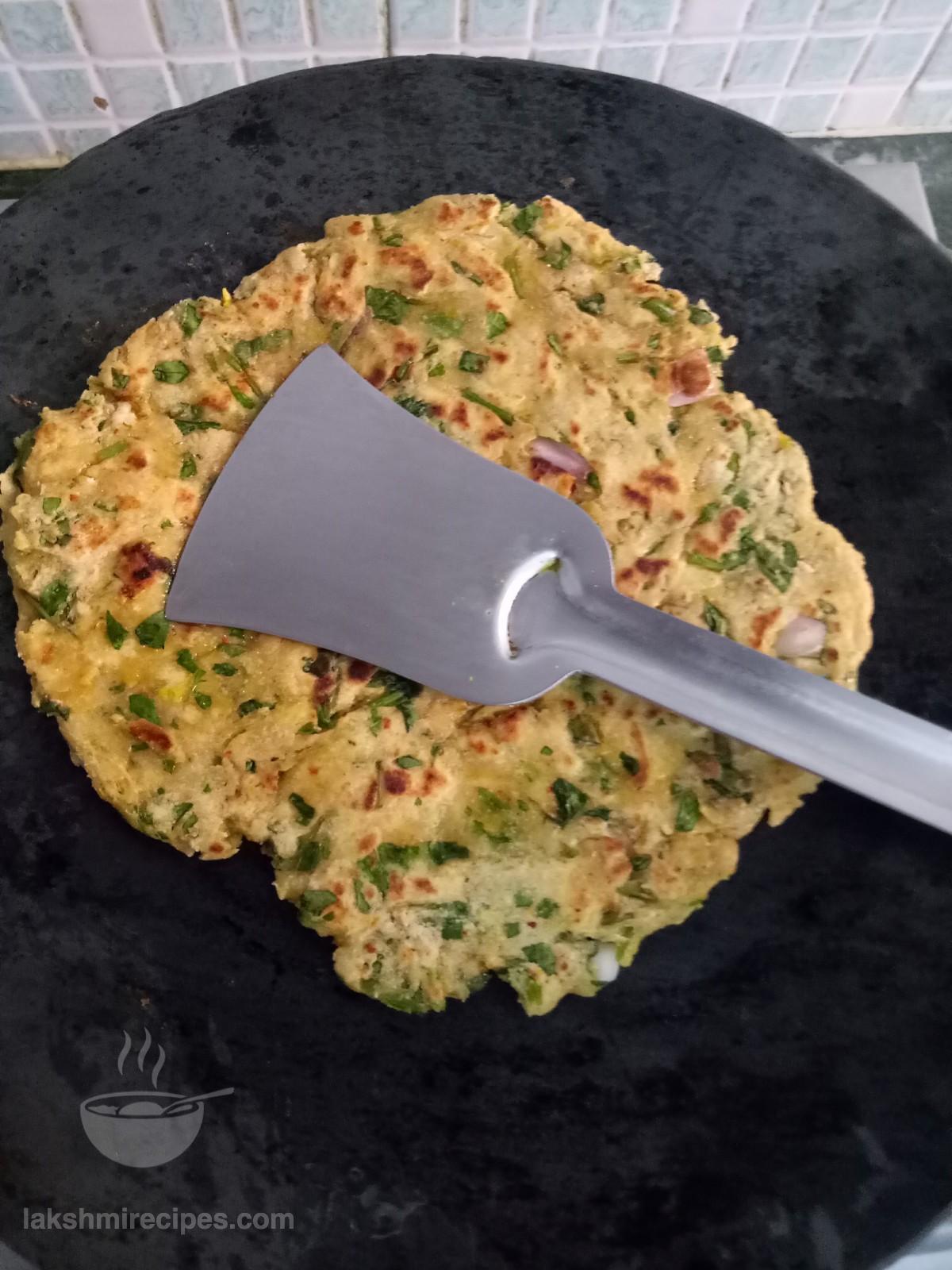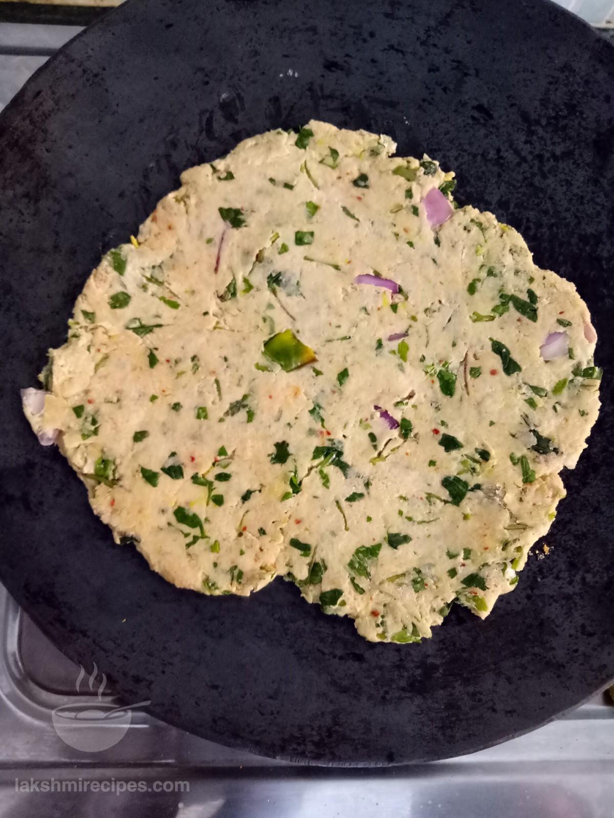 - Then heat a non-stick pan or tawa and grease it with 1 tea spoon ghee (you can use refined oil as per your requirement).