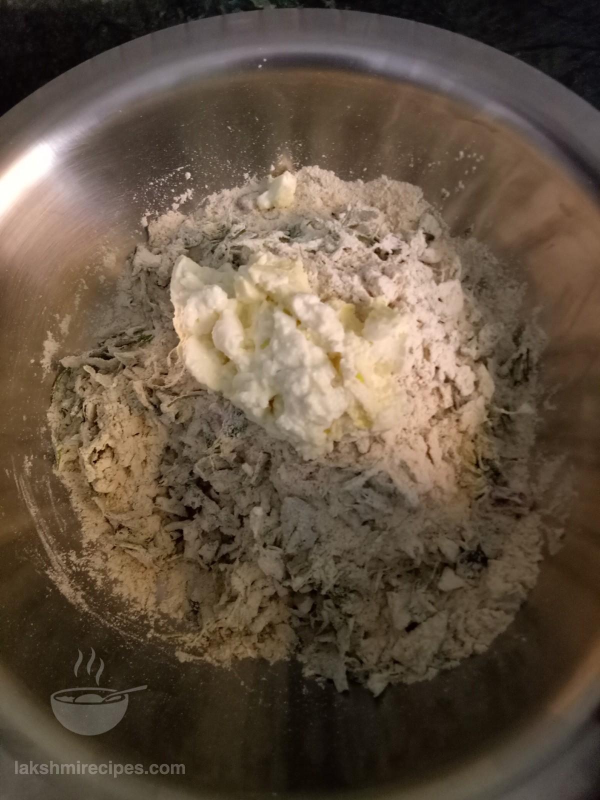 - Then add curd to the dry mixture and mix as if forming a dough. You can add ghee instead of curd. But never add both curd and ghee together to the dry mixture while preparing the dough for Bathua Ka Paratha.