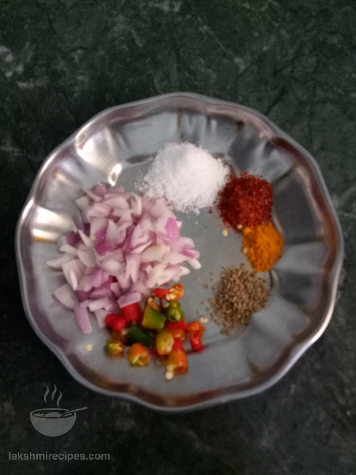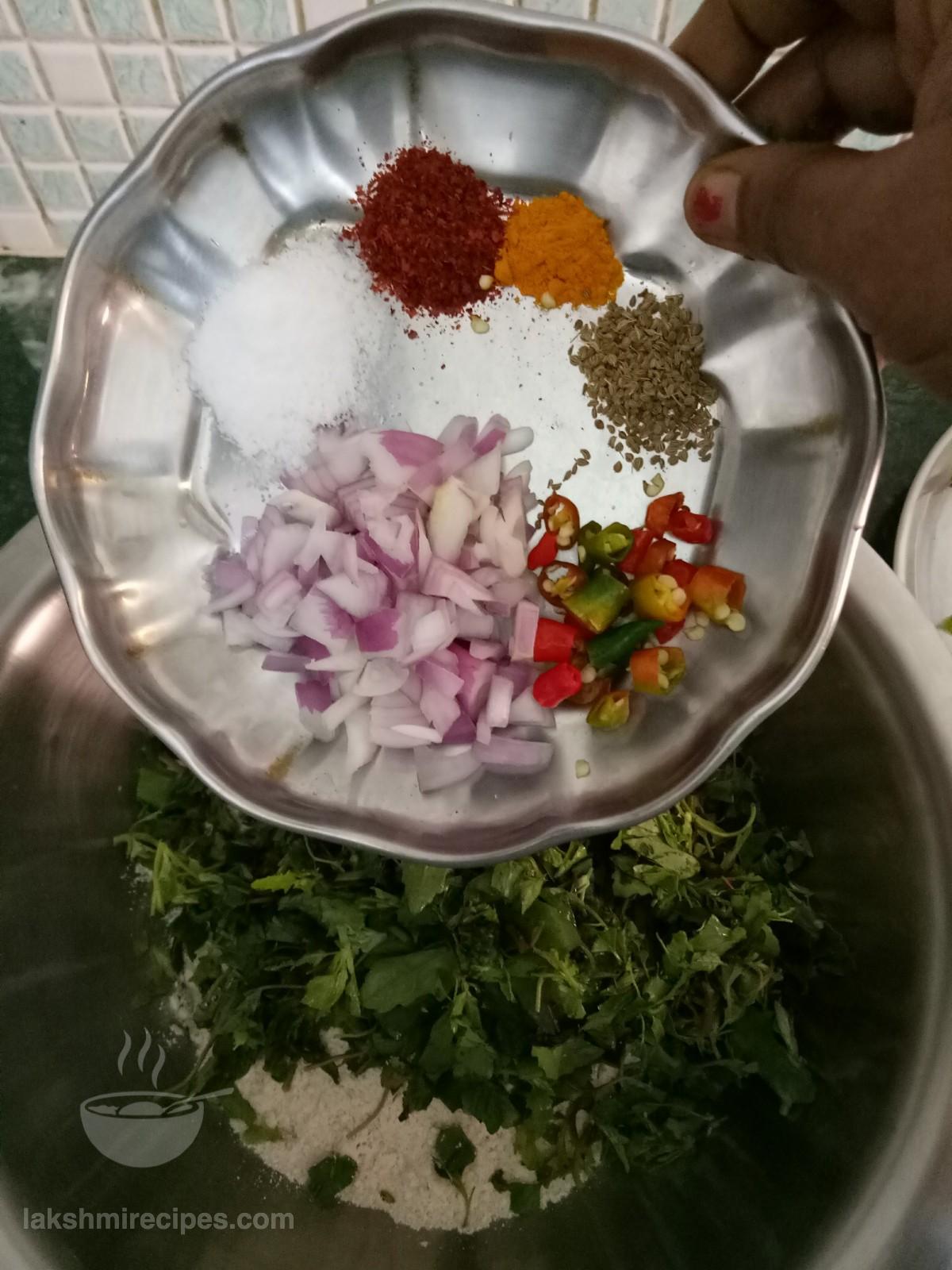 - Now add finely chopped onion, green chilli, turmeric powder, red chilli powder, salt and carom seeds to it. Mix the dry ingredients together.