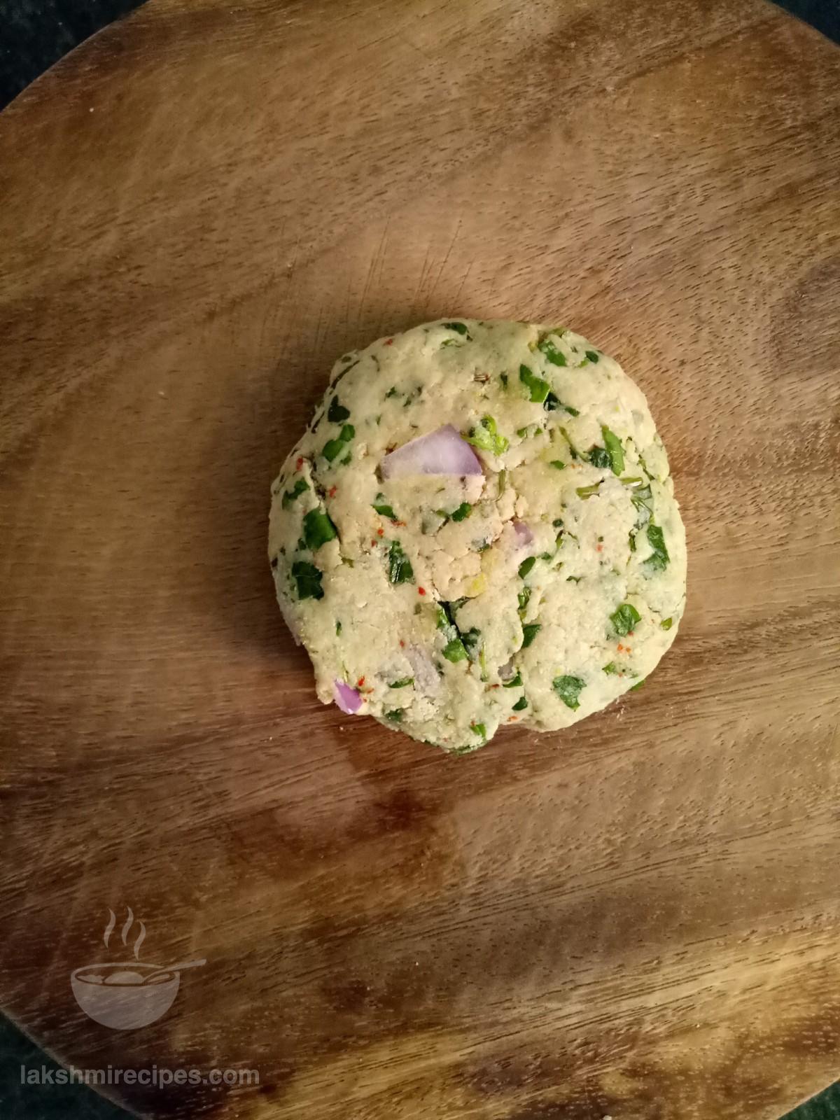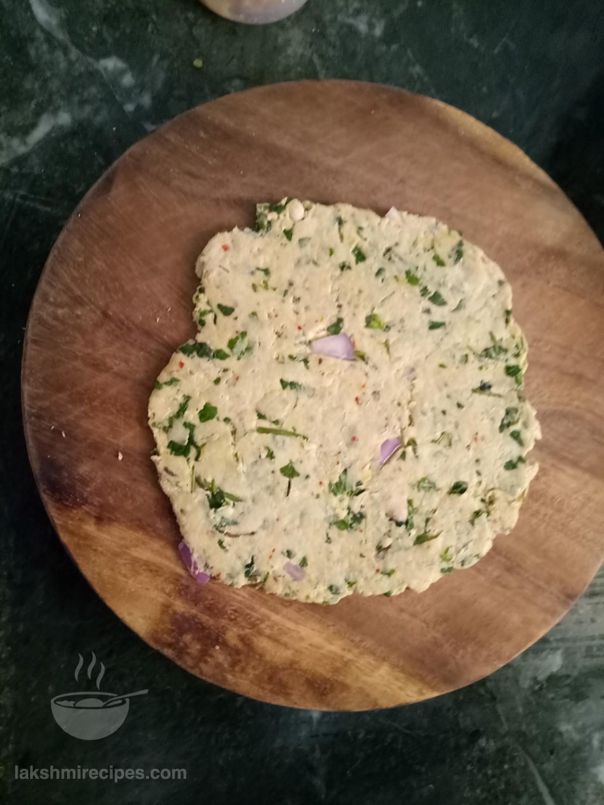 - Grease the rolling pin and rolling plate with ghee. Then place one dough ball over the rolling plate and flatten it like a tikki with your hand.