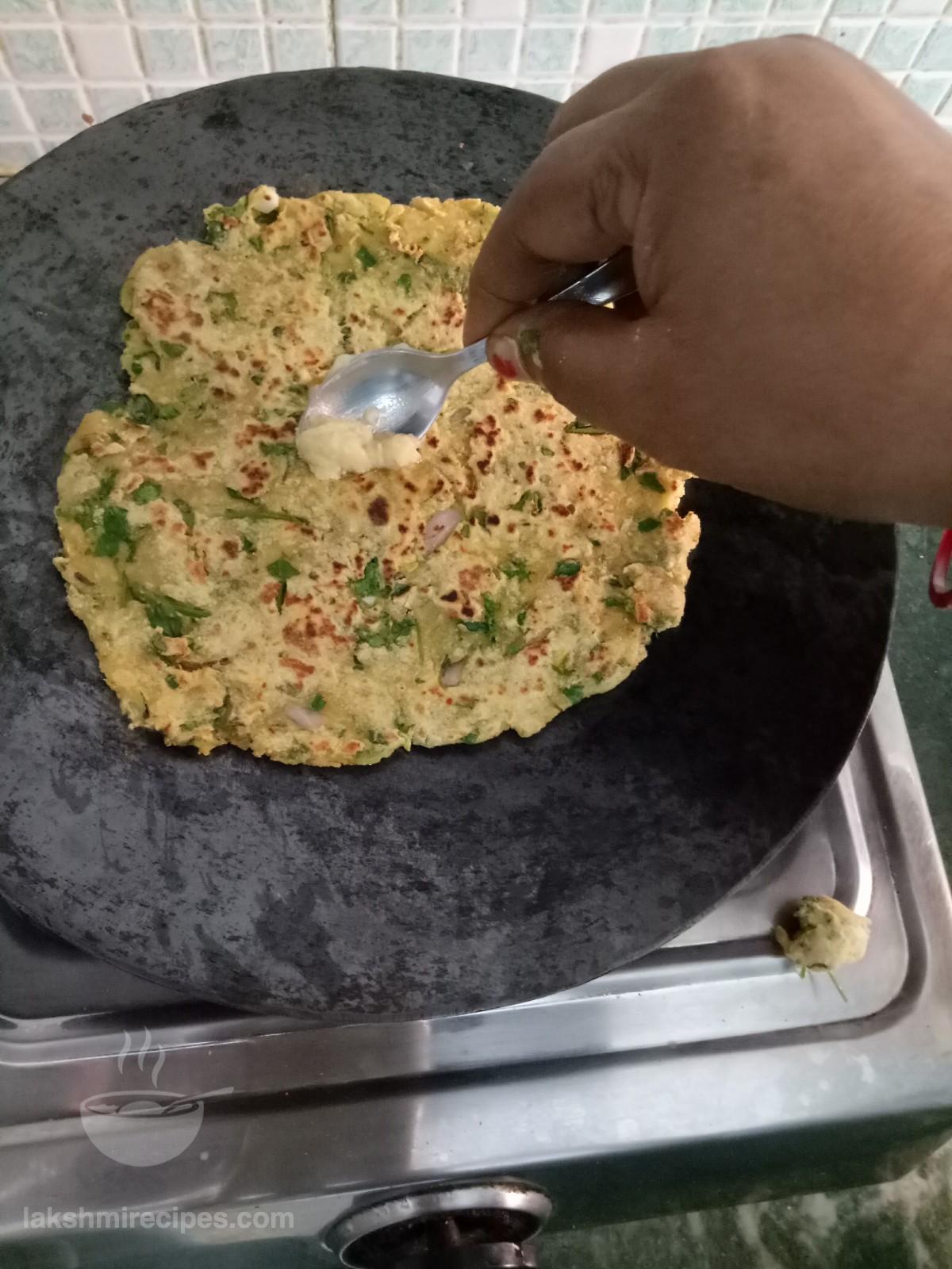- फिर एक तावा गरम करें और इस पर 1 छोटी चम्मच देसी घी डालकर फैलाएं (आप अपनी आवश्यकता के अनुसार रिफाइंड तेल का उपयोग कर सकते हैं)।