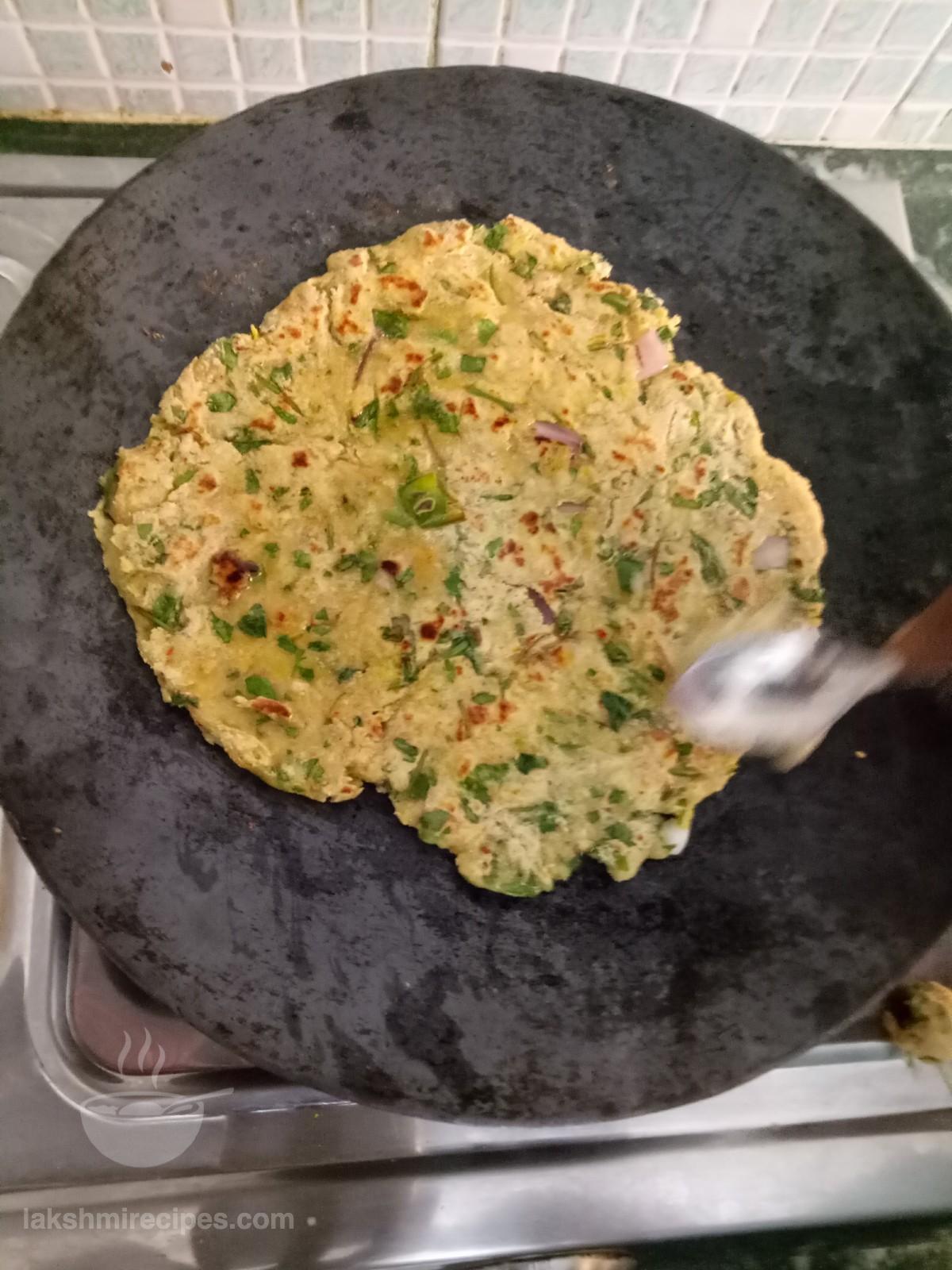 - Place this rolled out Bathua Ka Paratha over the hot tawa and lower the flame to medium level. Allow the Bathua ka Paratha to cook on one side, and flip to cook on the other side similarly. Flip again and apply 1 tea spoon ghee on the top side. Flip again and repeat them same step. Flip, press and cook till both sides turn golden brown, on medium flame.