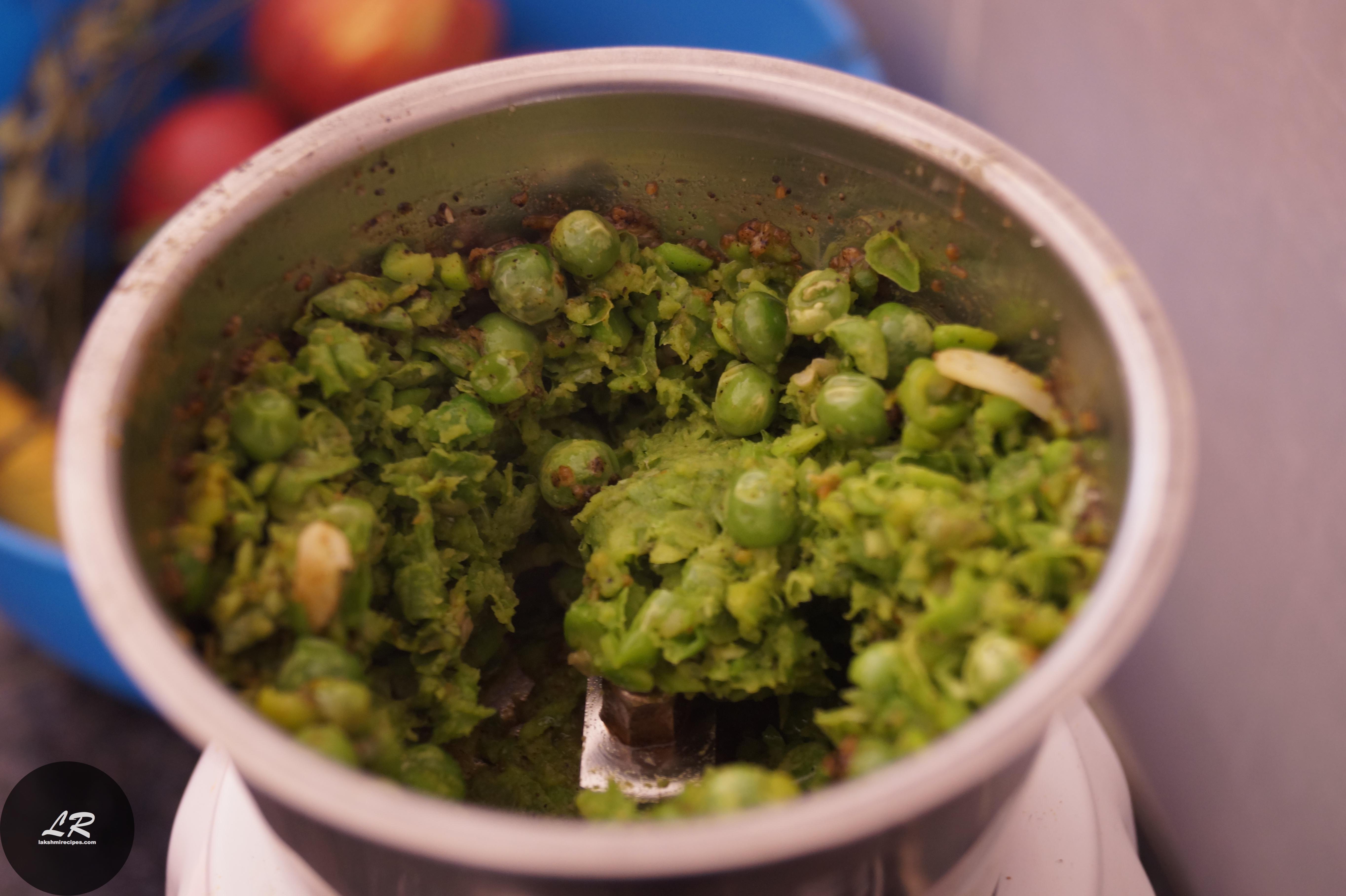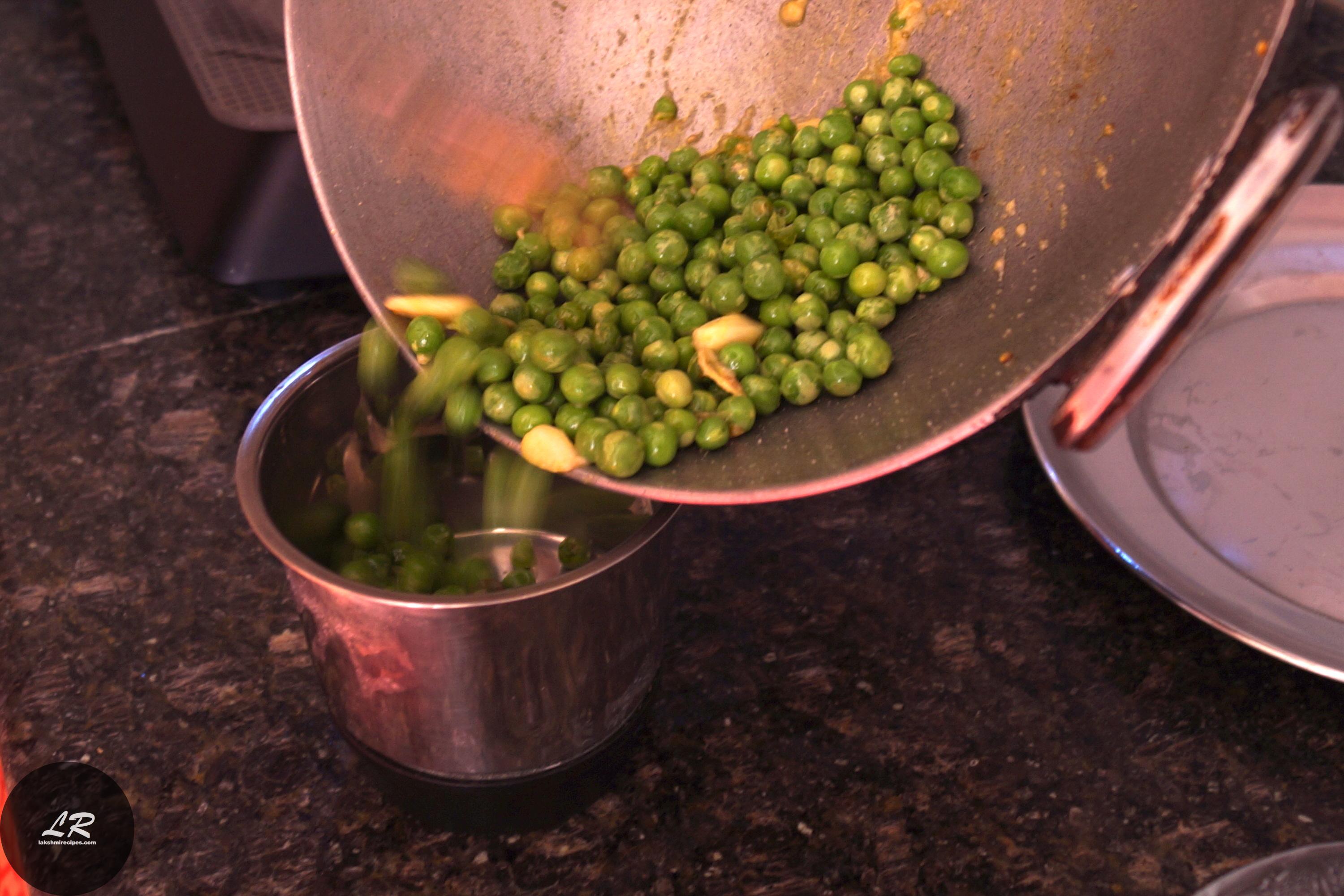 - Grind the cooked peas (hare matar ke daane) in a mixer grinder to form a granular mixture of ingredients. (Please note that the peas should not be over grinded, else a paste like mixture will be formed.)