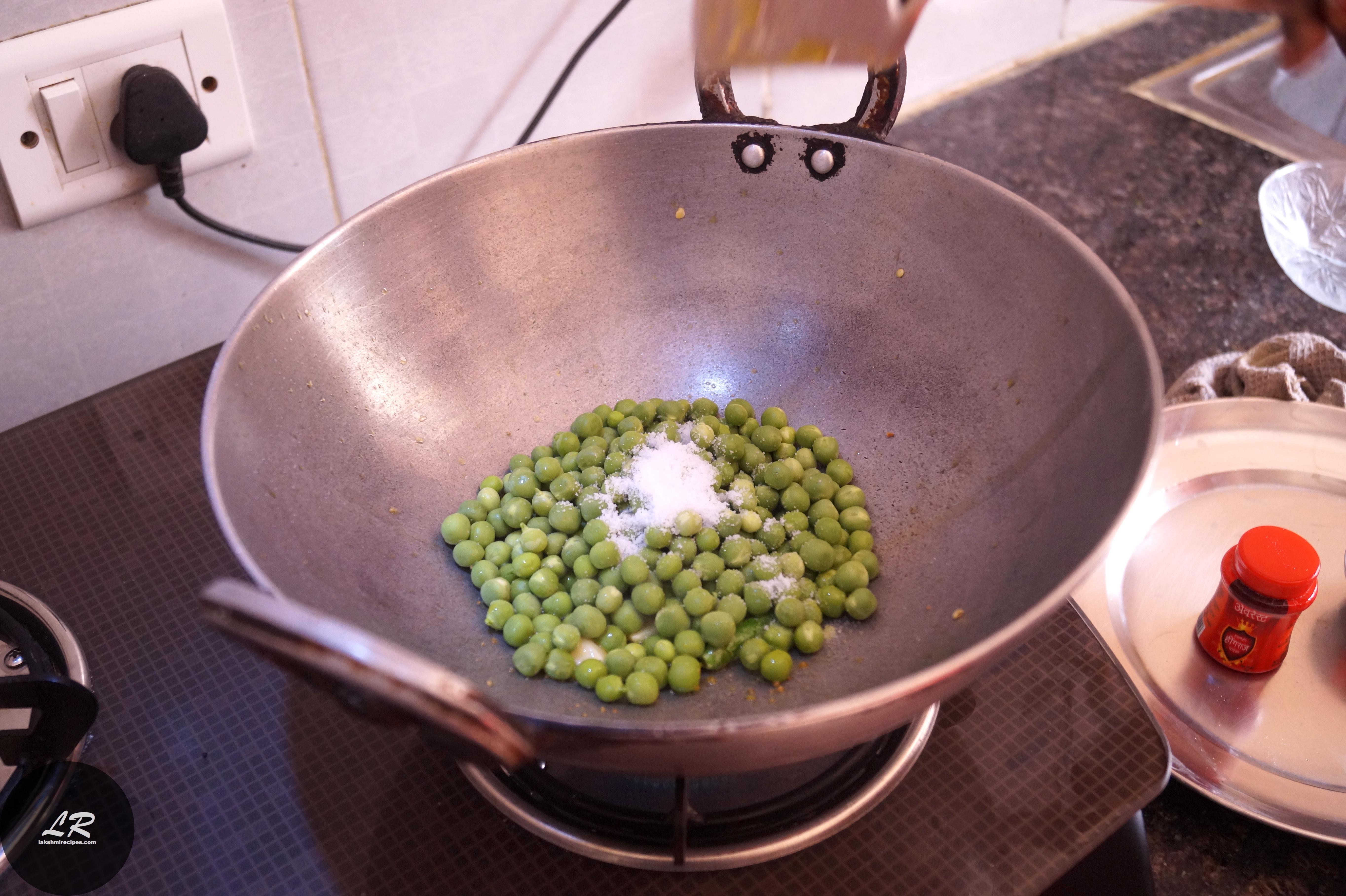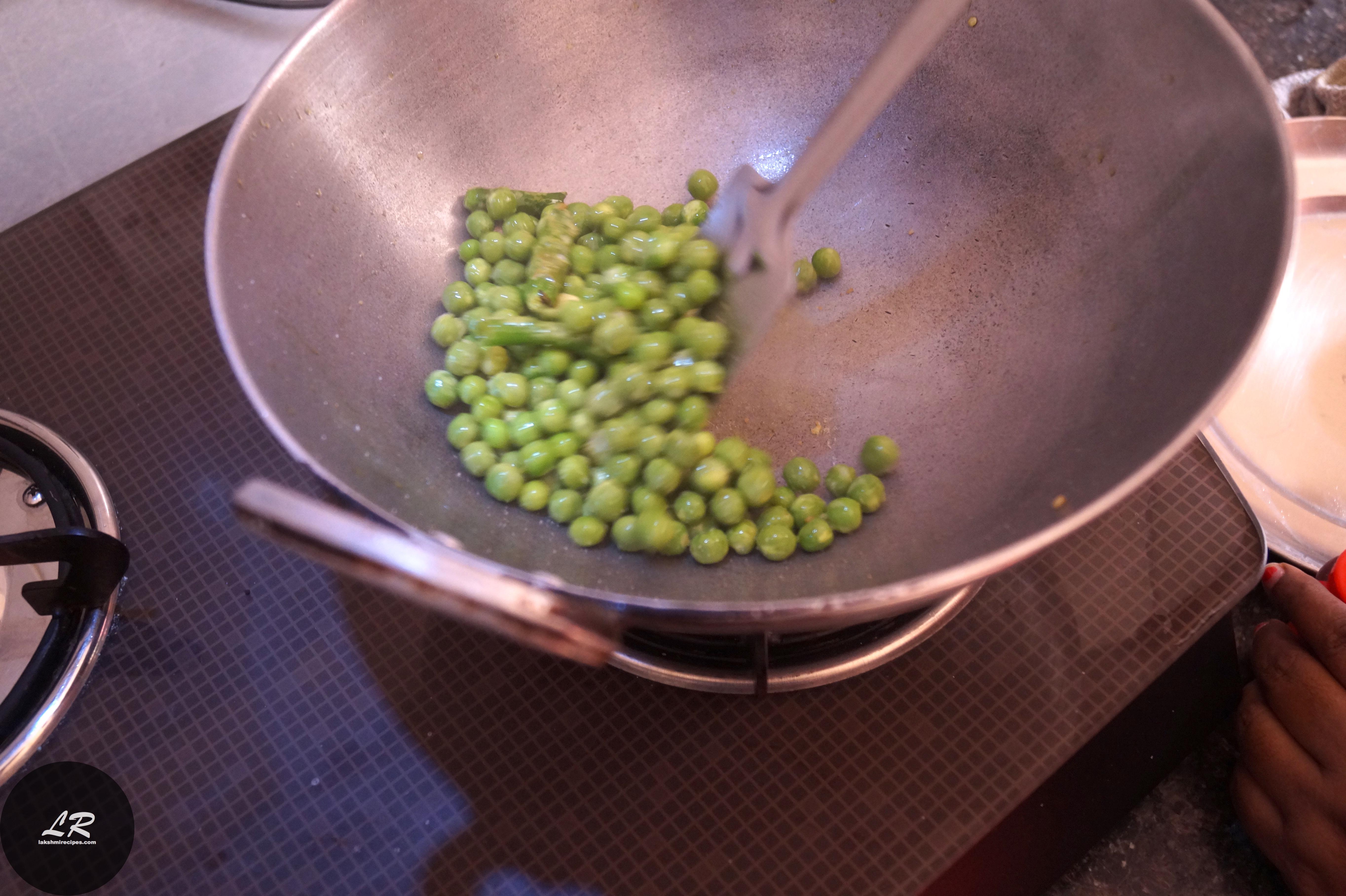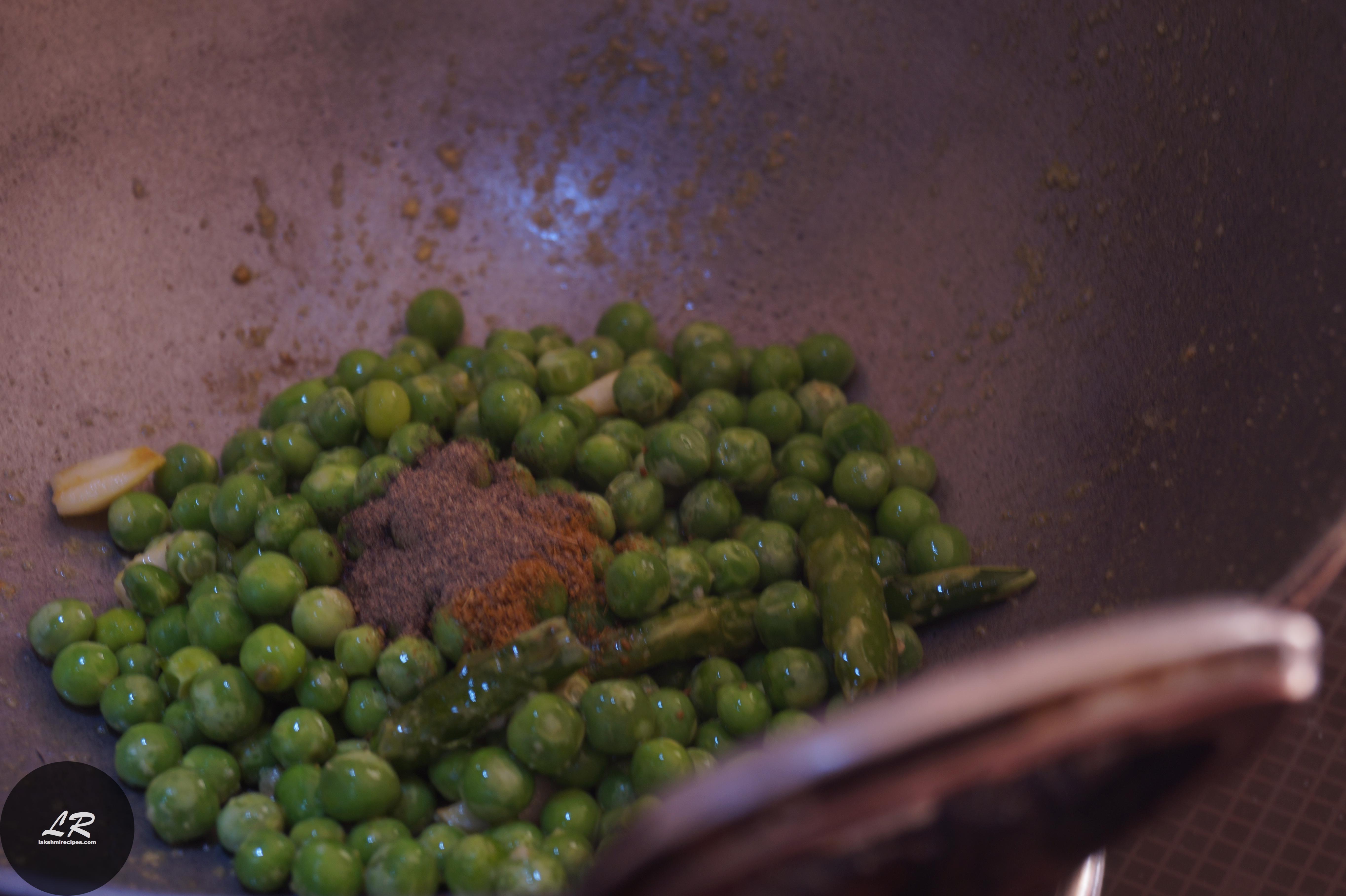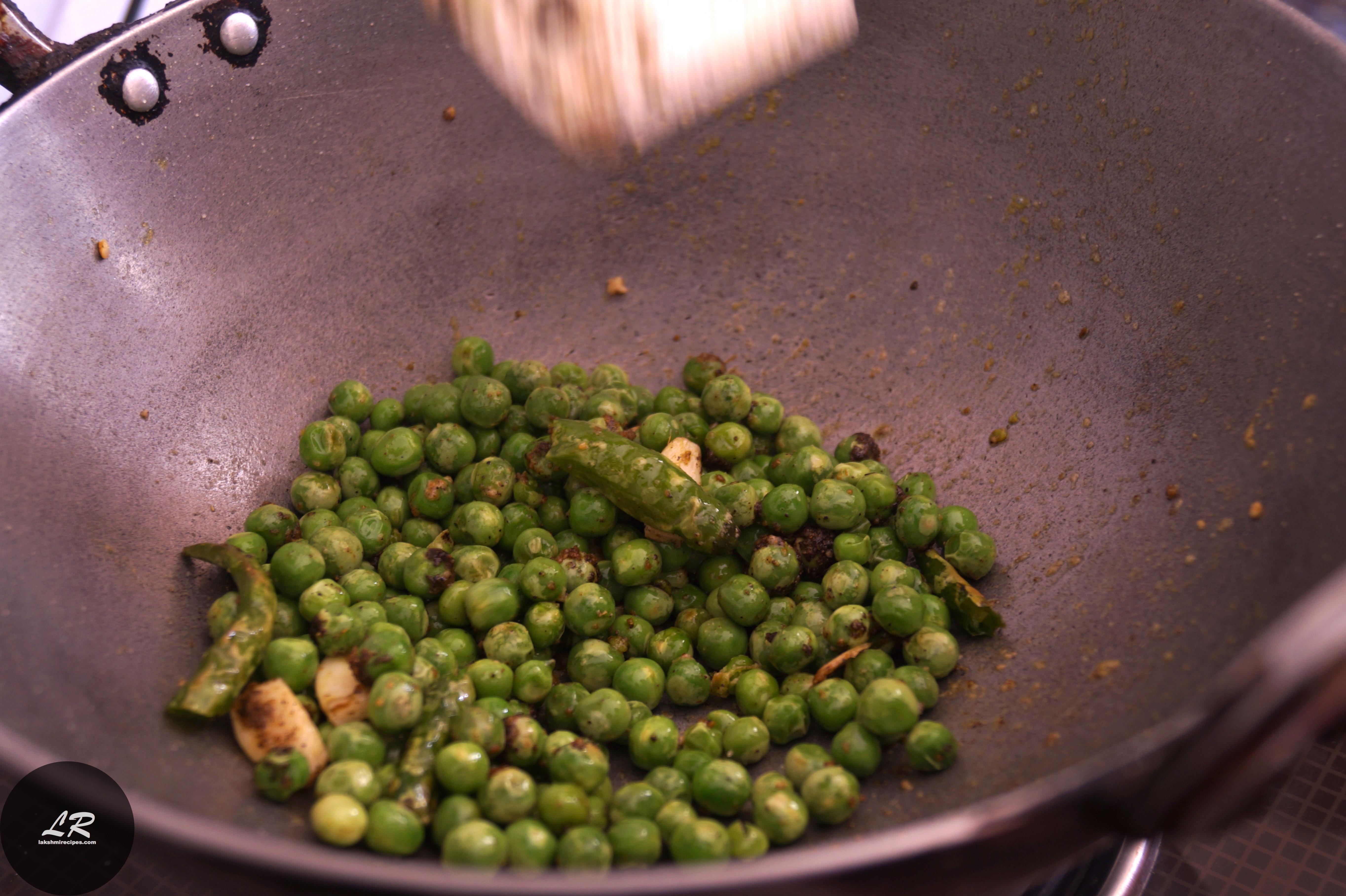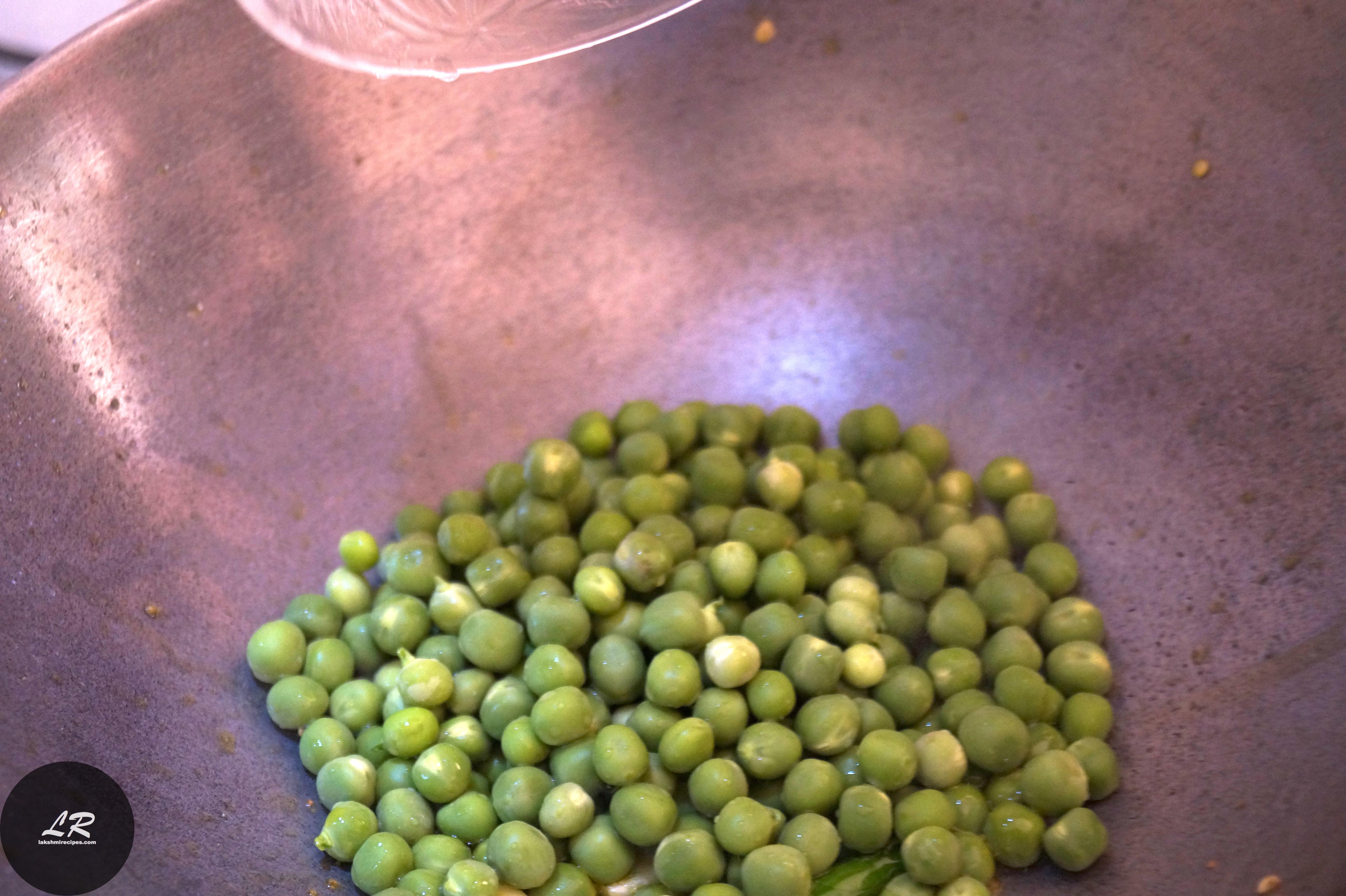 - After a few minutes add the green peas (hari matar) to the kadhai and start stirring.