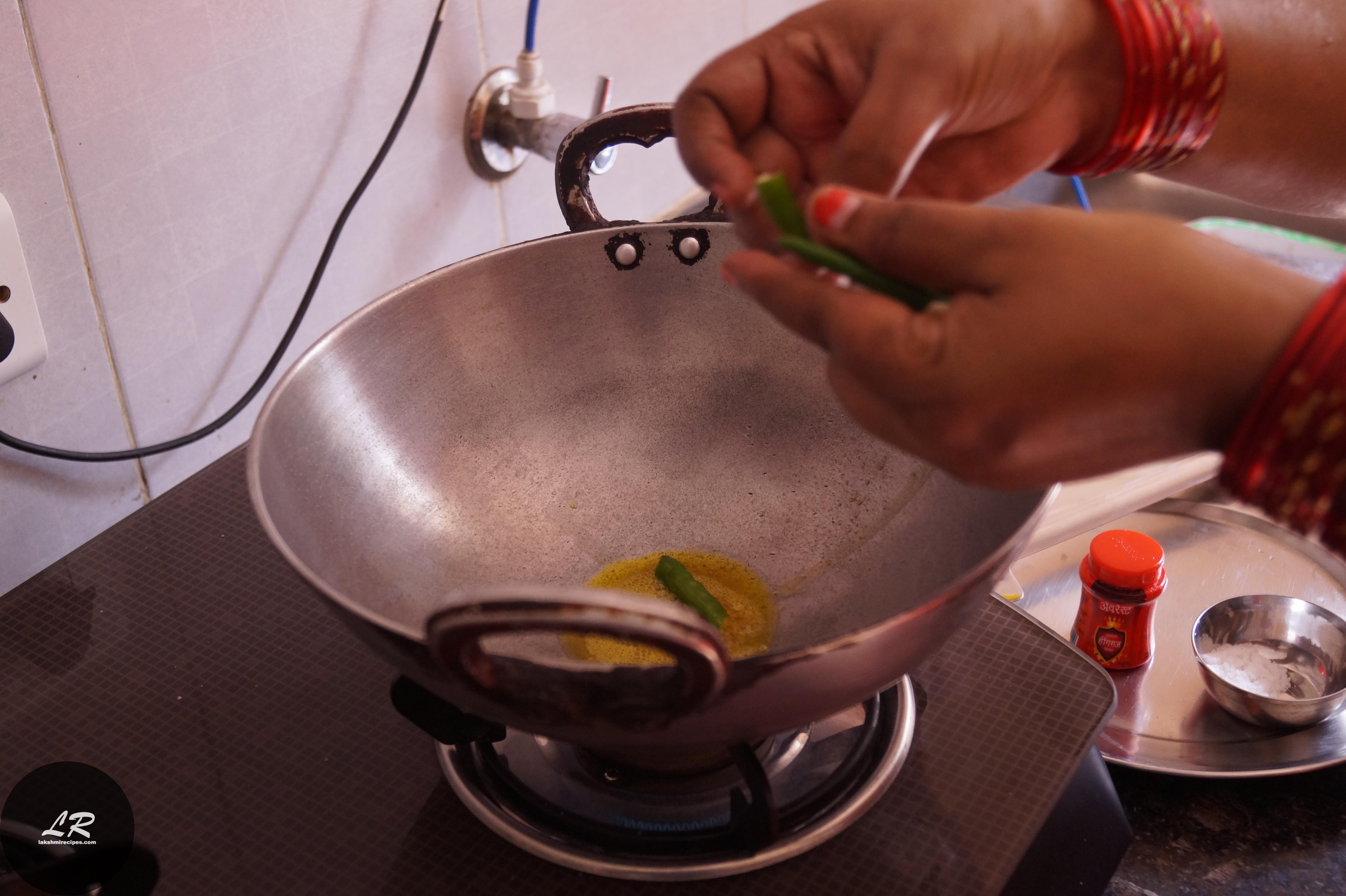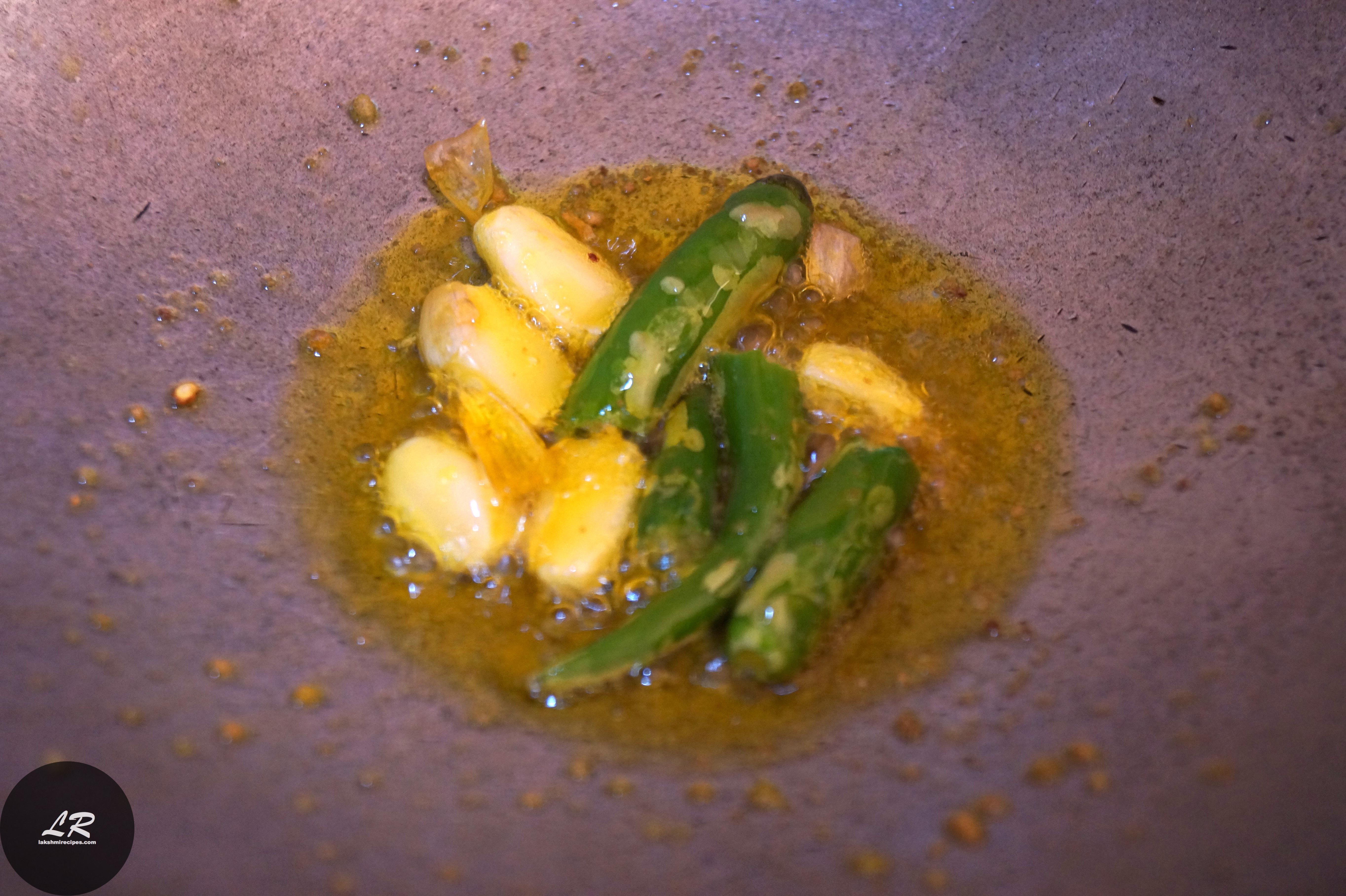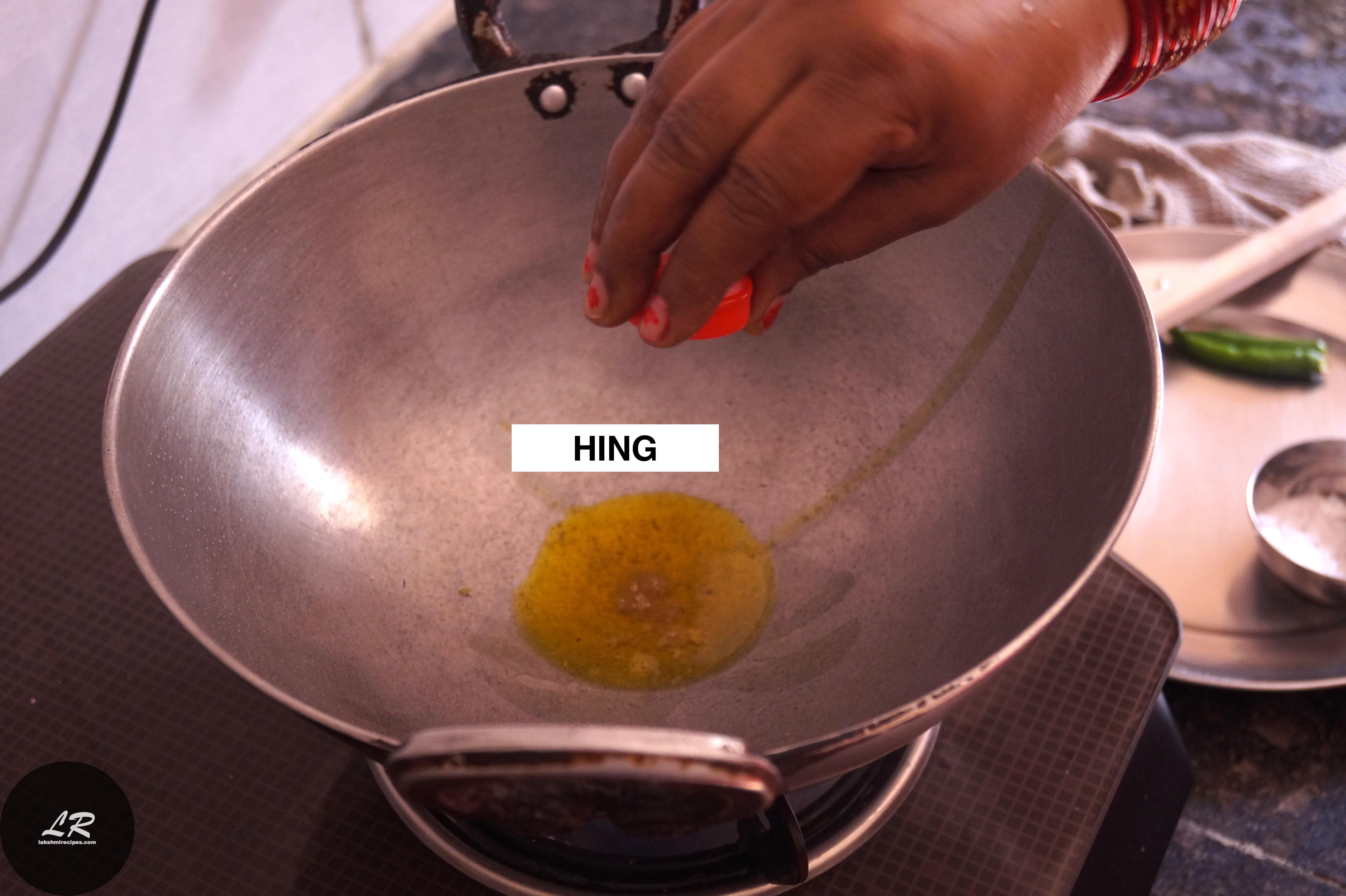 - Heat some oil in a kadhai on medium flame. When the oil is heated add some asafoetida (hing powder) to it. And after 30 seconds add chopped green chilli (hari mirch) and garlic petals(lehsun ki kali).
