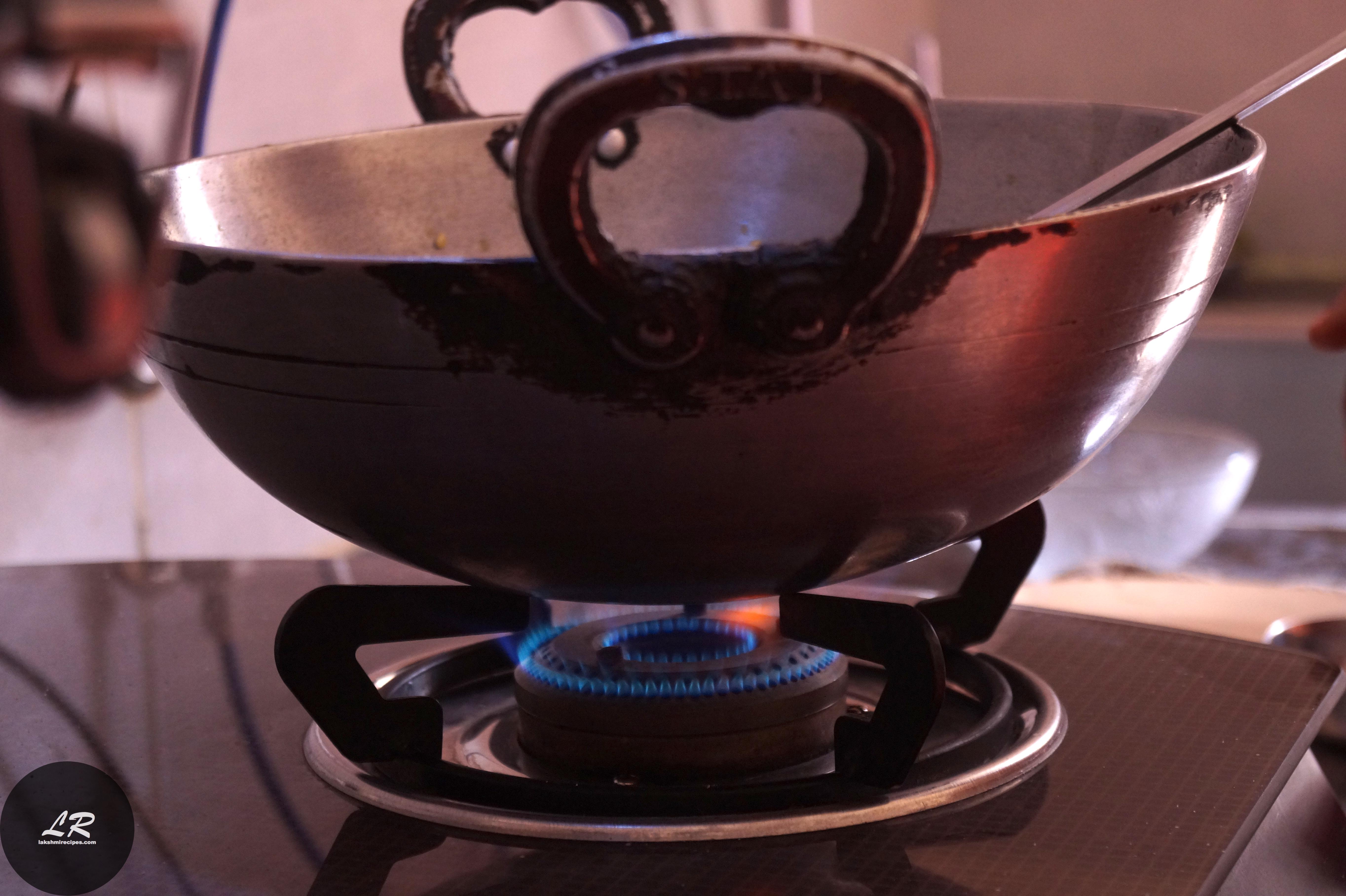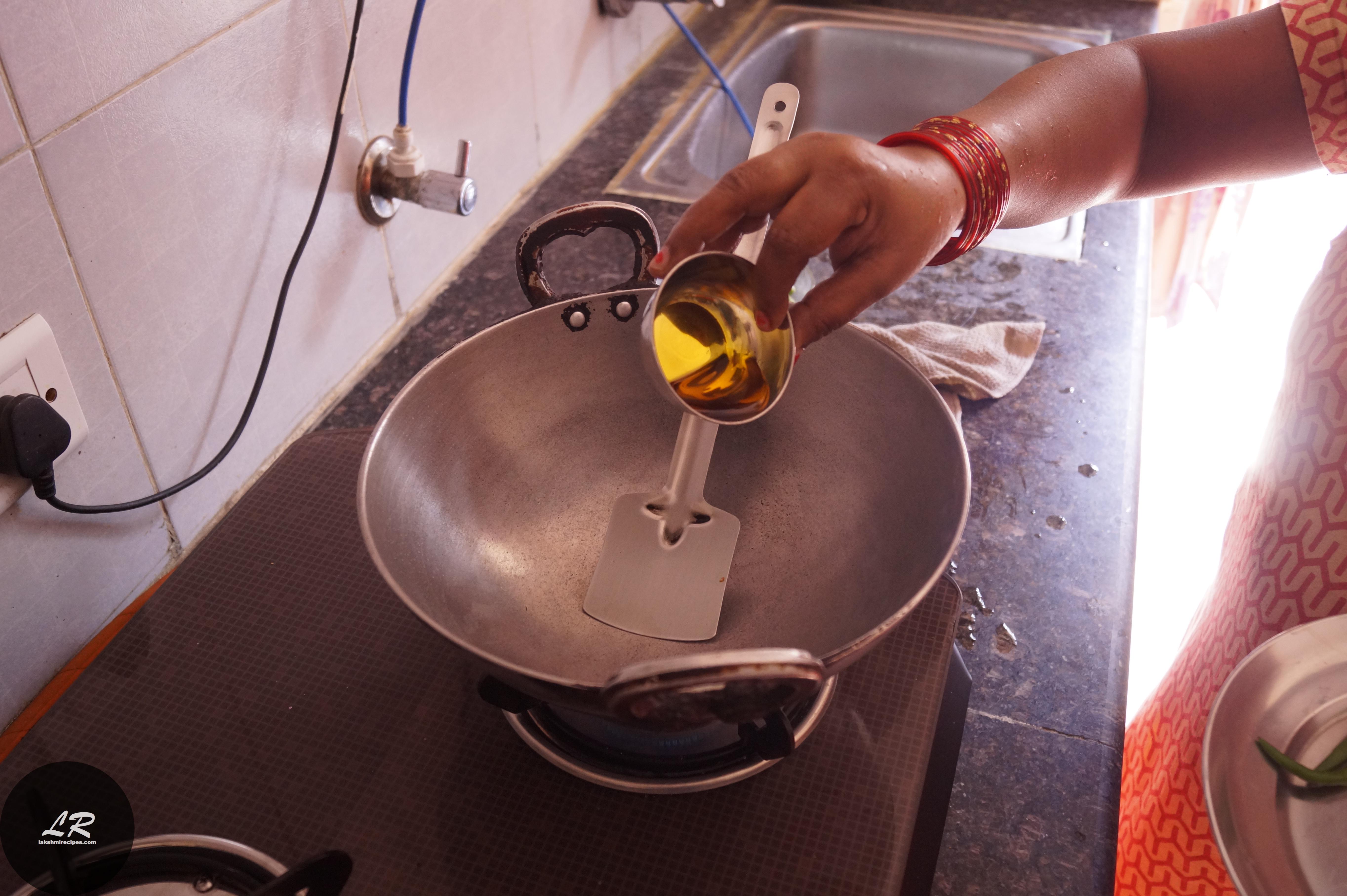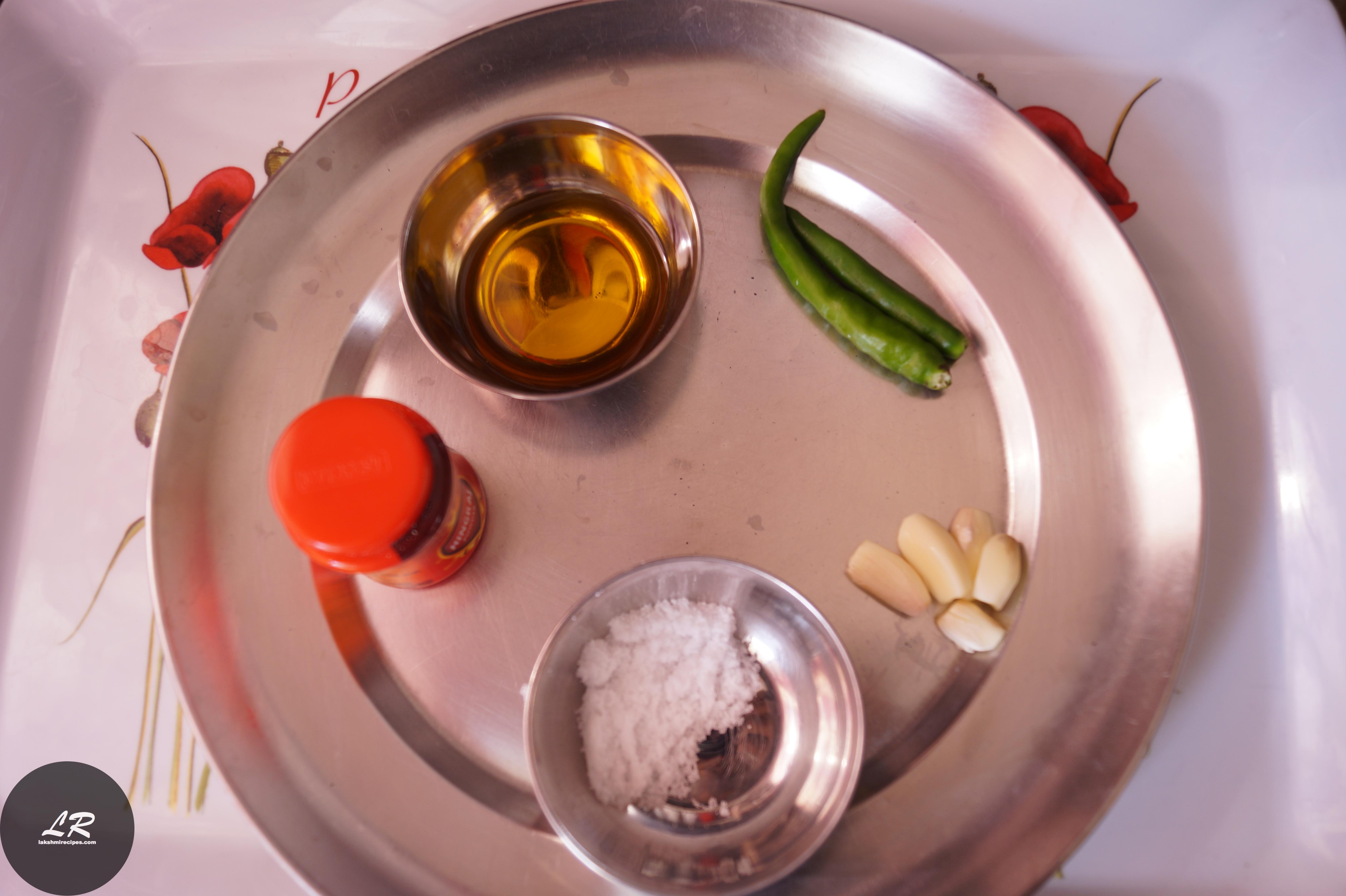- Heat some oil in a kadhai on medium flame. When the oil is heated add some asafoetida (hing powder) to it. And after 30 seconds add chopped green chilli (hari mirch) and garlic petals(lehsun ki kali).