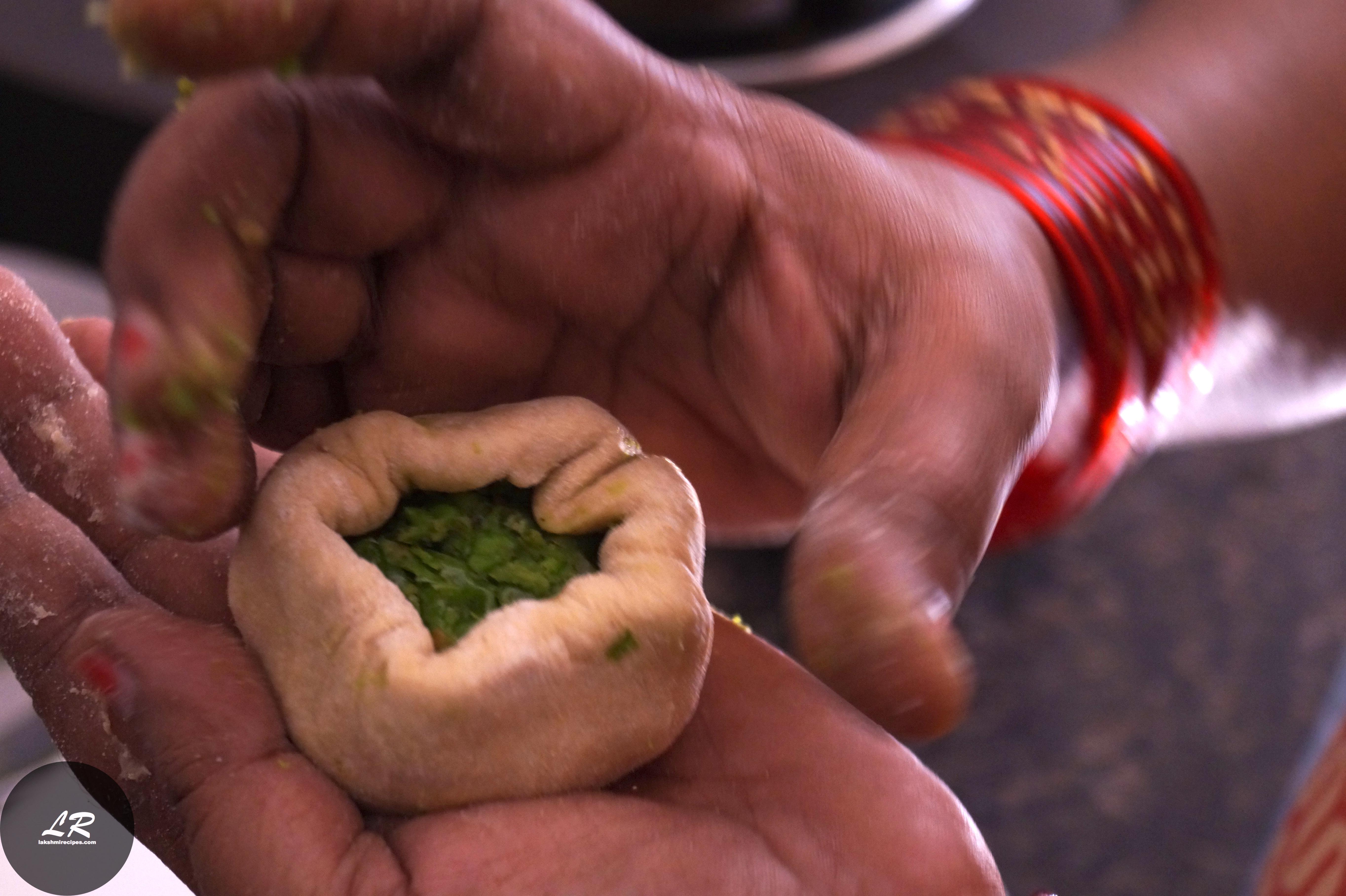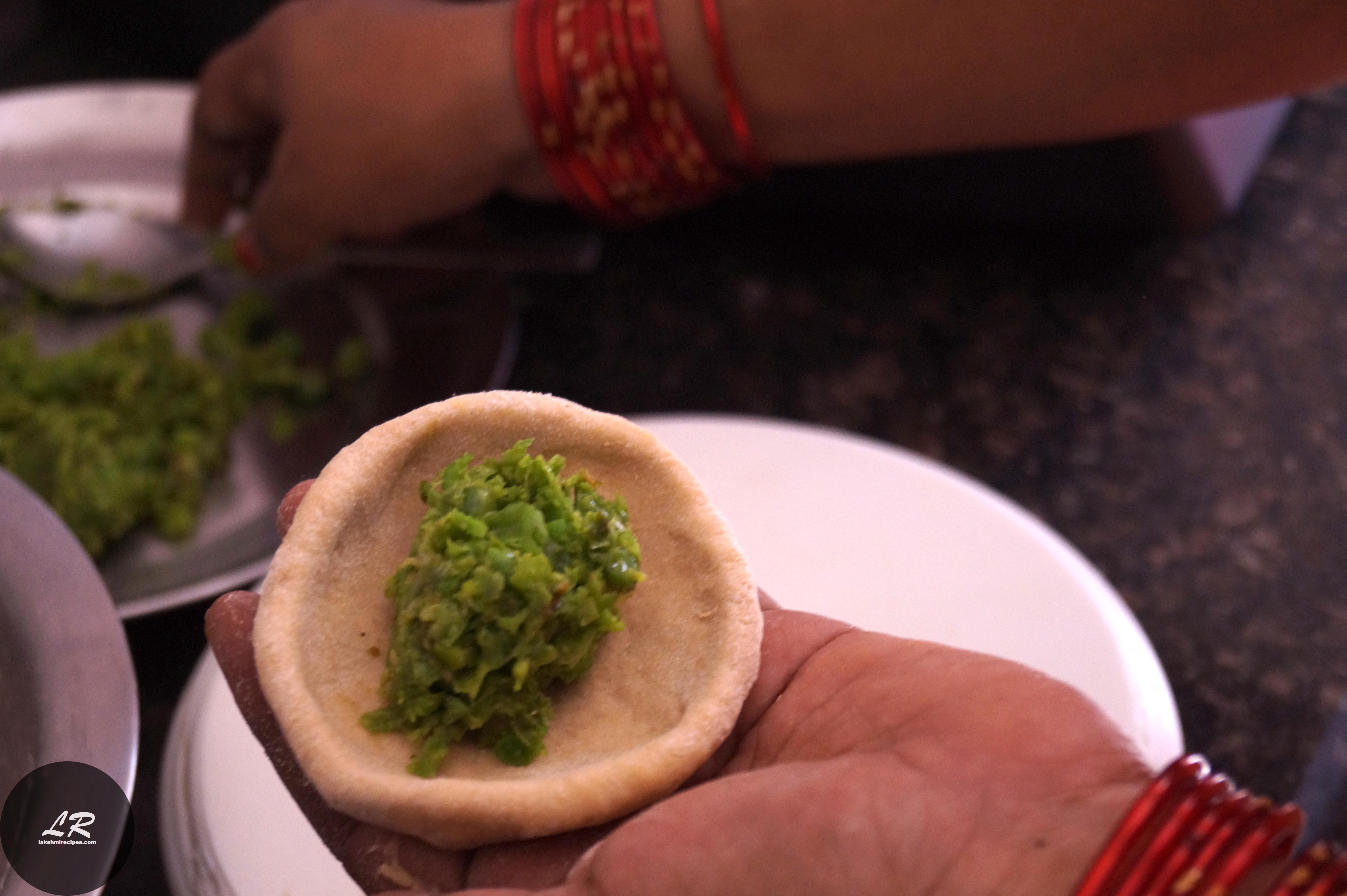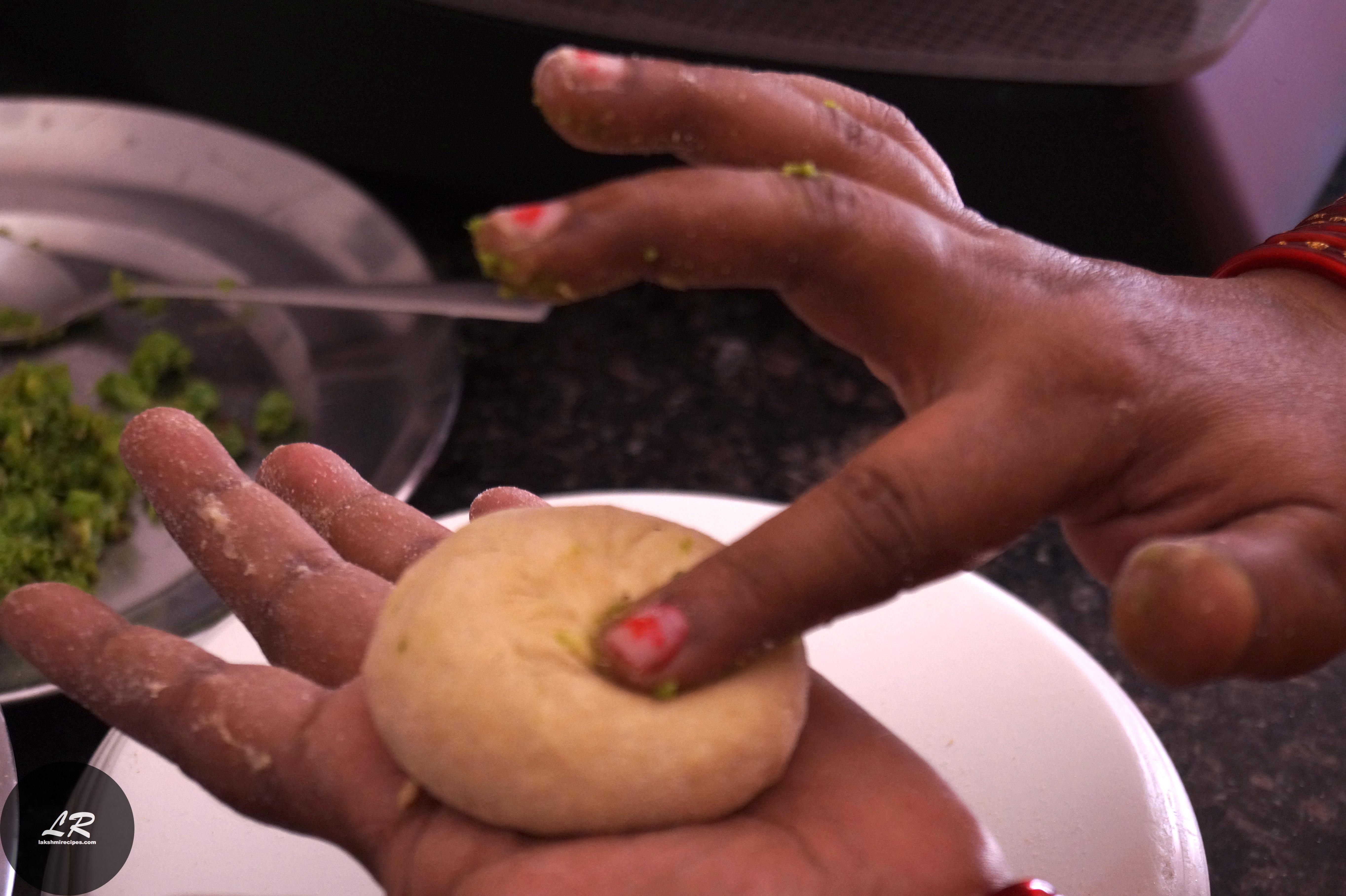 - Now using a tea-spoon, place enough peas (hare matar ki stuffing) mixture stuffing at the center of each dough bowls, and fold it to form a small ball like dumplings (like ladoos).