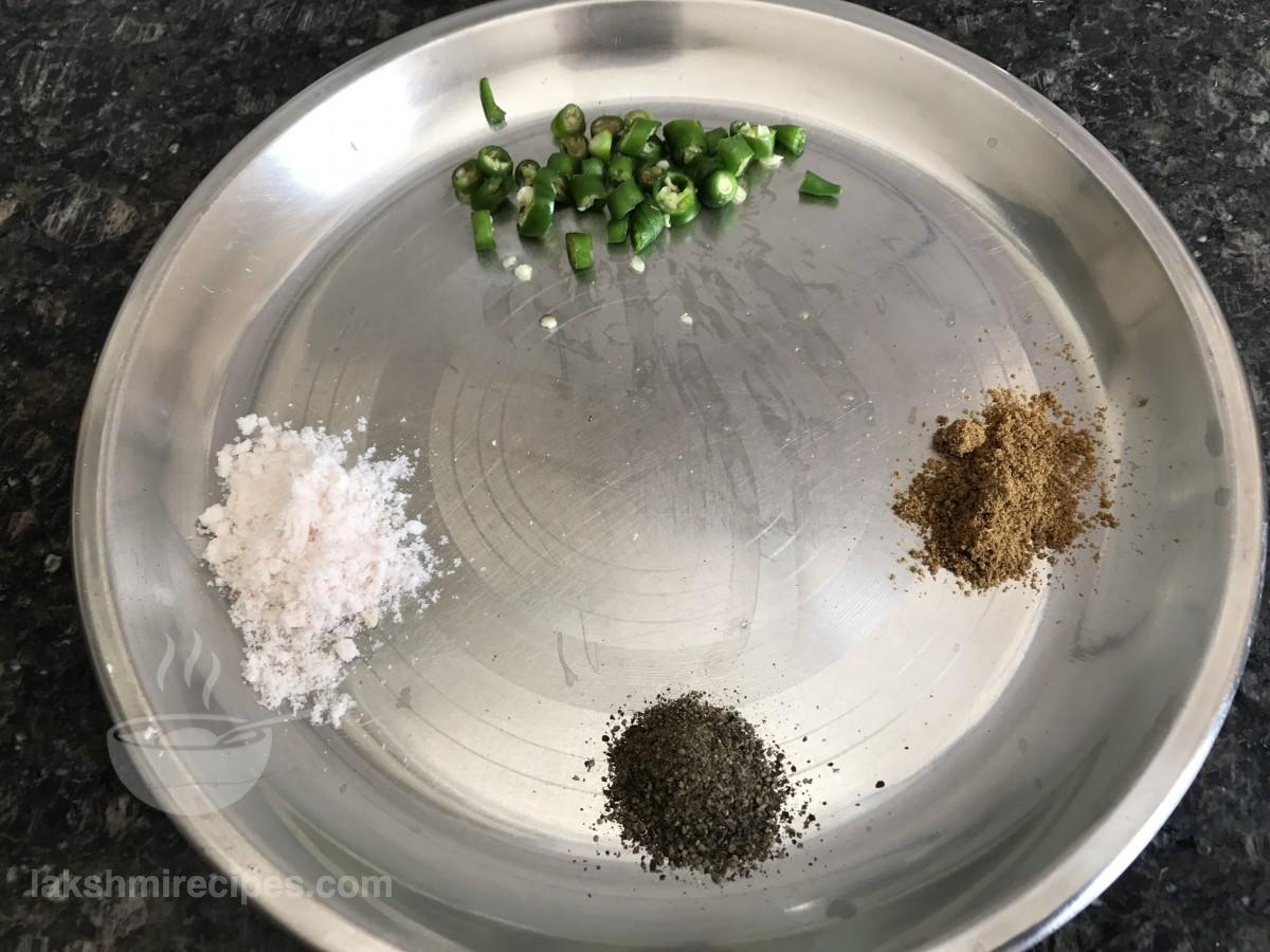 - Then add chopped green chilli, green coriander leaves, cumin seeds powder, black pepper powder and rock salt to it.
