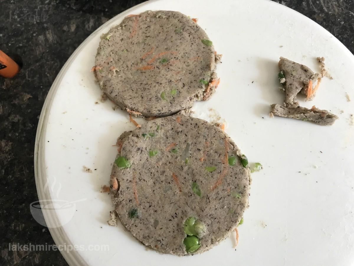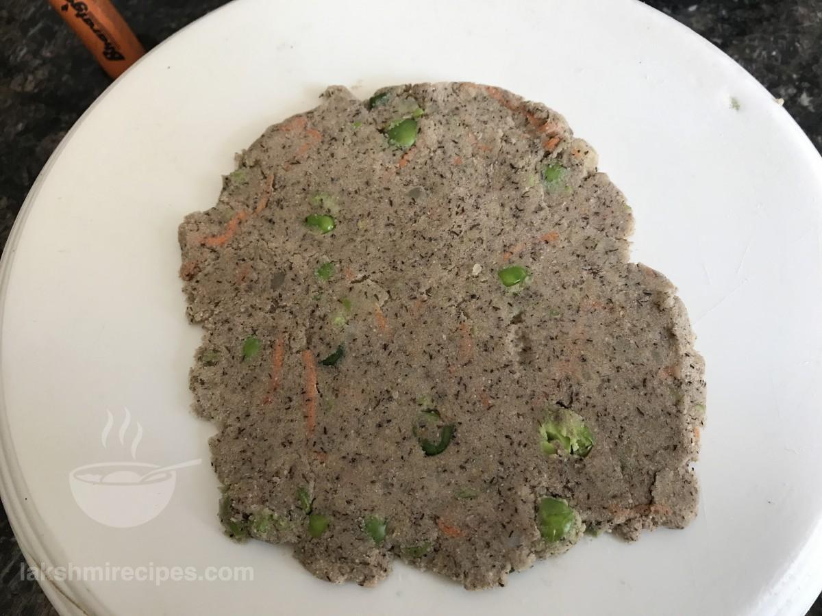 - Press it slightly with your hands and then roll it to make it flat and round like roti with a rolling pin. It should be only a little thicker than the chapati rolled out from whole wheat flour.