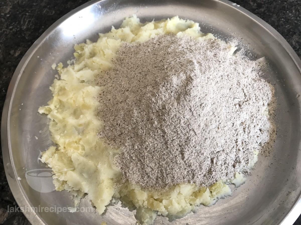 - Add Buckwheat Flour or Kuttu Ka Atta to the plate containing mashed boiled potatoes.