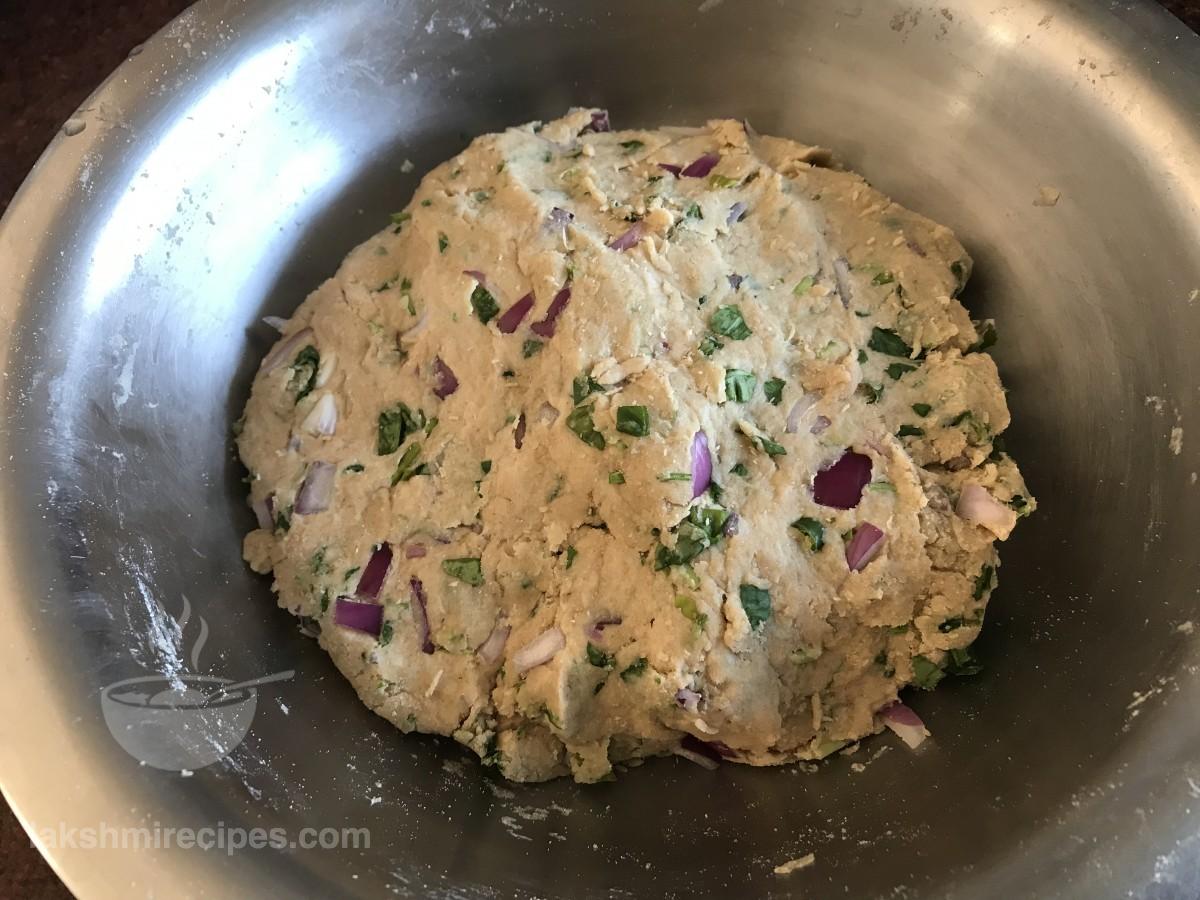 - Now slowly add water to this mixture of flour and Fenugreek leaves or methi ka saag. Knead the ingredients together to form a medium hard dough. Cover this vessel with a lid and leave the dough to rest for 5 minutes.