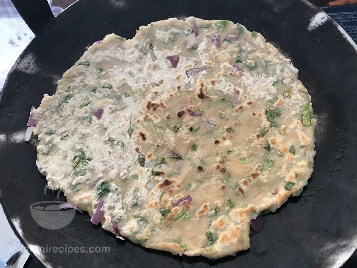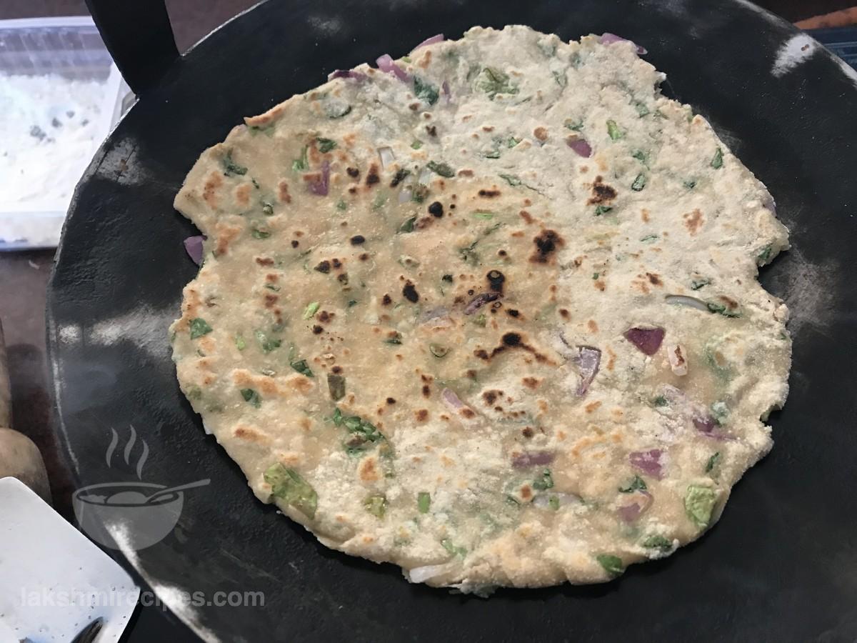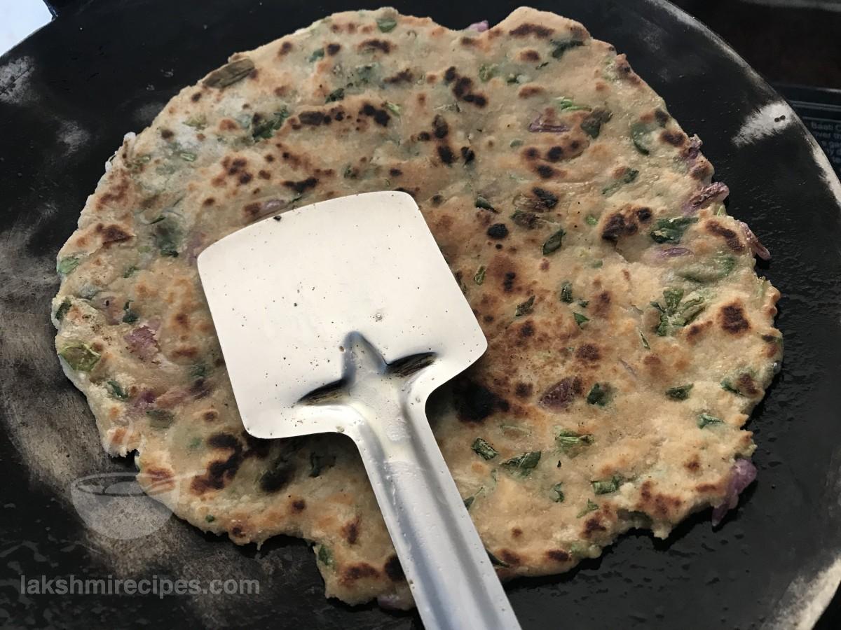 - Place this rolled out Methi Ka Paratha over the hot tawa and lower the flame to medium level. Allow the Methi ka Paratha to cook on one side, and flip to cook on the other side similarly. Flip again and apply 1 tea spoon ghee on the top side. Flip again and repeat them same step. Flip, press and cook till both sides turn golden brown, on medium flame.