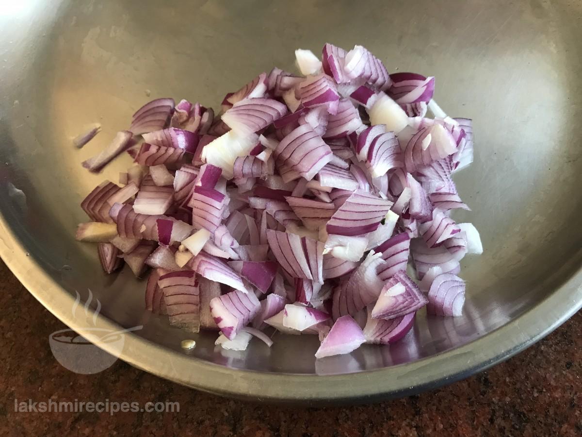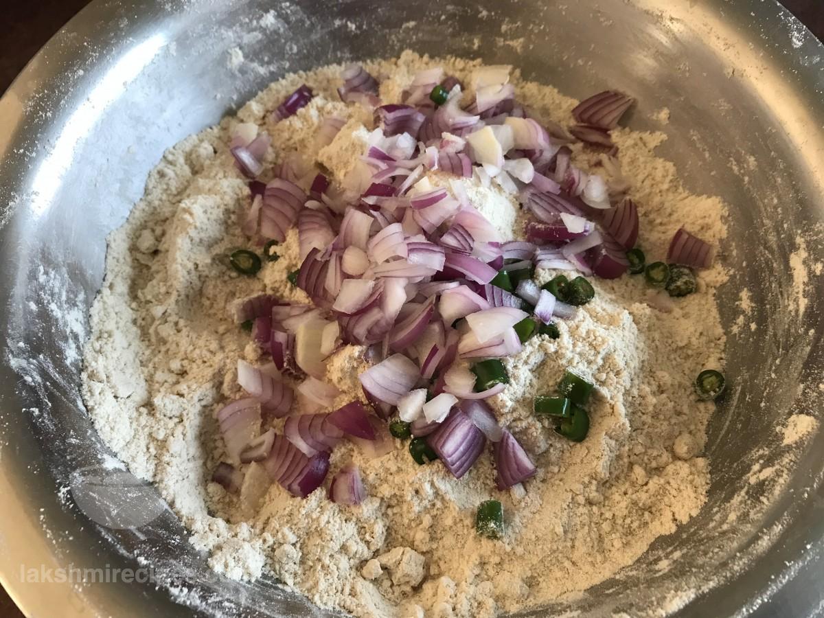 - Now add finely chopped onion, green chilli, turmeric powder and salt to it.