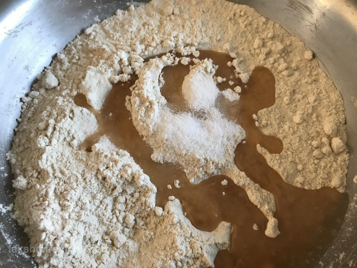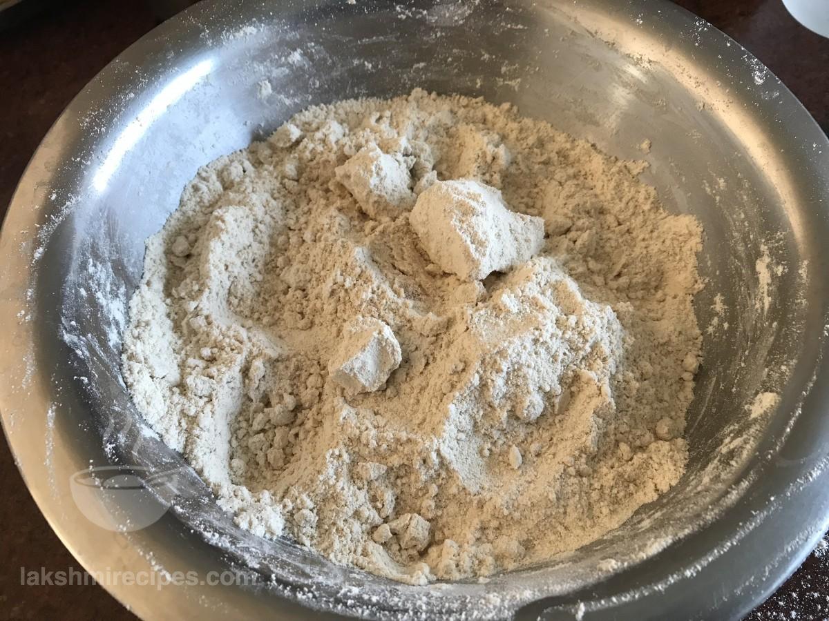 - Then take whole wheat flour in a deep vessel and add refined oil or ghee to the dry mixture and mix as if forming a dough. Check if the wheat flour begins to bind. Add more refined oil or ghee if needed.