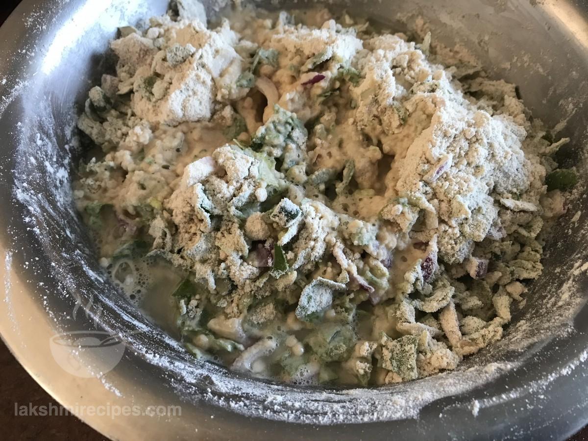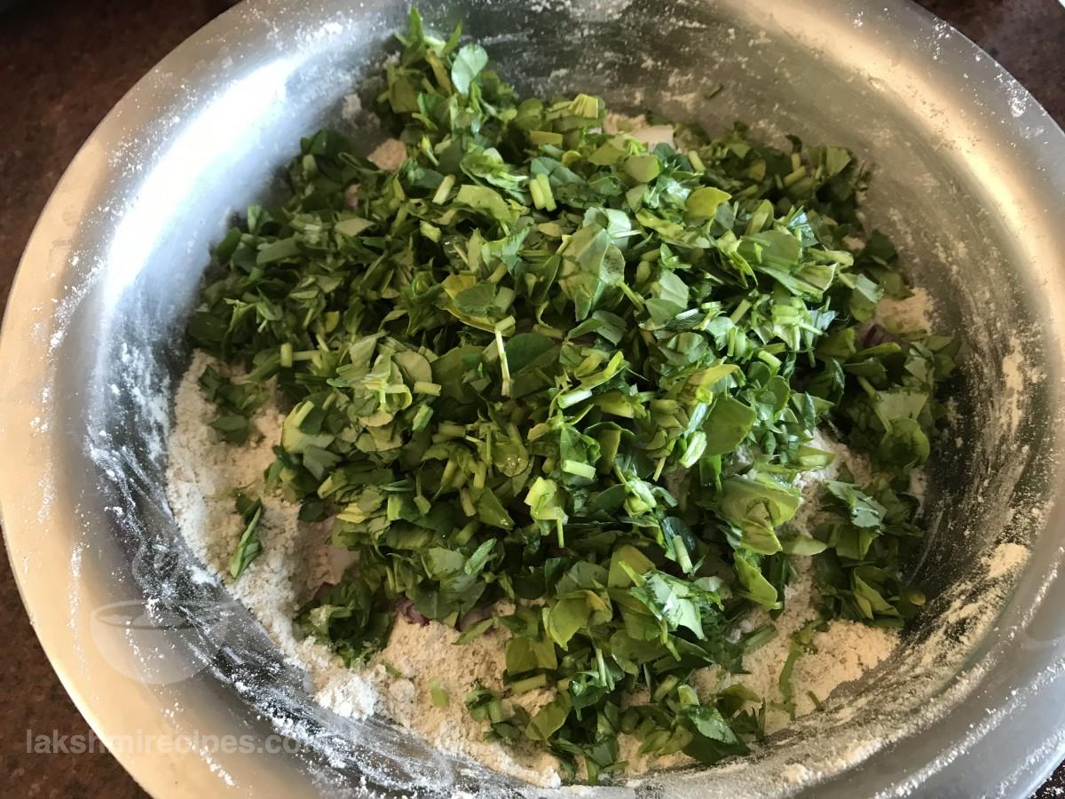 - Then add the finely chopped Fenugreek leaves or methi ka saag to it. Mix the dry ingredients together.