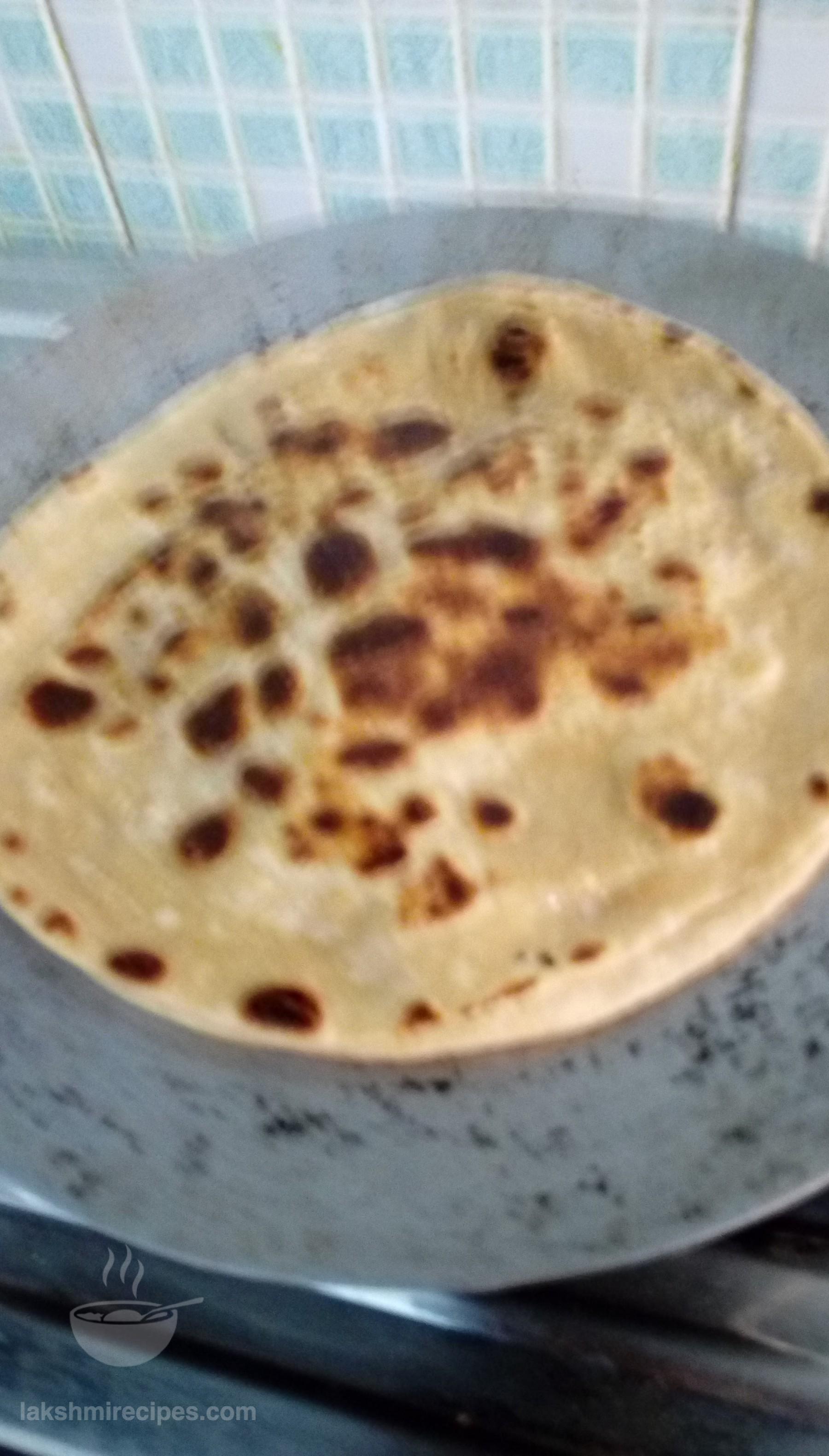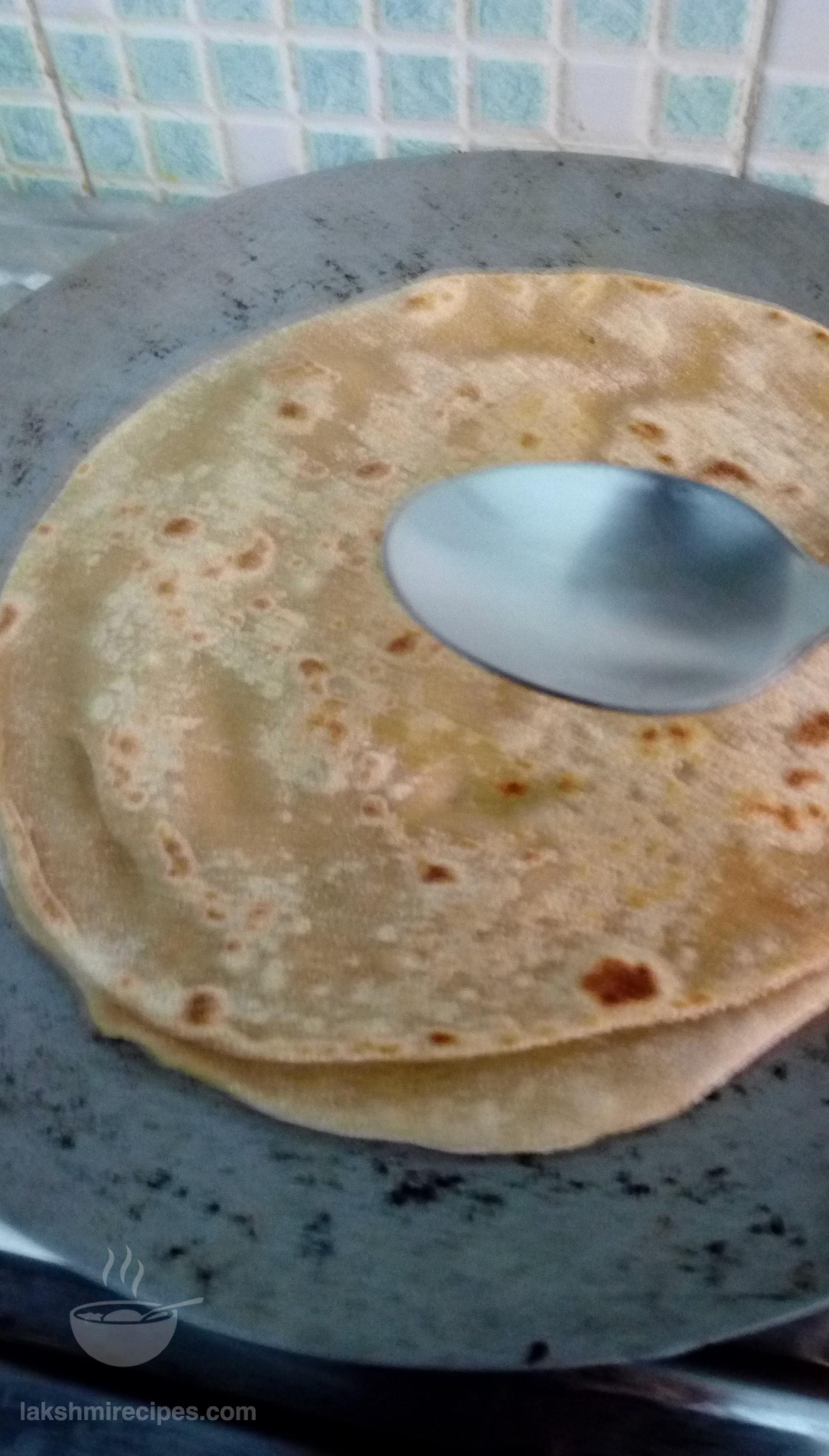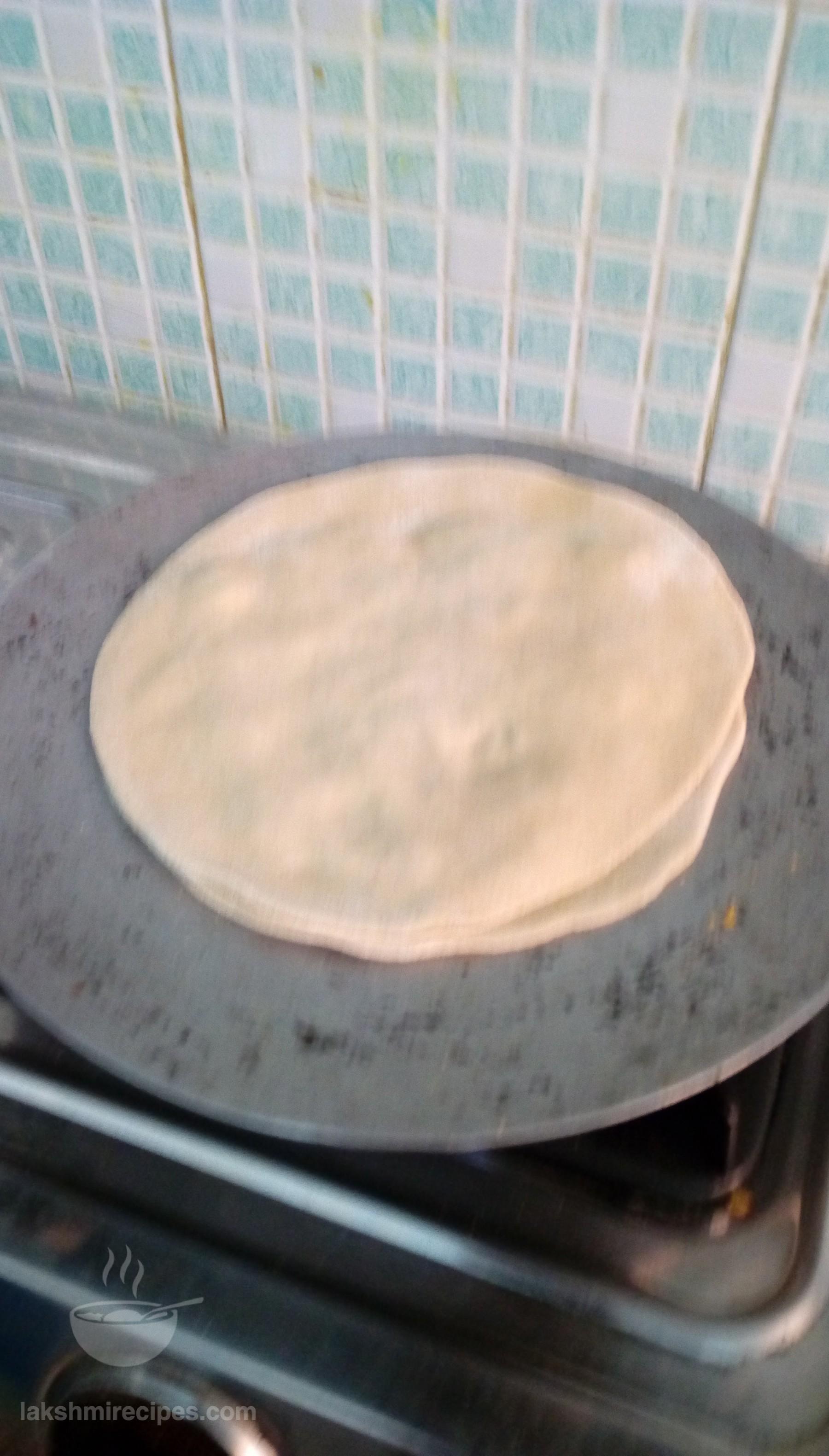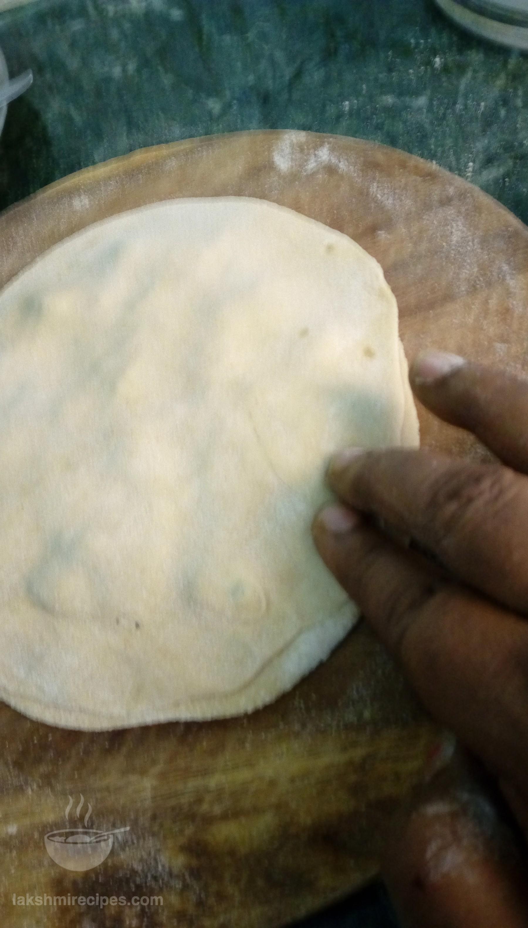- Prepare small balls of the dough. First roll two flat chapattis and keep aside in a plate.