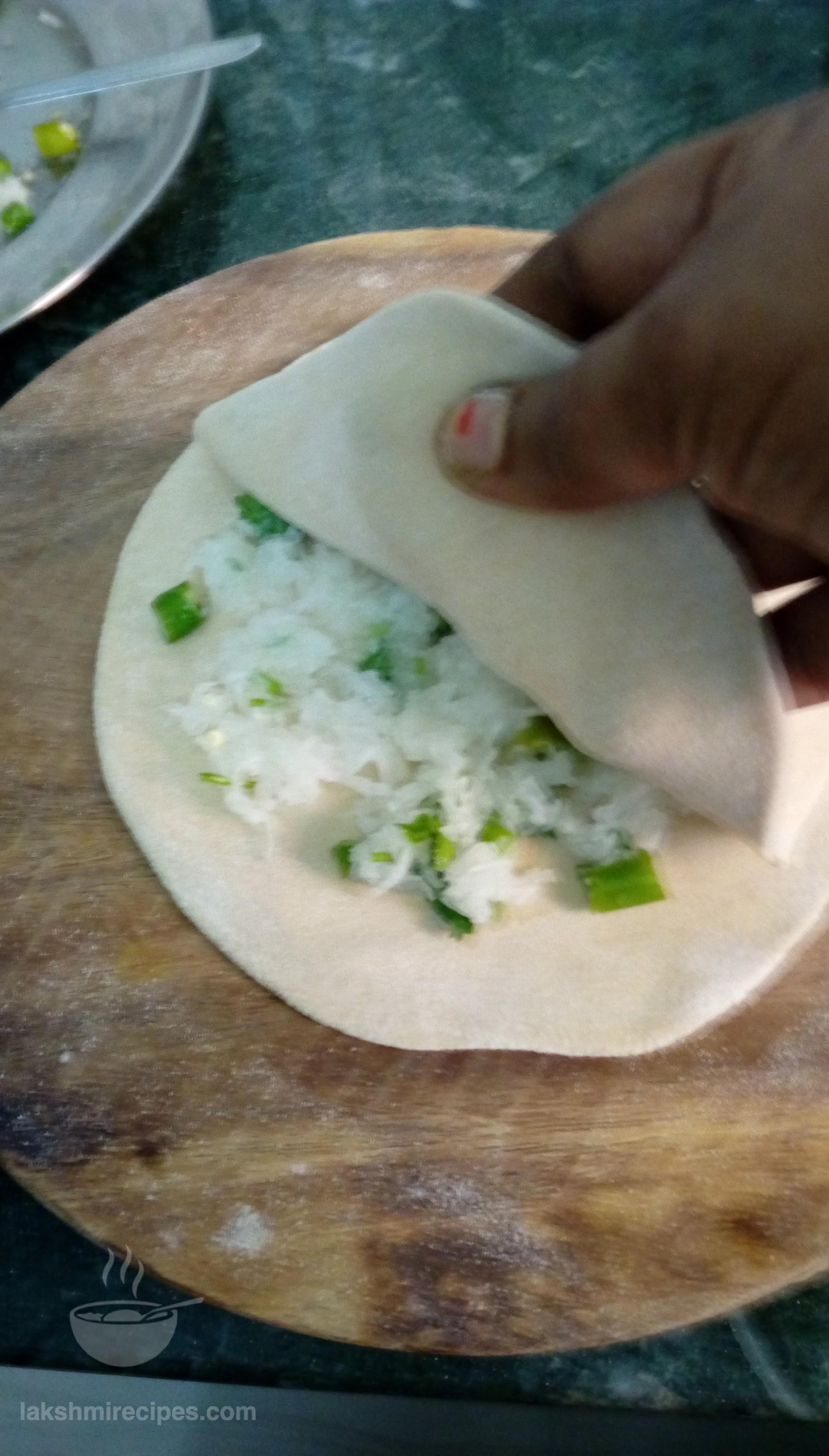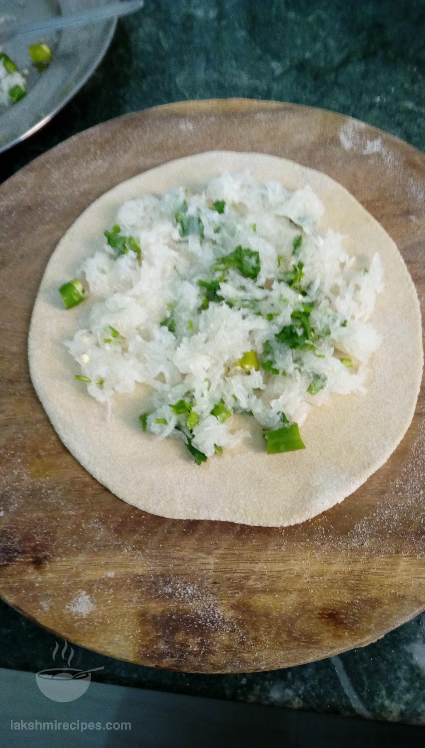- Now using a t-spoon, place enough raddish (mooli) mixture stuffing at the center of one chapatti and spread it evenly, leaving the edges.