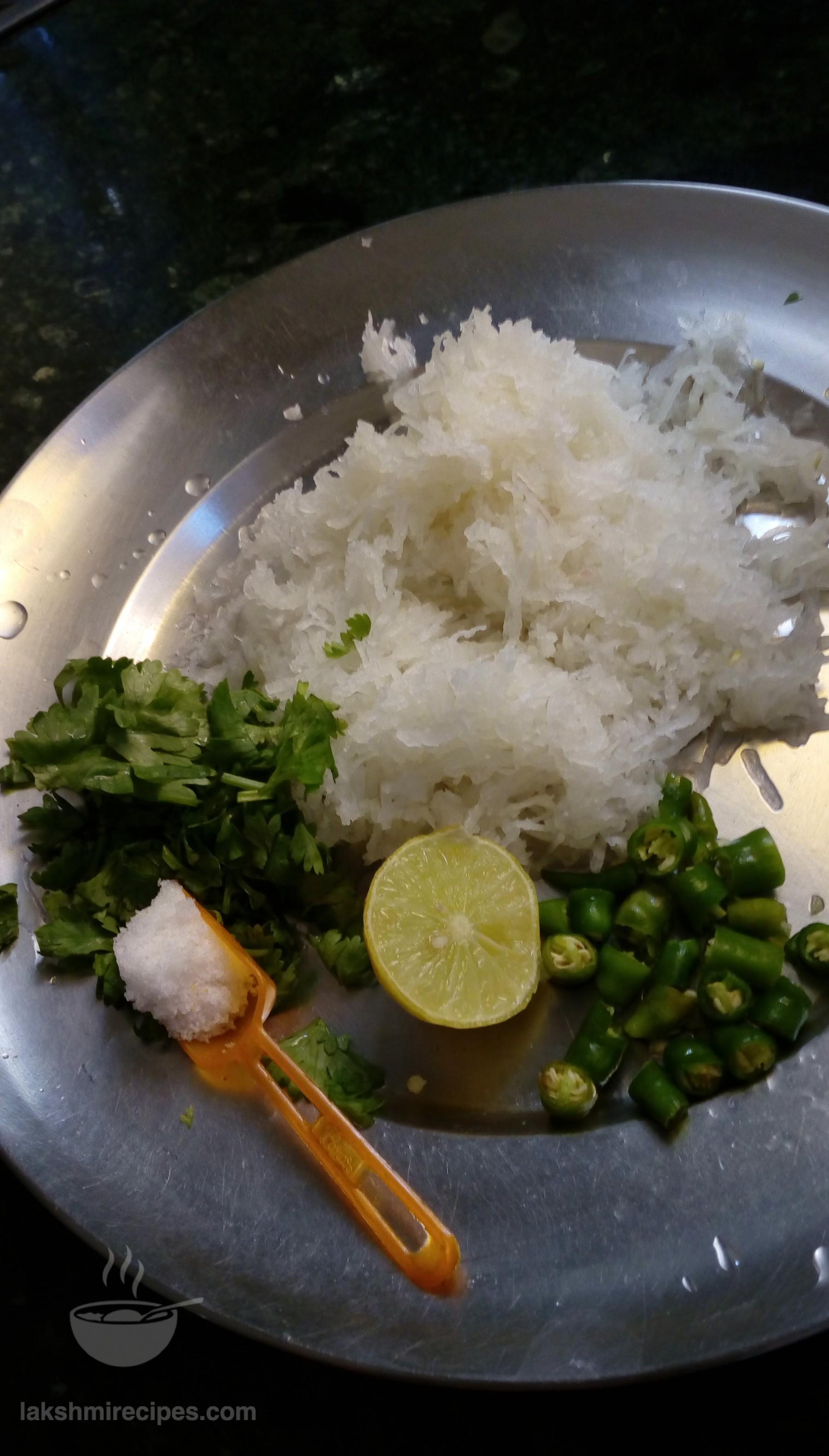 - Finely grate the raddish (mooli) in a plate. To it add the chopped coriander leaves (hara dhaniya patti) and chopped green chilli (hari mirch).