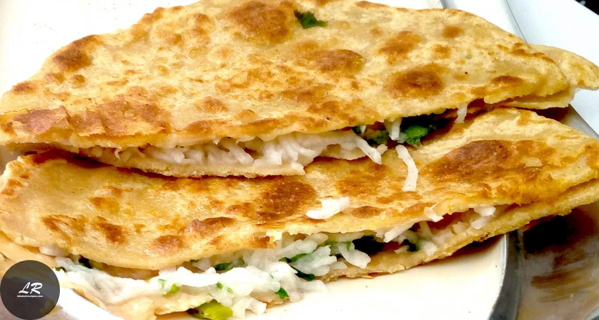 Mooli ka Paratha made from grated white raddish, spices and whole wheat flour make up a healthy breakfast item in Punjabi and Gujarati cuisines. These parathas prepared using the recipe below are very nutritious carrying a bundle of calcium and vitamins from the white raddish. They can be served with plain curd, chutney , curry or pickle.