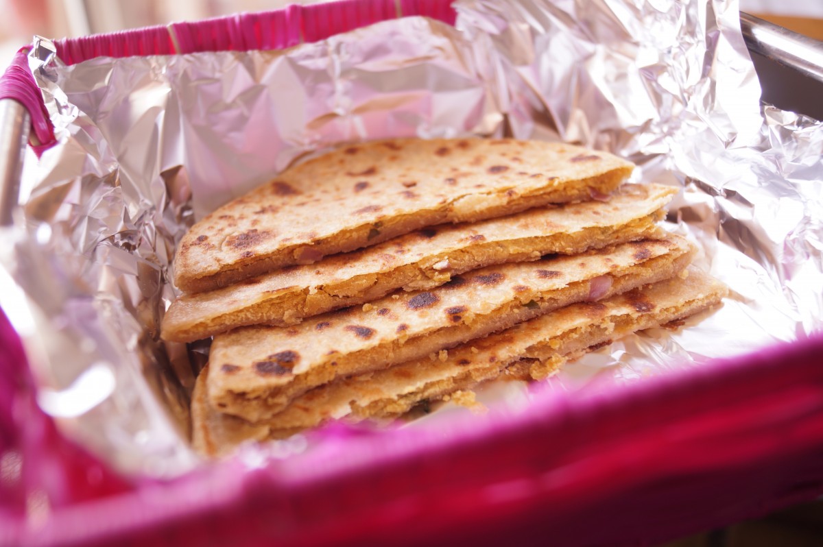 - Heat a tawa and grease it with ghee or refined oil. Lay the stuffed chapatis onto it and allow it to cook. Flip to other side and let it cook too. Apply ghee or oil on the top side flip and repeat the same step. Flip, press and cook both sides turn golden brown, on medium flame.