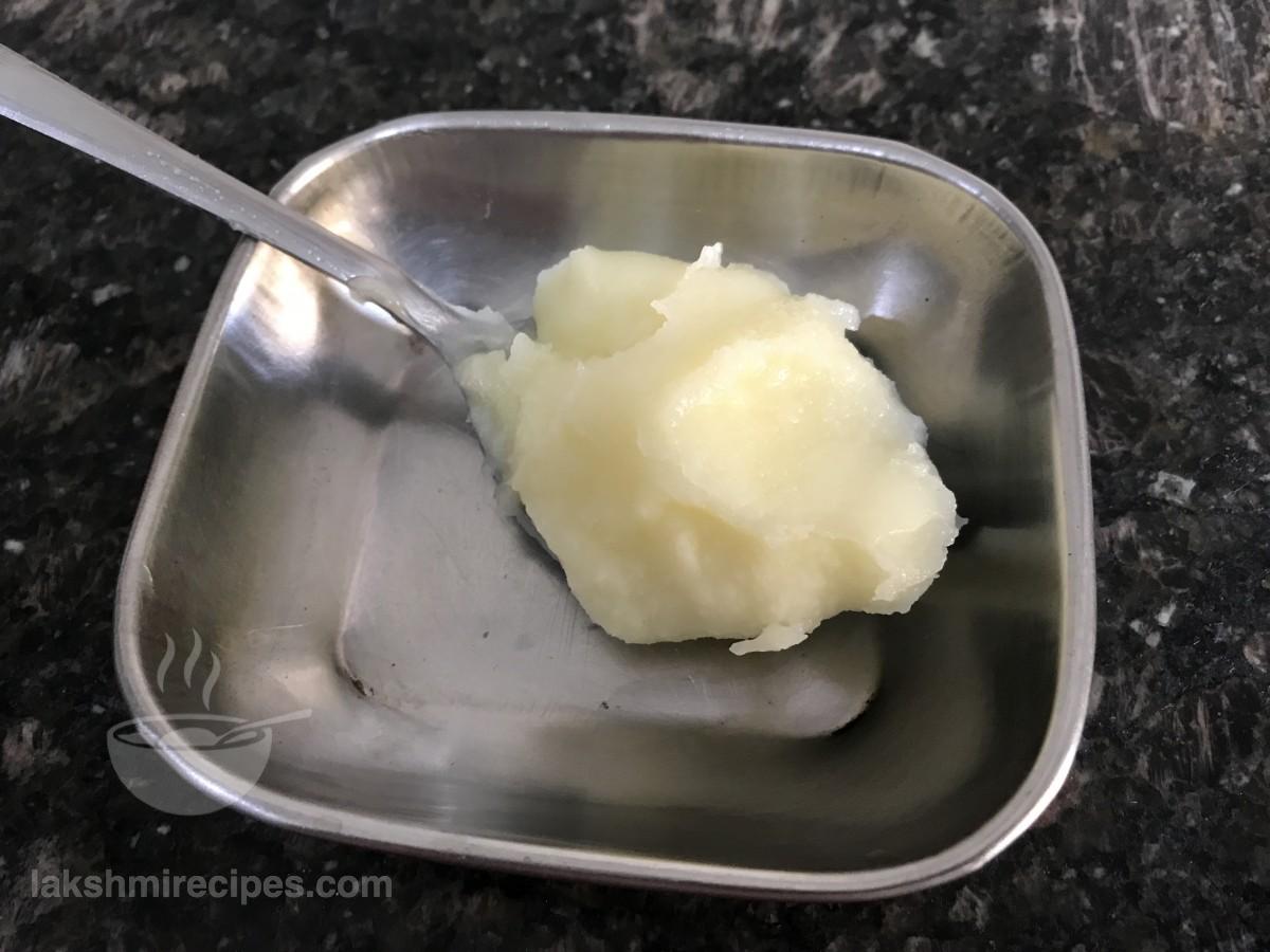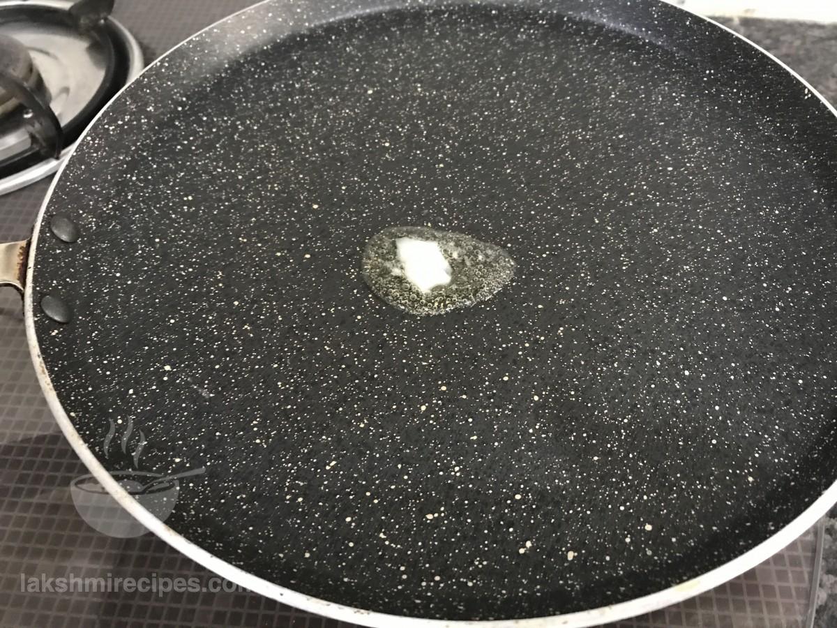 - अब, एक नॉन-स्टिक पैन गरम करें और इस पर 1 छोटी चम्मच शूद्घ घी डालकर फैलाएं।