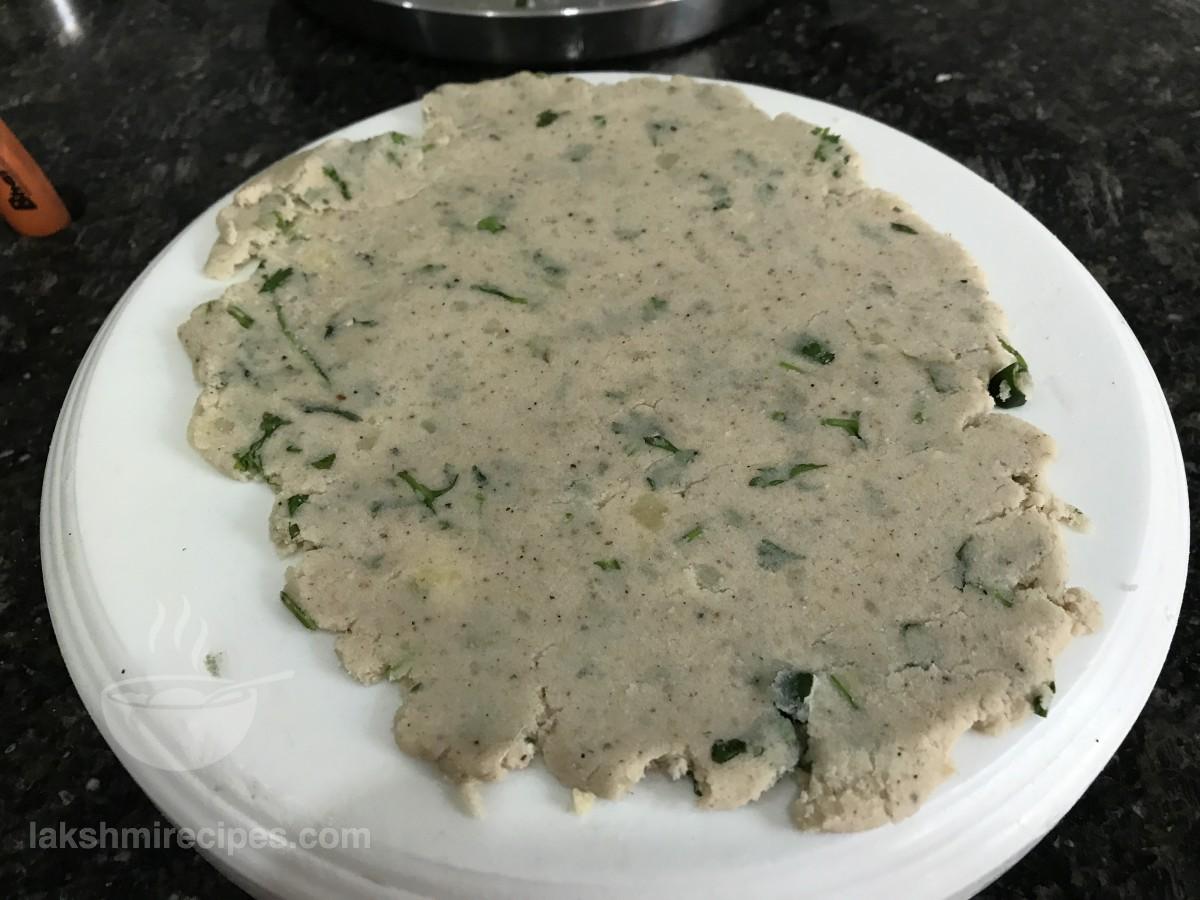 - Press it slightly with your hands and then roll it to make it flat and round like roti with a rolling pin. It should be only a little thicker than the chapati rolled out from whole wheat flour.
