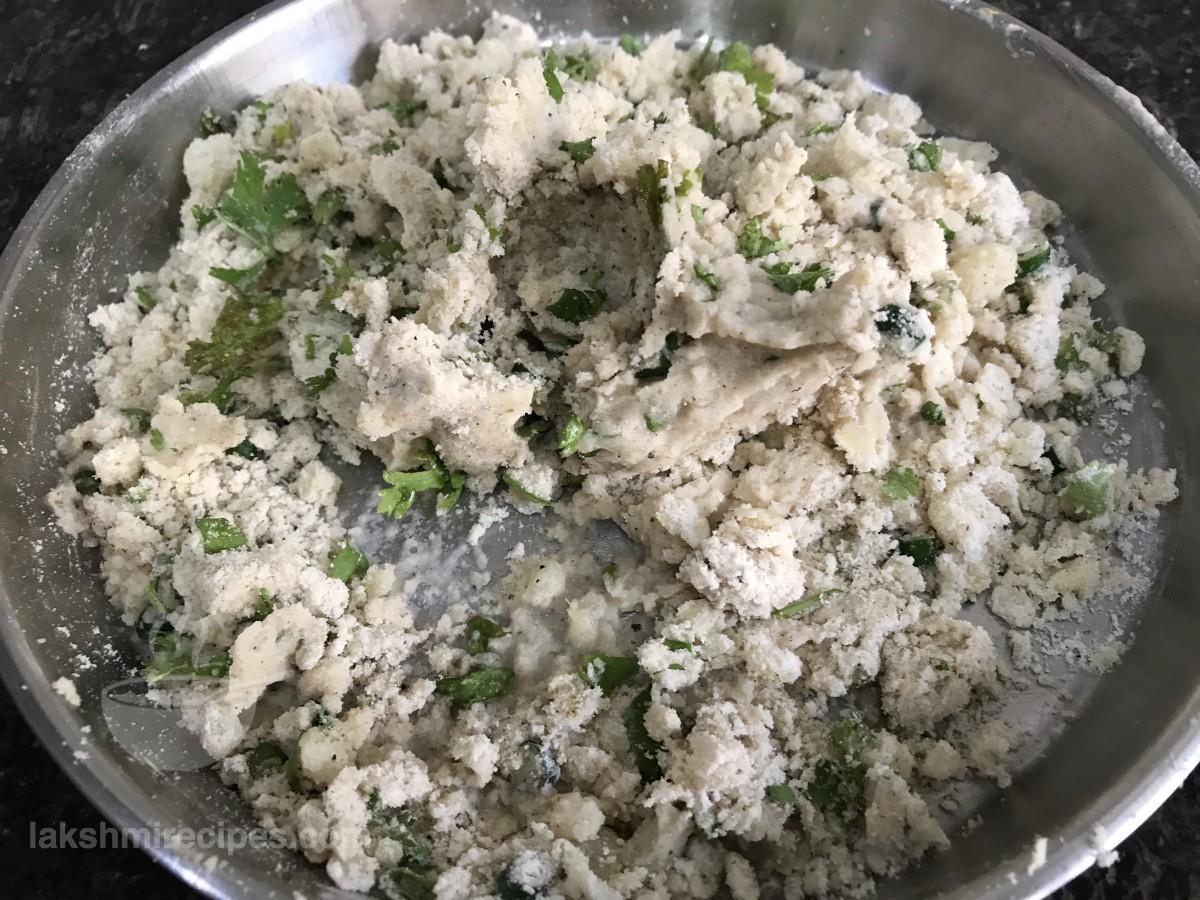 - फिर उसमें में सिंघाड़े का आटा, हरी मिर्च, धनिया पत्ती, जीरा पाउडर, काली मिर्च पाउडर और सेंधा नमक डालें।