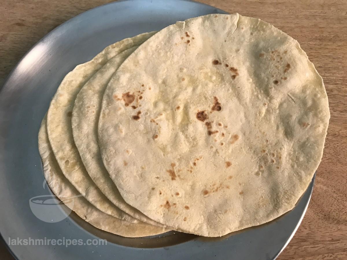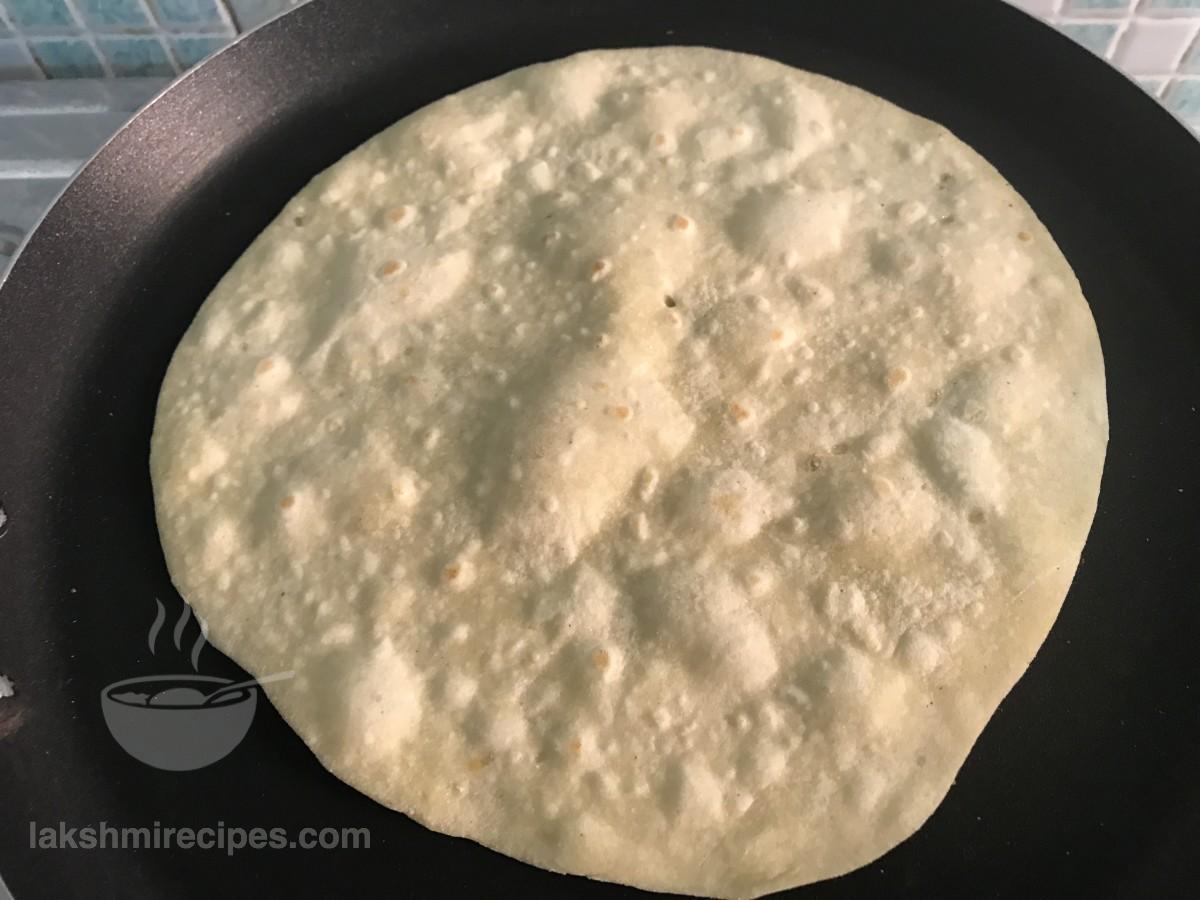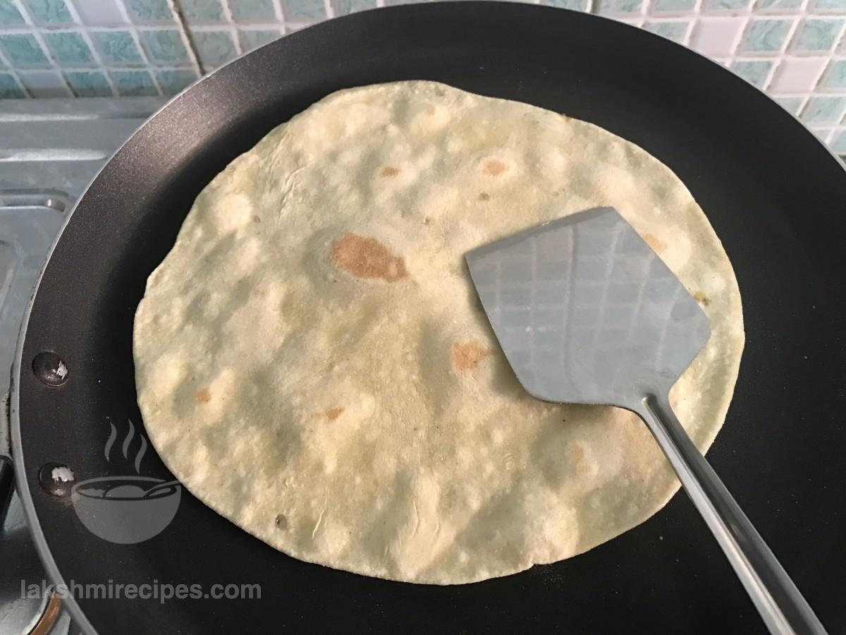- When one side gets cooked flip to cook the other side in the same manner. Flip and cook until light brown colored spots appear on either sides. Then remove it from the tawa and prepare other tortilla sheets in the same way. Tortilla sheet are made like the Indian chapatis, except the ingredients used are different. Place the prepared tortilla sheets in contaier covered with cloth so that they remain soft. (These tortilla sheets can be used for making tortilla rolls, quesadilla and burrito.)
