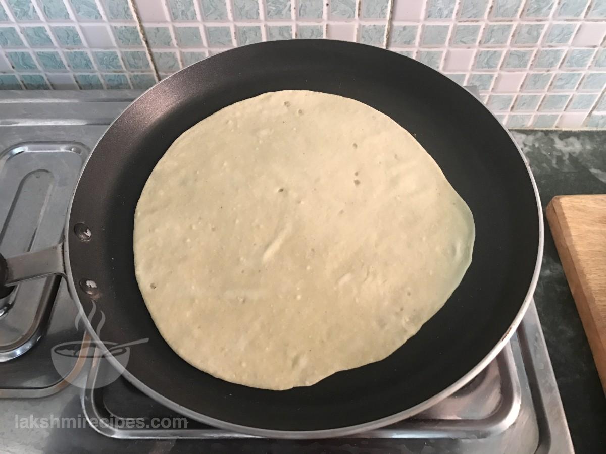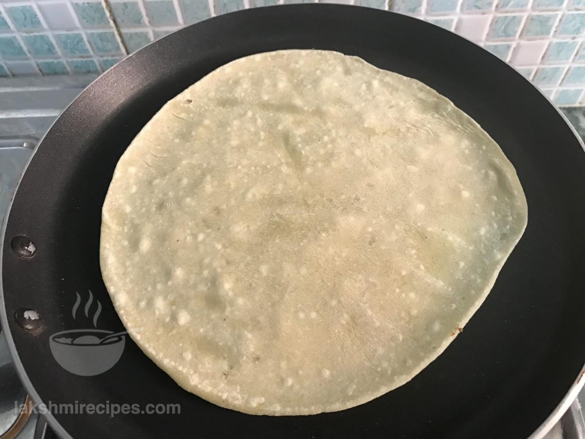 - Now heat a tawa, lower the flame to medium level and place the raw tortilla sheet over it. Take a clean kitchen cloth and fold it to use it to press the raw tortilla sheet, so that it gets cooked uniformly and swells.