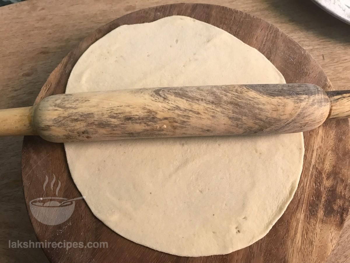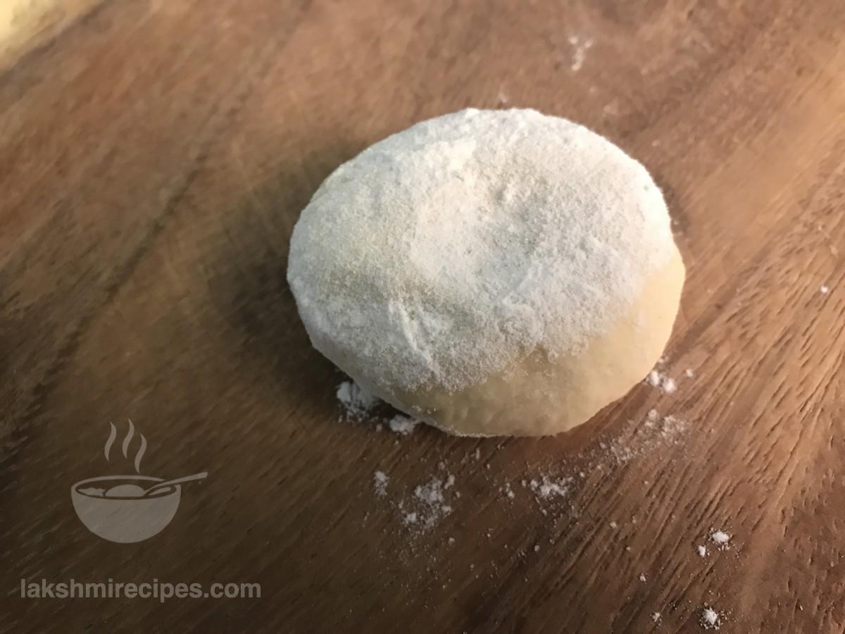 - Then prepare small and equal sized balls of the dough. Take one ball and roll it until smooth. Then press it to form a peda or tikki and dust it with some dry all purpose flour. Now roll the peda or tikki into a flat, thin and even sheet like chapati. Remember to roll the tortilla sheet as thin as possible.