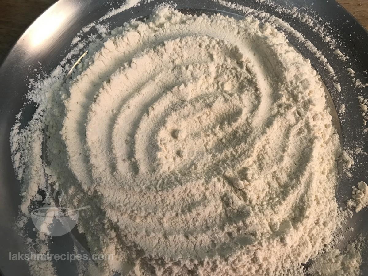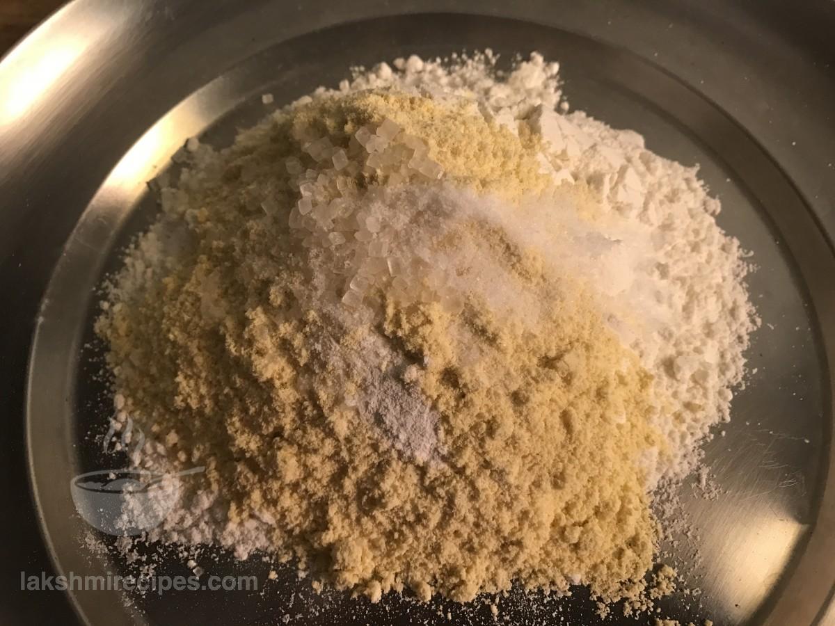 - Take all prupose flour, corn flour, baking powder, salt and sugar in a big mixing plate or mixing bowl. Mix the dry ingredients well. (You may add refined oil to make the dough. Here we have not used refined oil to make the dough.)