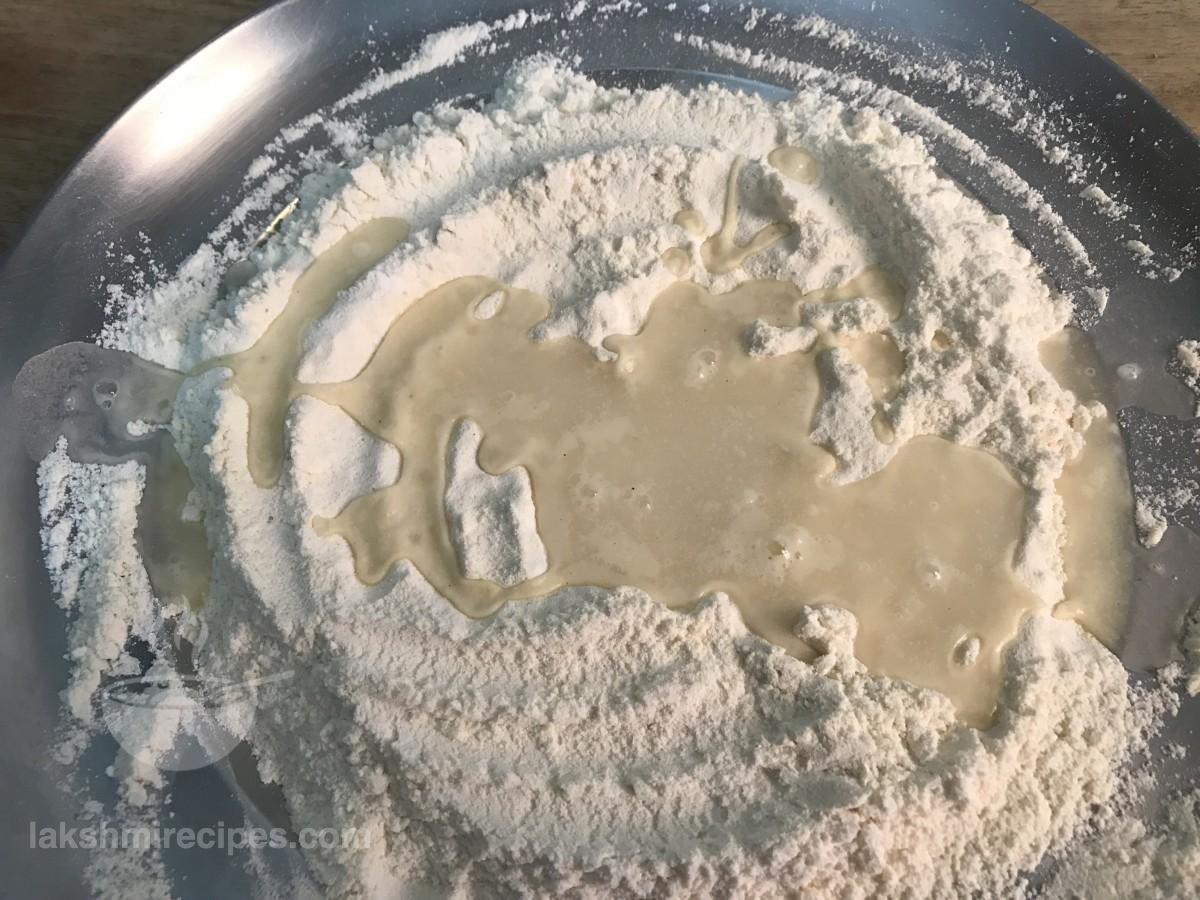 - Now add water slowly to the dry mixture and start kneading a medium soft dough (the dough should be soft as the dough made for normal chapati).
