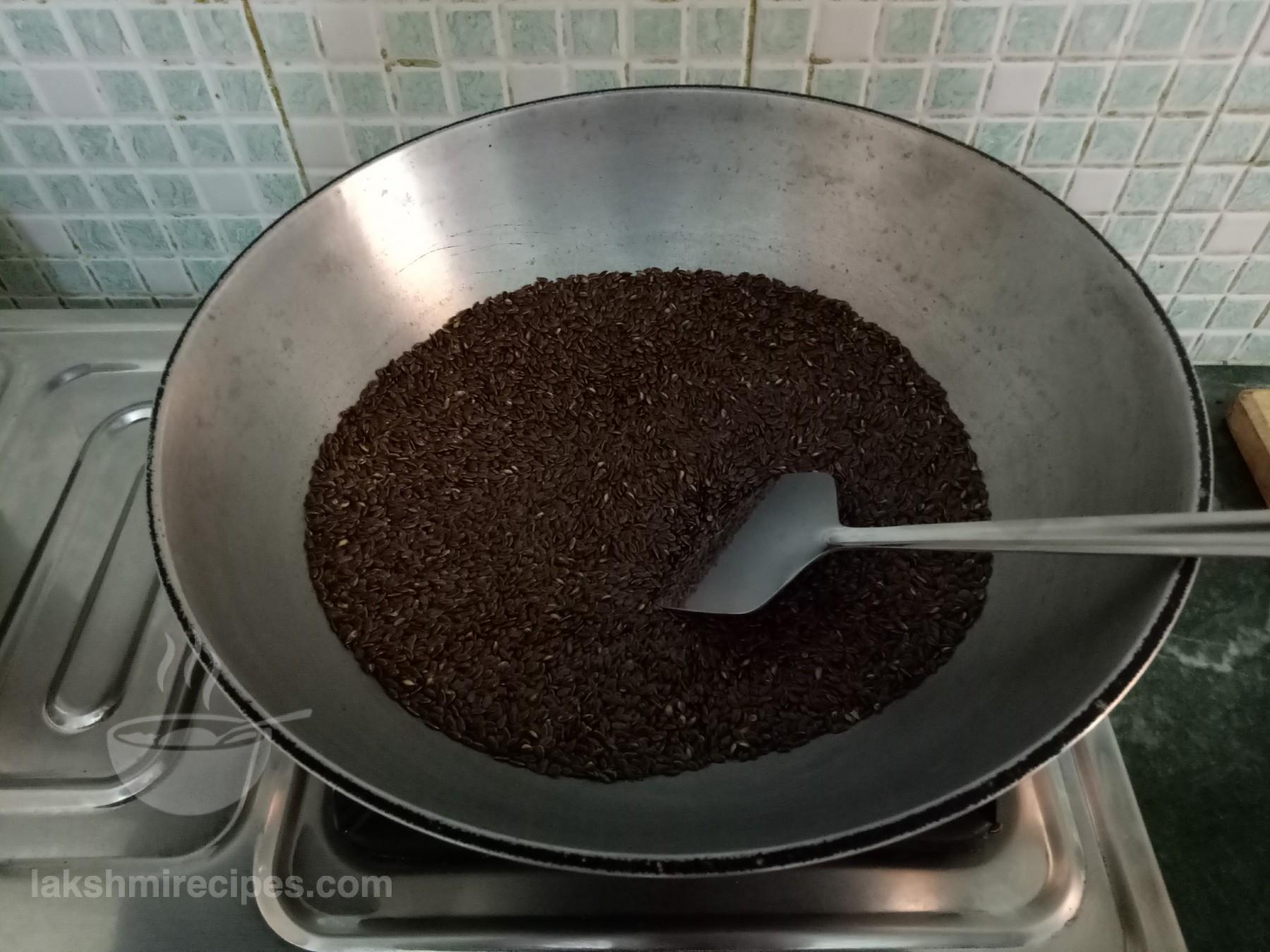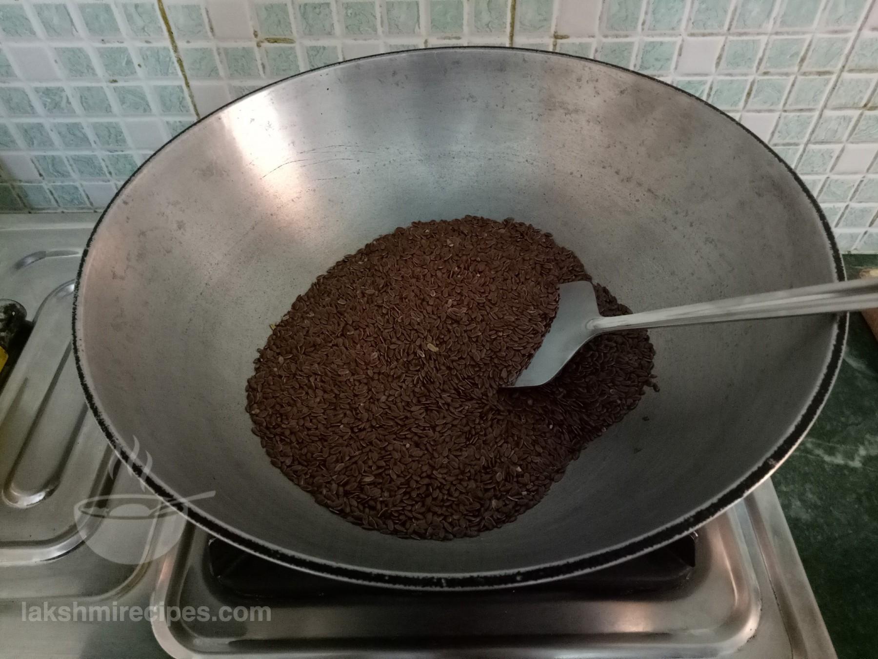 - The flax seeds or linseeds (alasi or teesi) will begin to crackle as they roast. Now lower the flame and stir to roast the seeds for 5 more minutes. (Do not over roast the seeds otherwise they will taste bitter)