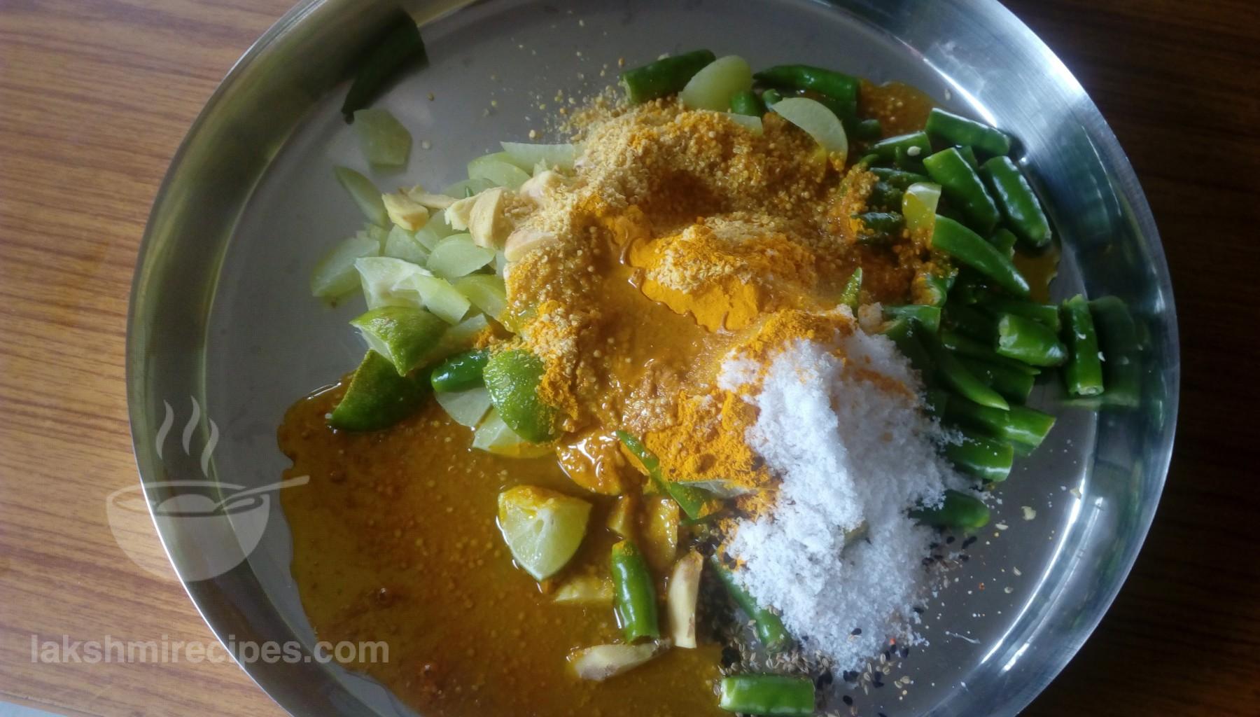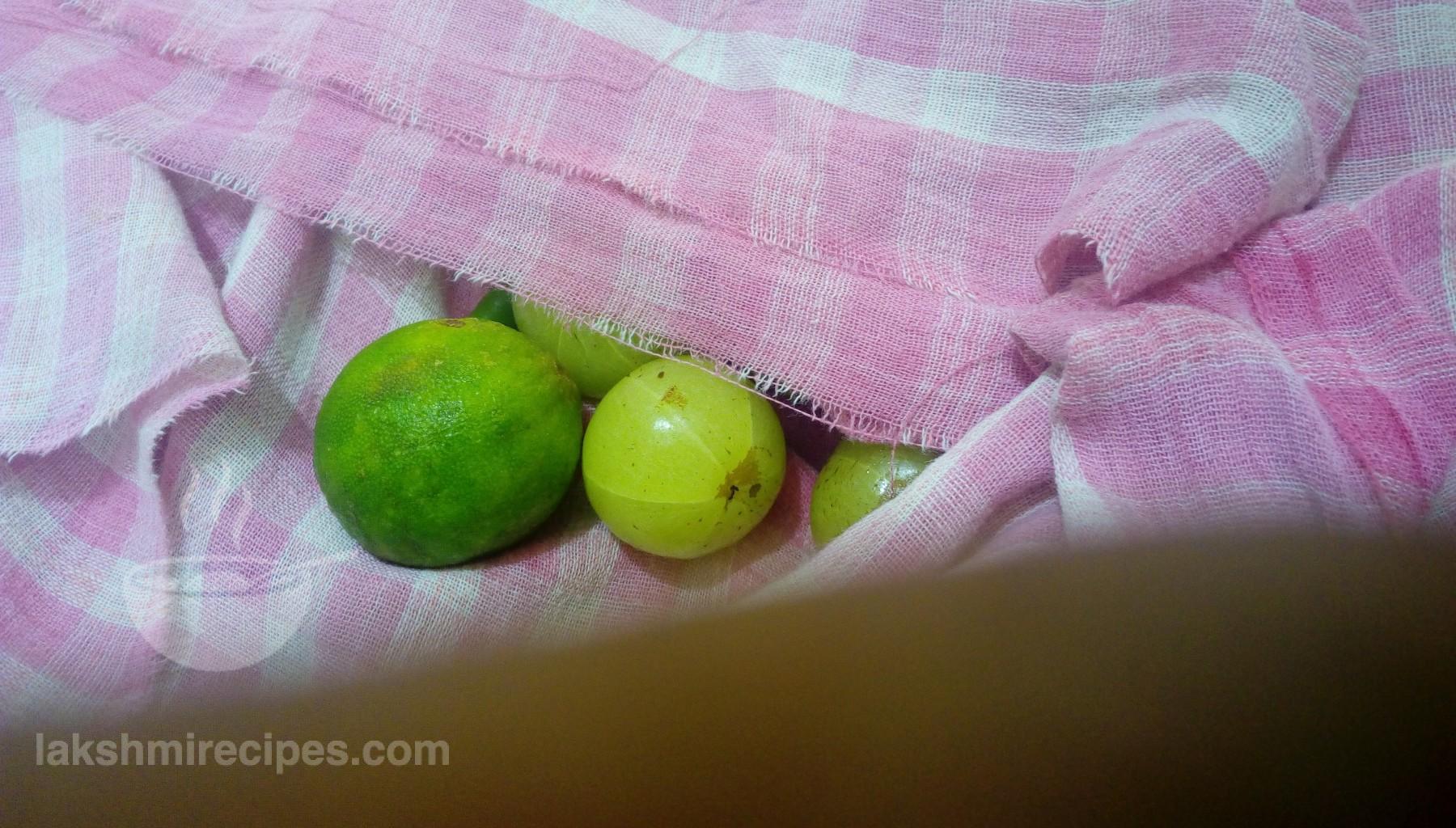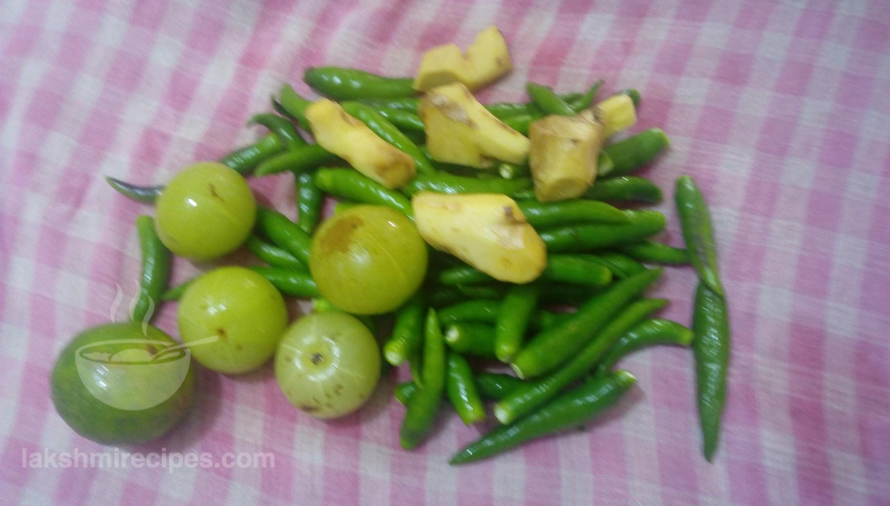 - Wash the green chillis (hari mirch), lemon (nimbu), ginger (adrak) and Indian gooseberries (amla) well with water and pat them dry with a cloth to wipe out the moisture. Then keep all these ingredients in the sunlight for 1 hour so that all the moisture evaporates.