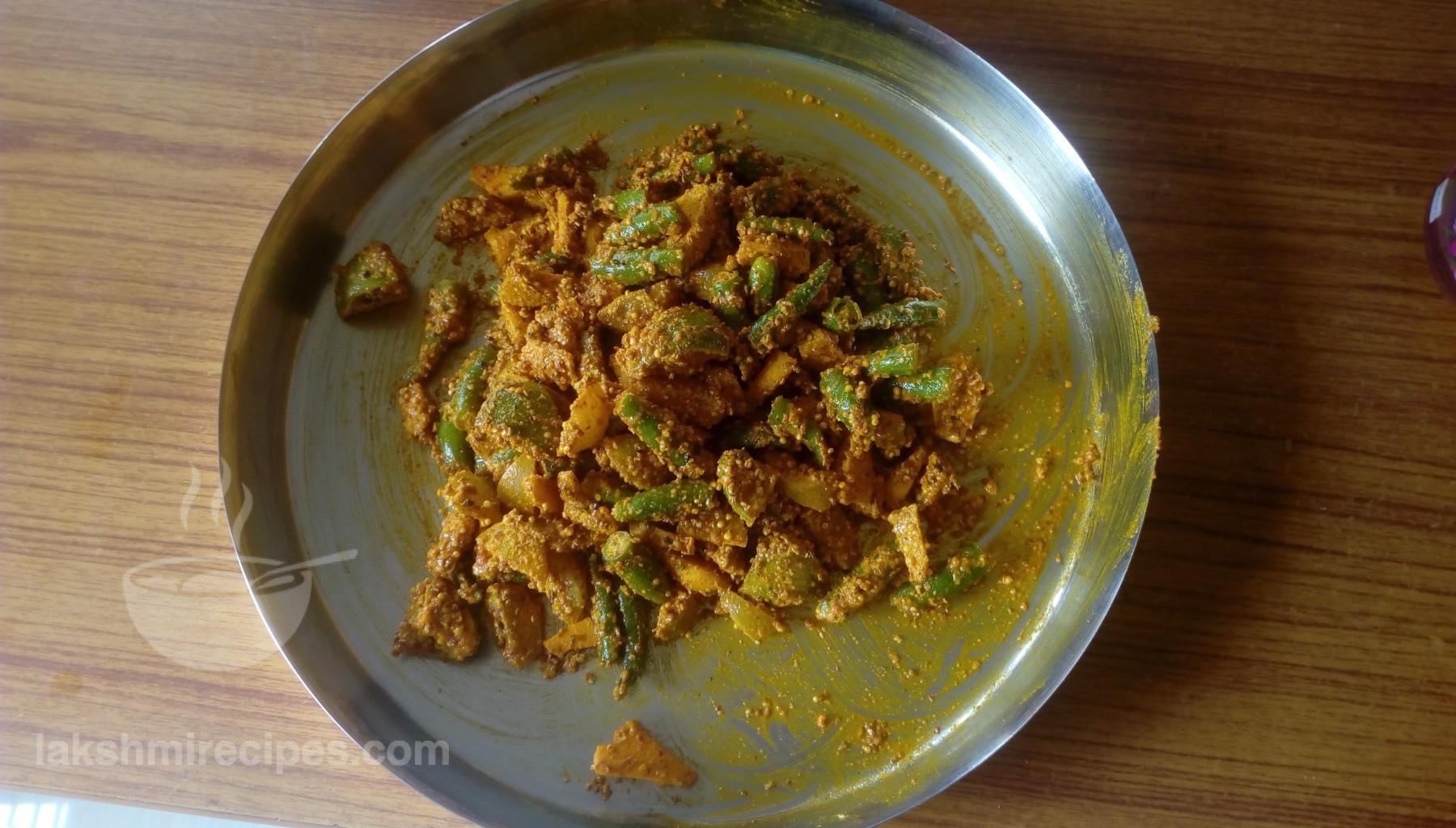 - Transfer all ingredients to a clean and dry plate and add turmeric powder (haldi powder), salt and mustard seeds powder (sarson dana ka powder) to it. Mix well with hands. (Add a little more salt, than required for taste as it is needed for achaar preparation and later gets balanced with the taste of the ingredients. Similarly turmeric powder (haldi powder) and mustard seeds powder (sarson dana ka powder) is added a little more than required because they help in keeping the achaar in good condition for a long period of time.